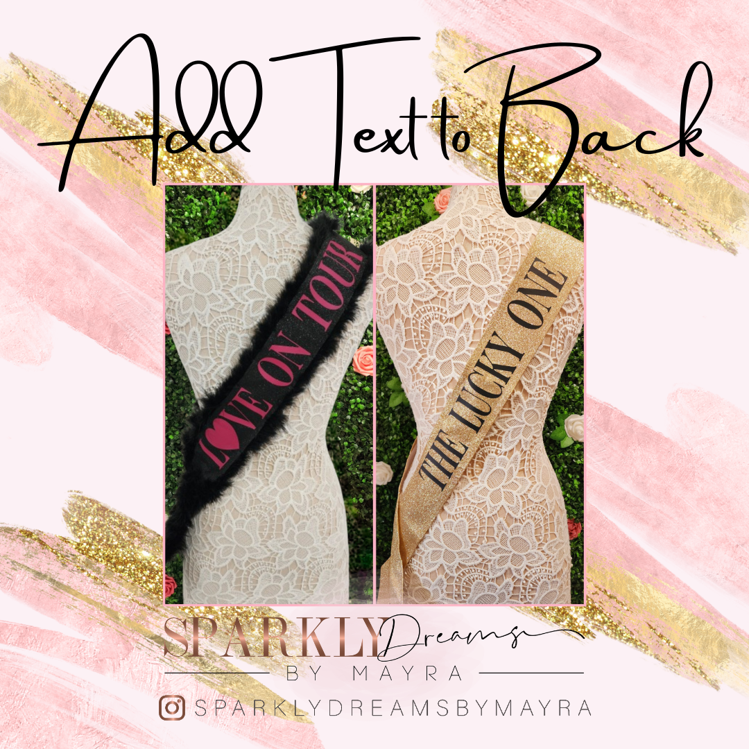 Add an extra personal touch with custom text on the back of your sash! This option is perfect for including a name, date, hashtag, or special message in addition to the front design. Great for photos and making your sash even more unique!