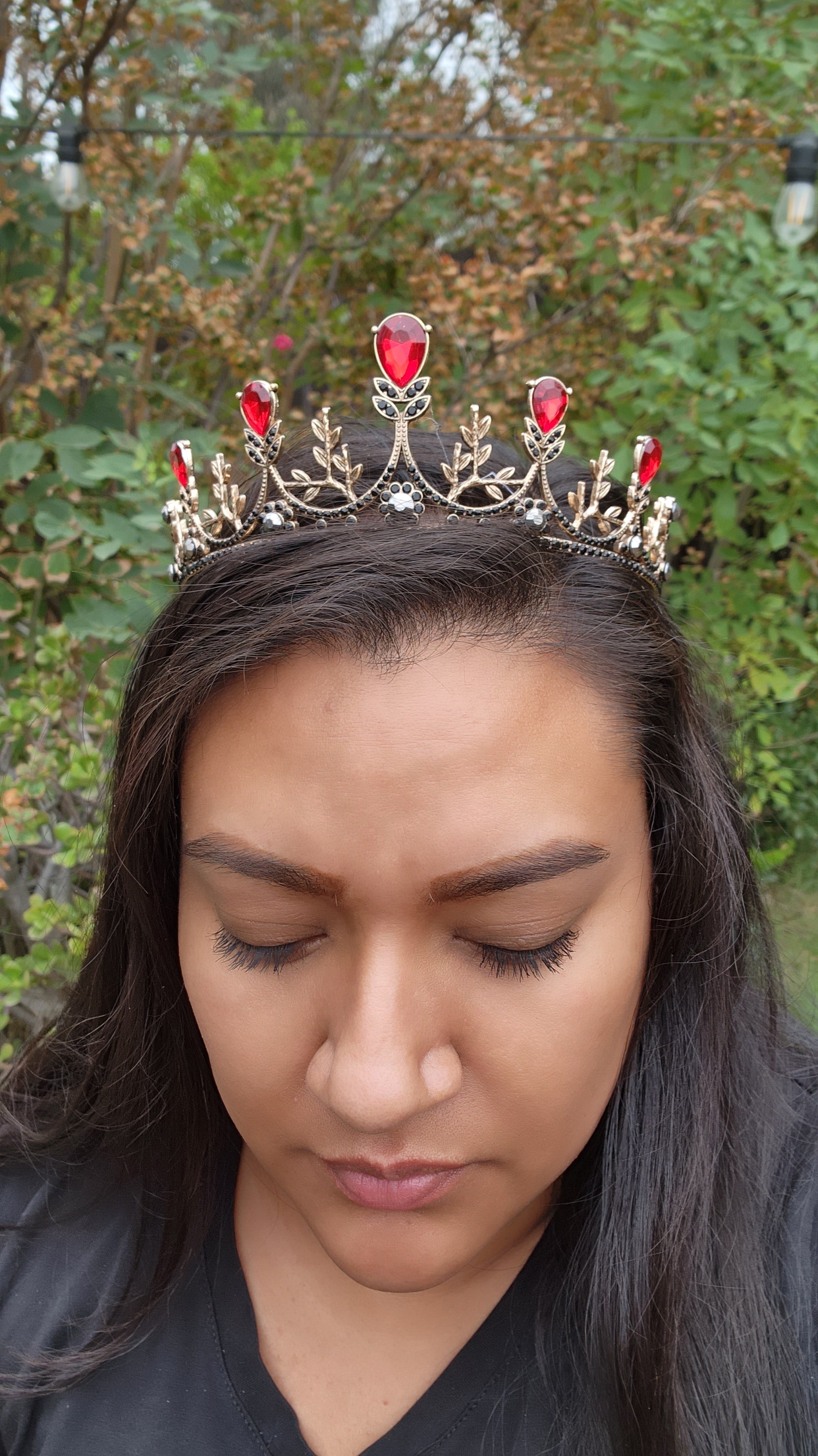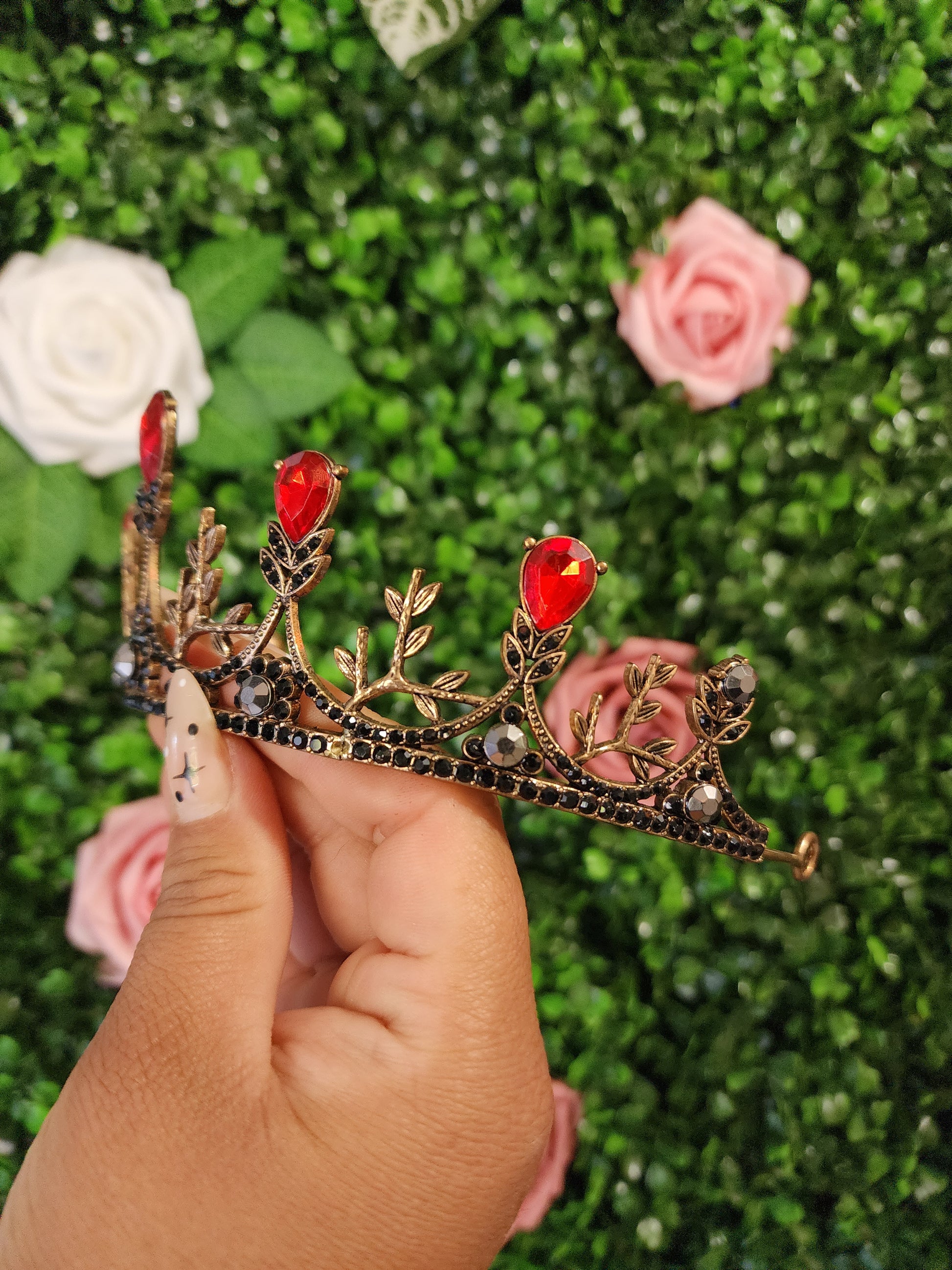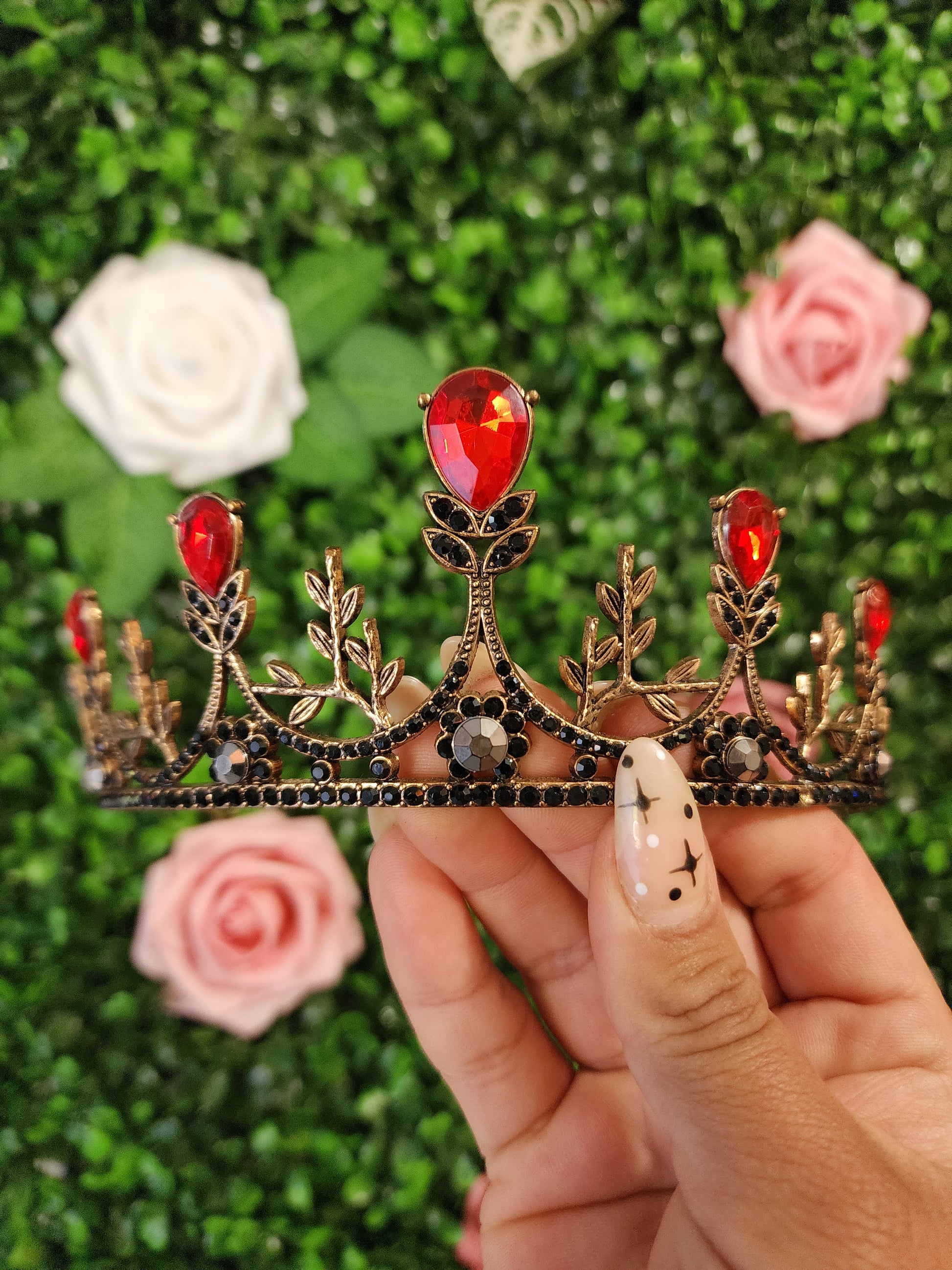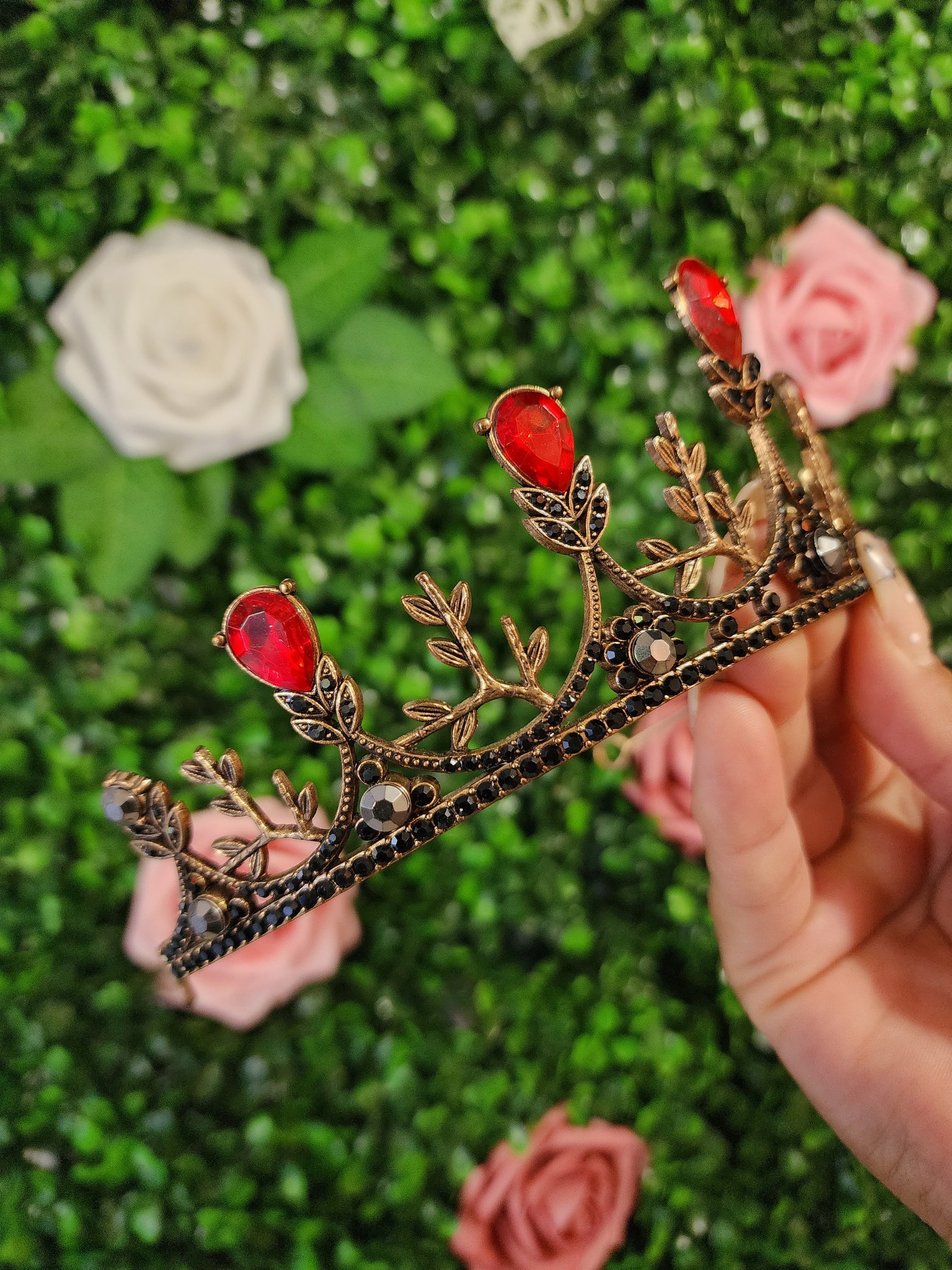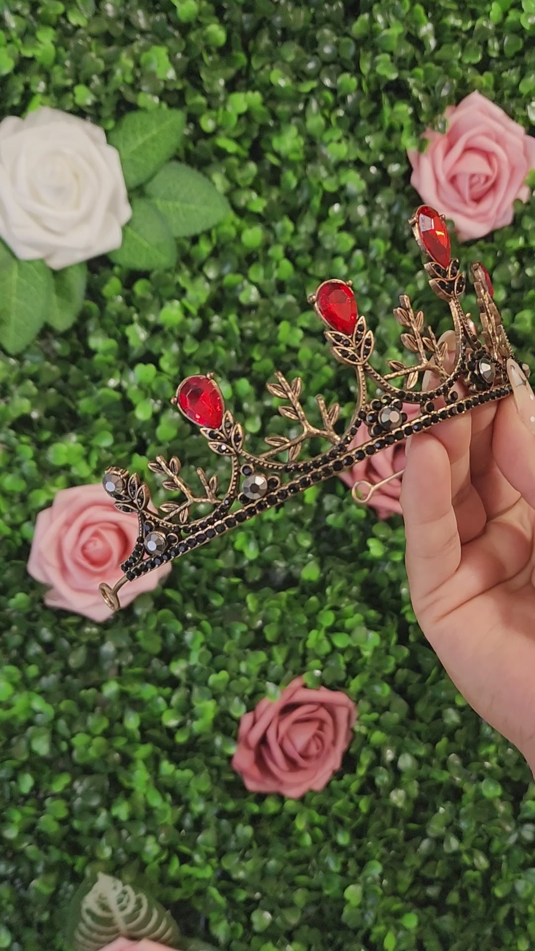 This glamorous gold tiara is fit for a princess! Embellished with dazzling black and red rhinestones, this tiara will add a sparkle to any special occasion. Perfect for a bride, bridesmaids, princess parties, quinceañeras, and more, this tiara will be a beautiful addition to any look.