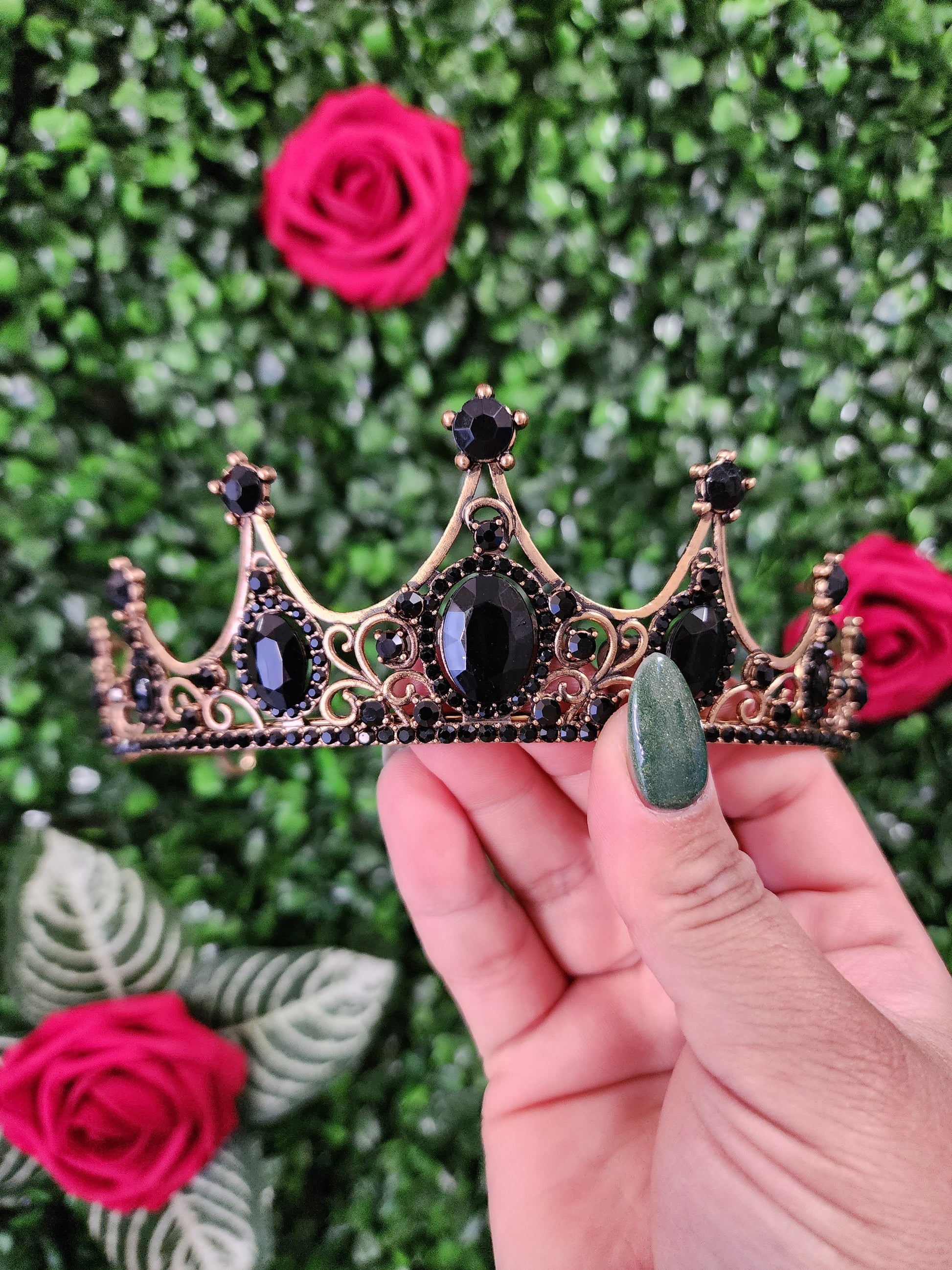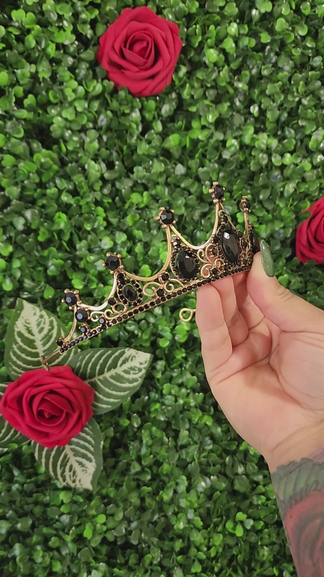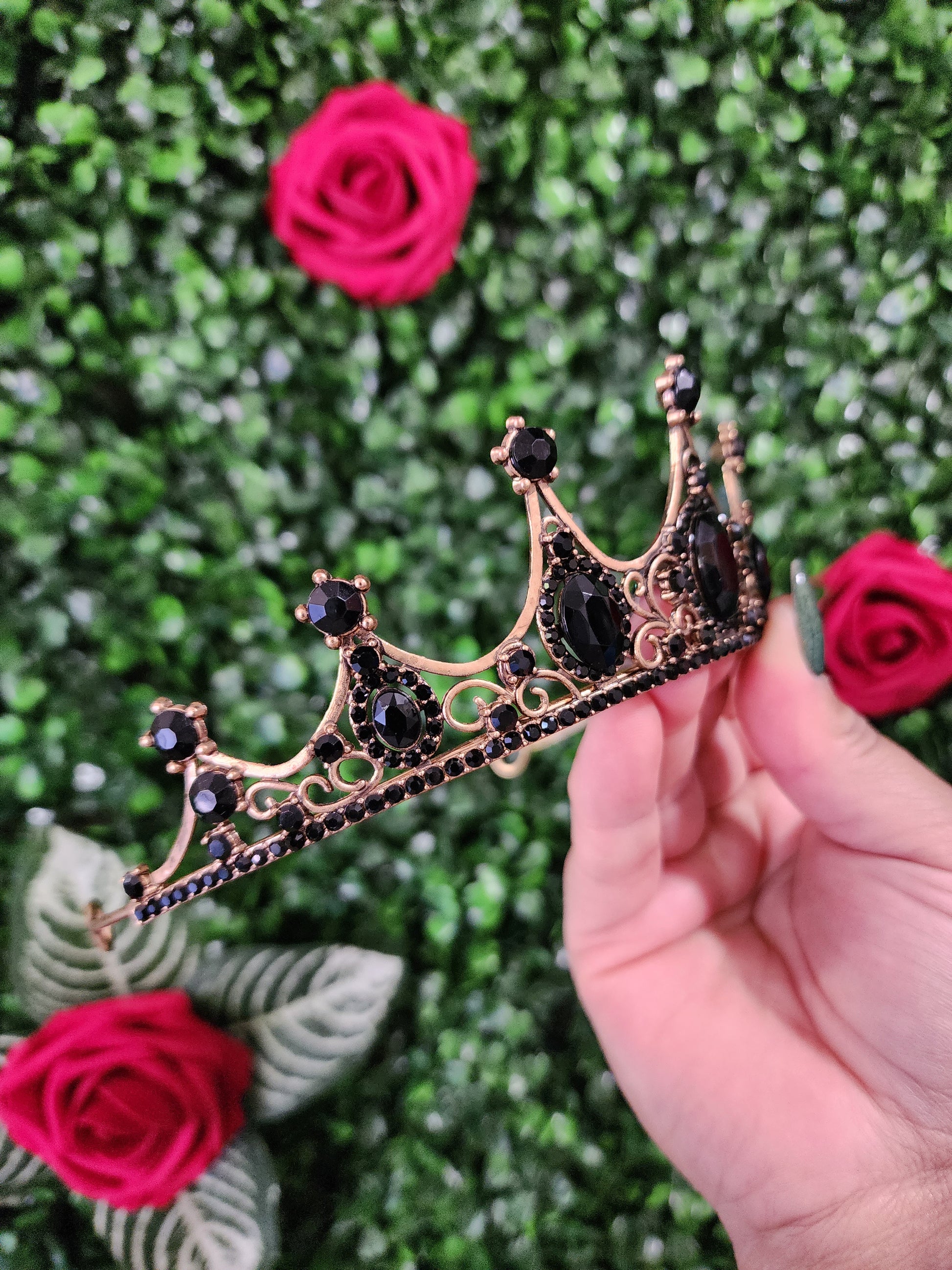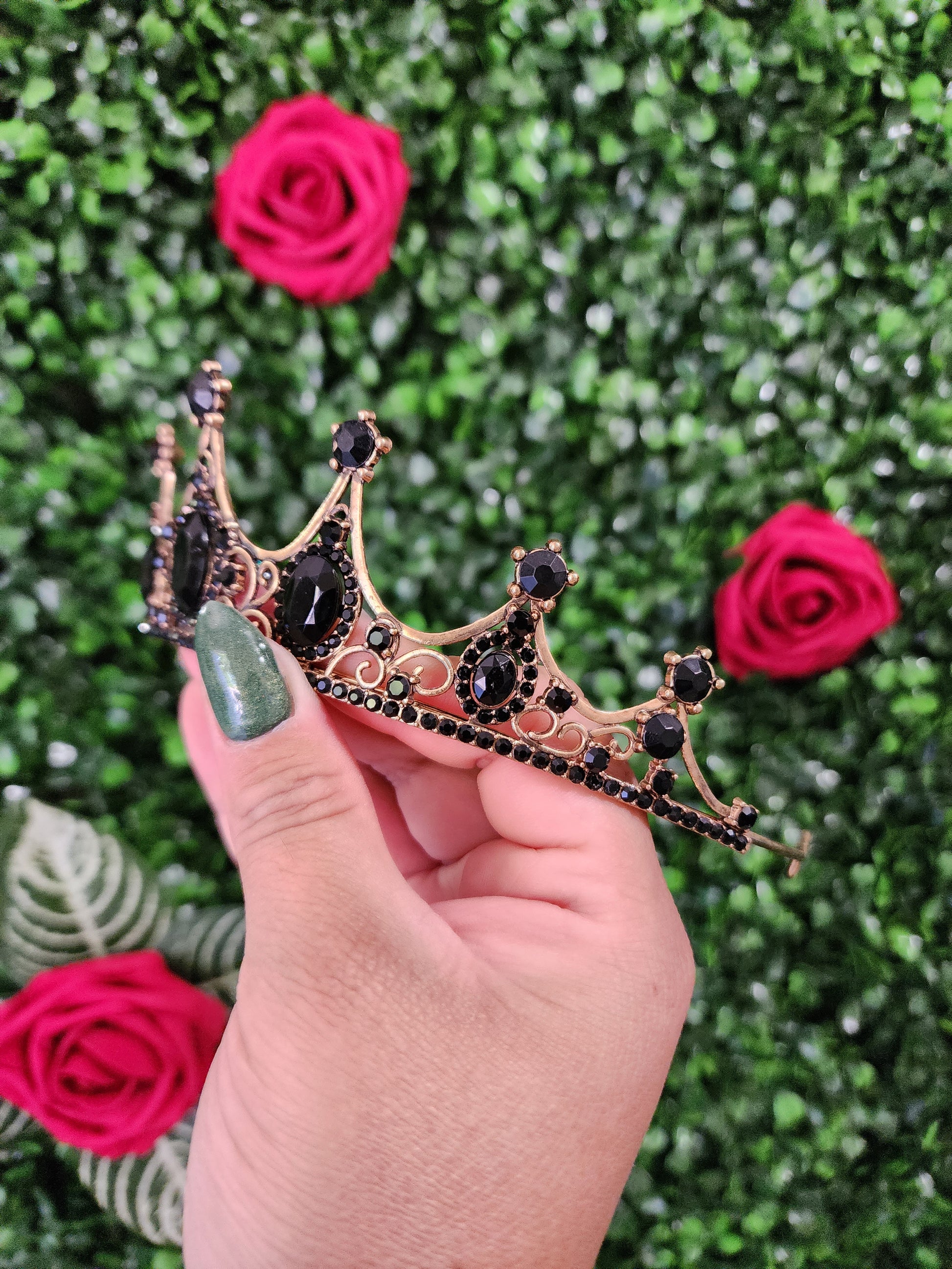 This stunning bronze tiara is adorned with black rhinestones, giving it an eye-catching and unique look. The intricate detail of the bronze metalwork is both elegant and intricate, creating an exquisite piece of headwear that is sure to be a showstopper.