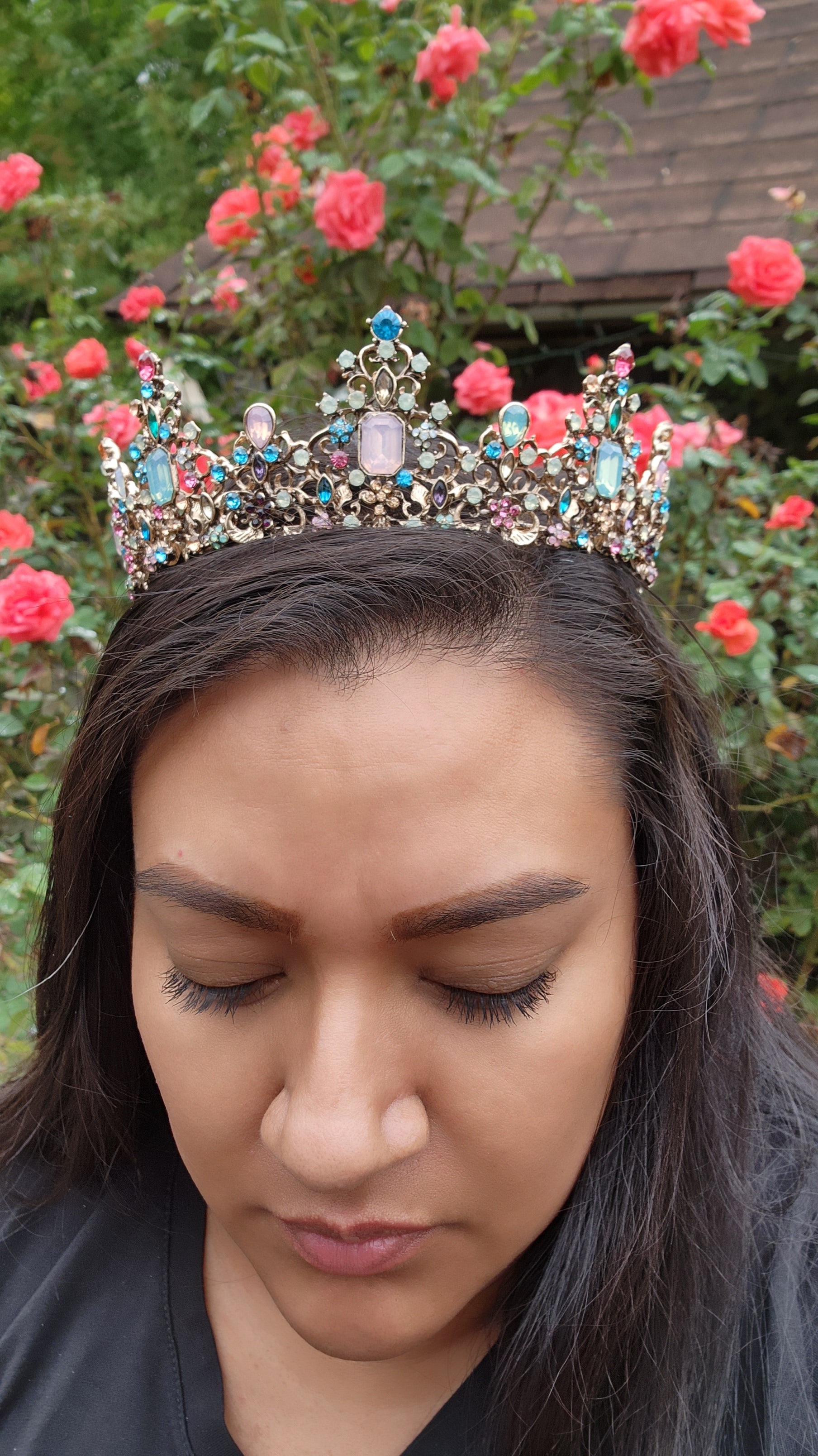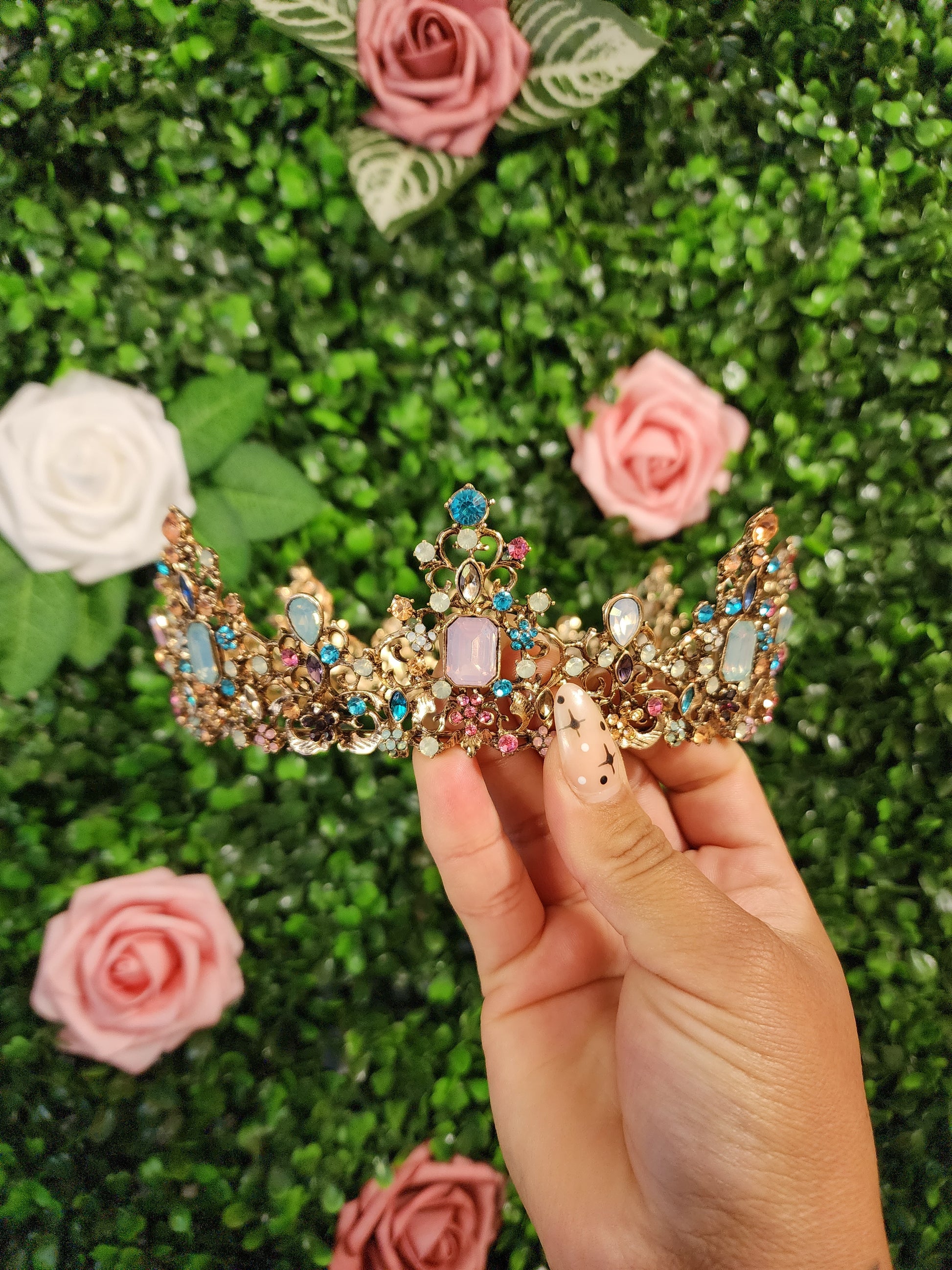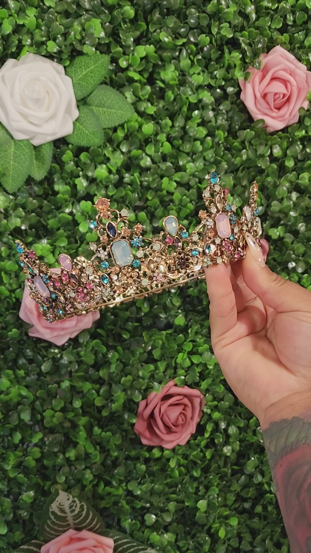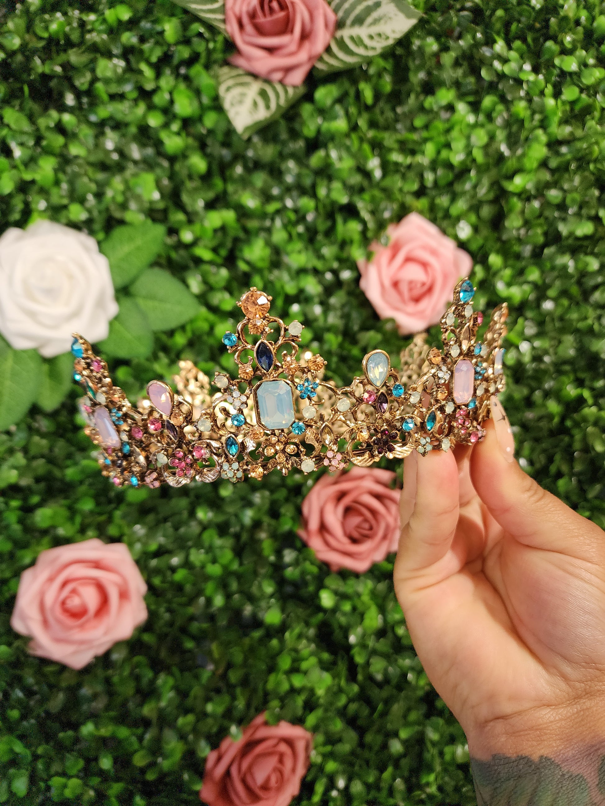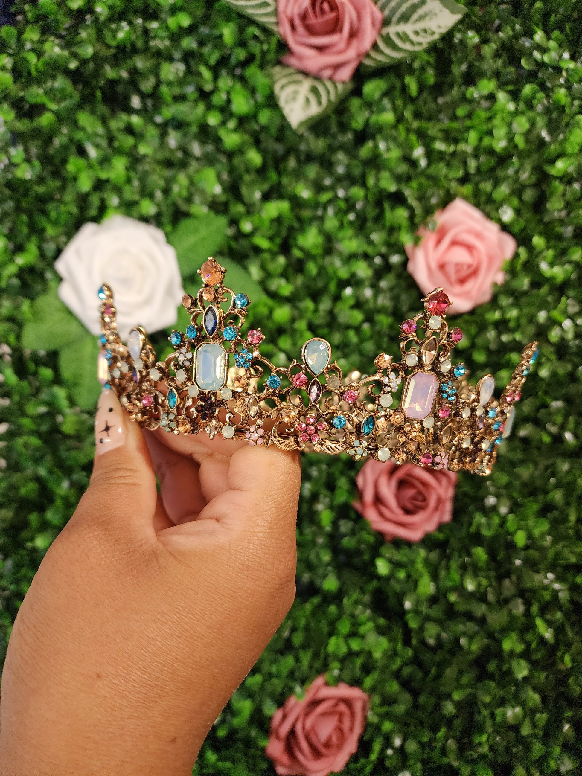 A bronze and multicolored crown is a majestic and uniquely crafted headpiece that combines the rich, earthy tones of bronze with a dazzling array of multicolored elements. The base of the crown is casted in lustrous bronze, giving it a regal and antique appearance .Adorning the bronze framework are a variety of multicolored rhinestones, creating a striking visual contrast against the bronze base.