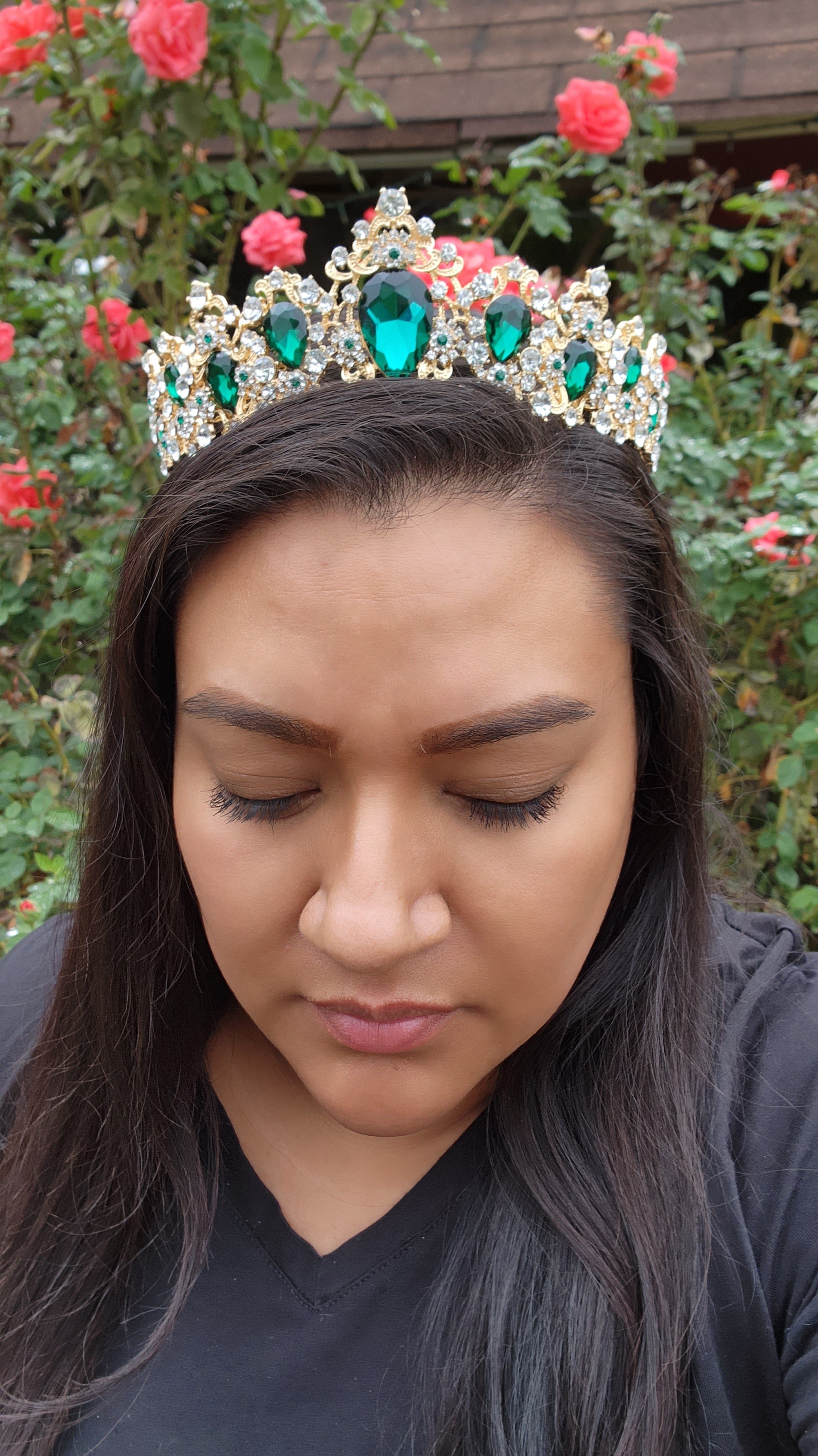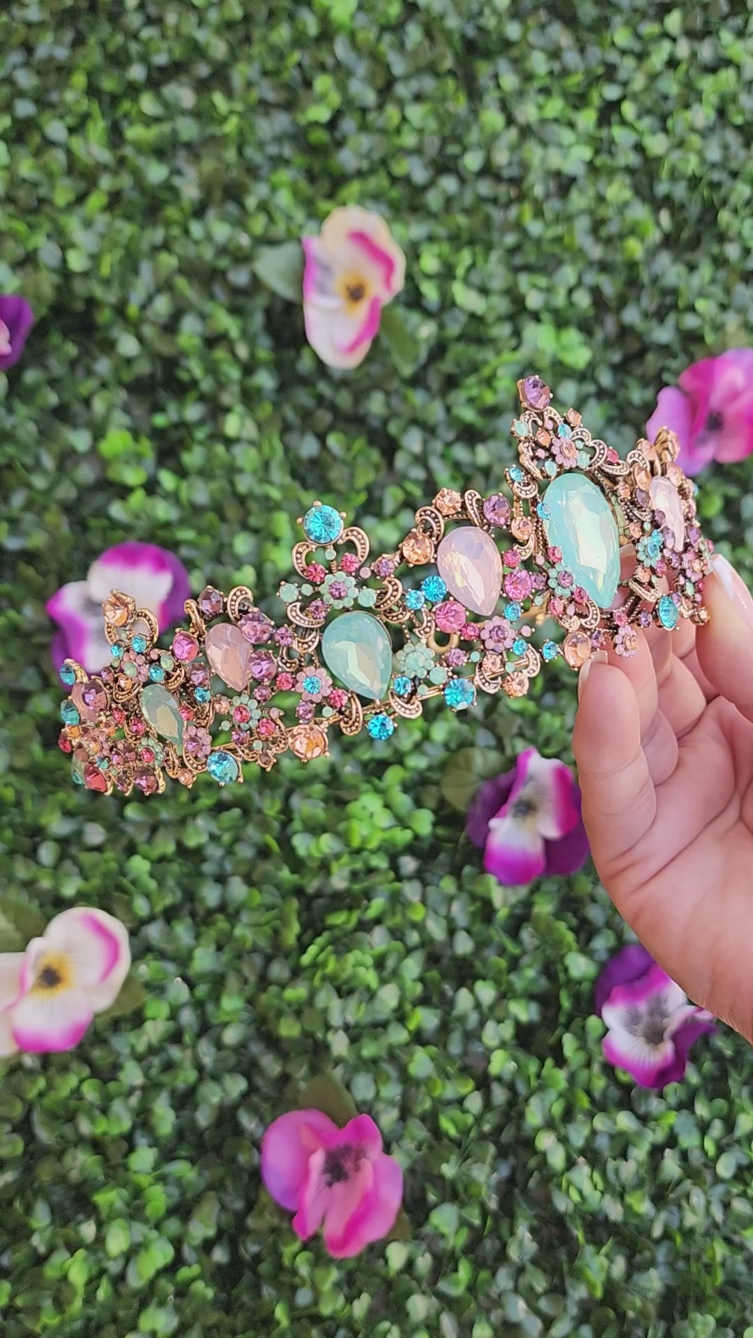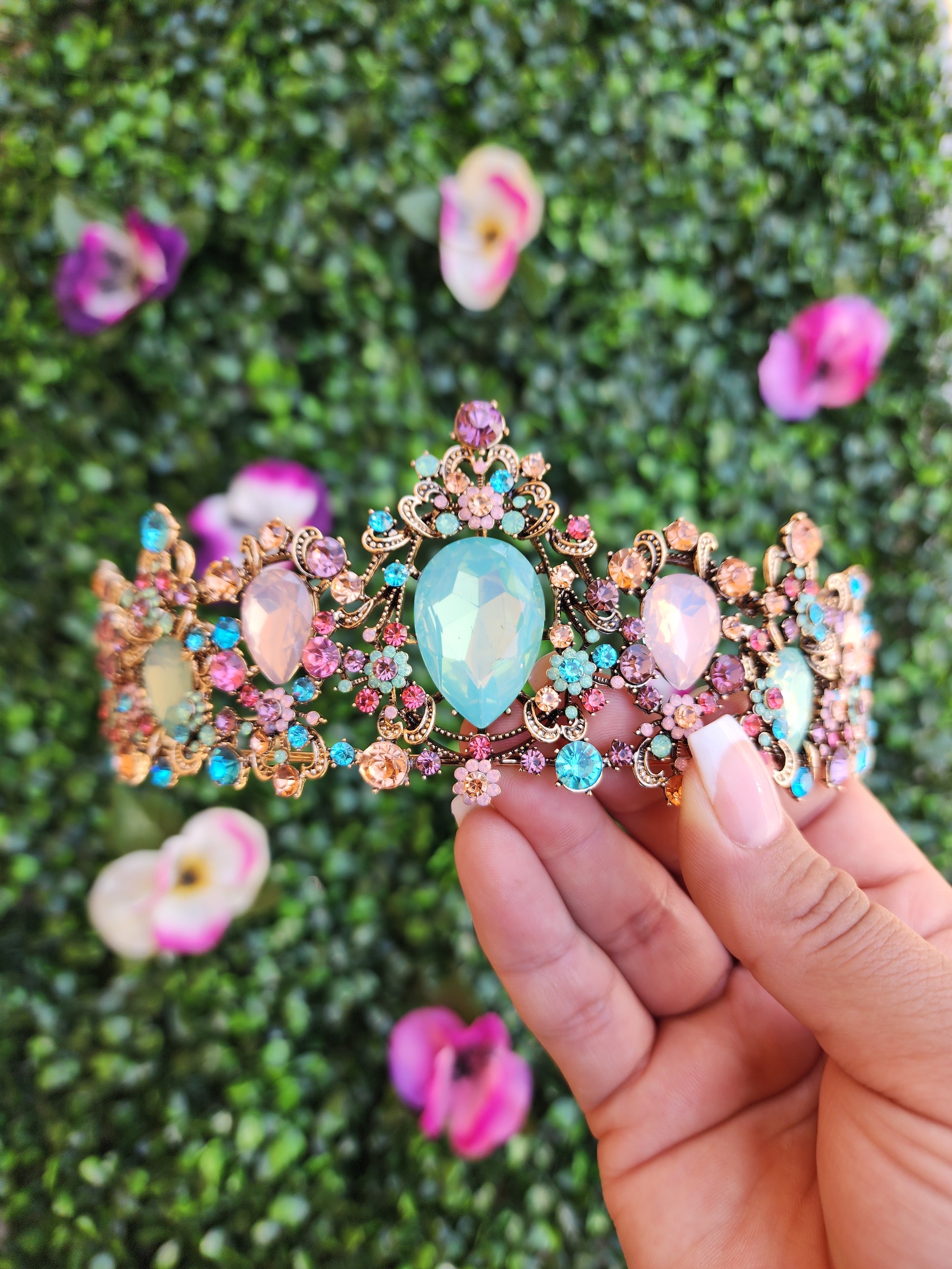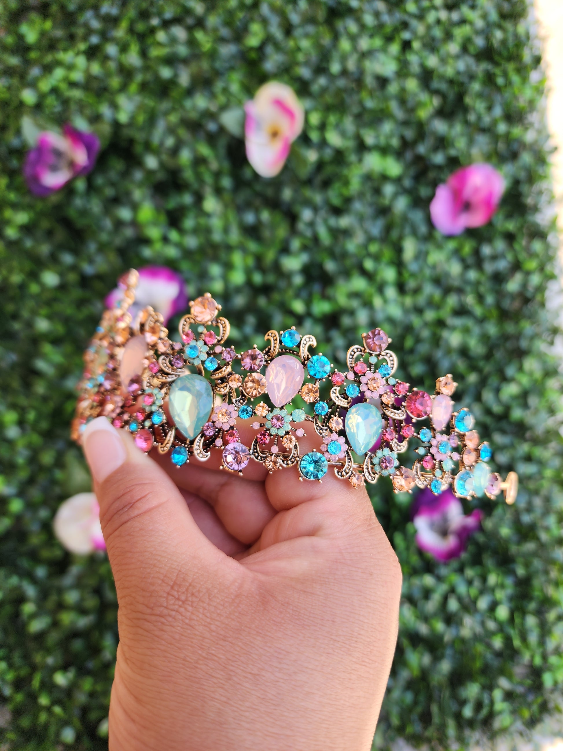 This gold and multicolored tiara is a captivating and enchanting headpiece that beautifully combines the timeless elegance of gold with refreshing and vibrant multicolor. This tiara gives a sense of sophistication and natural beauty, making it a striking accessory for various special occasions.