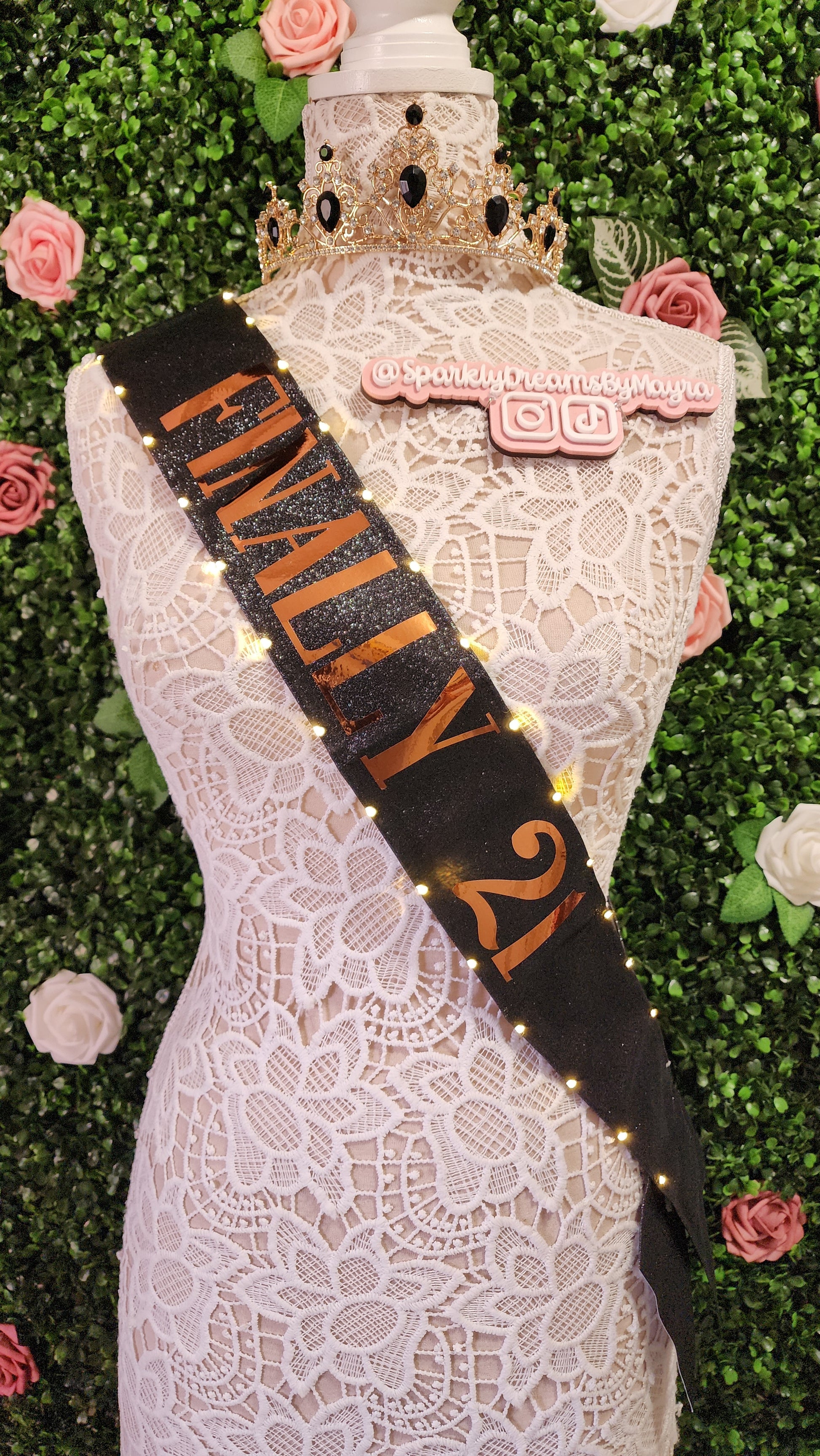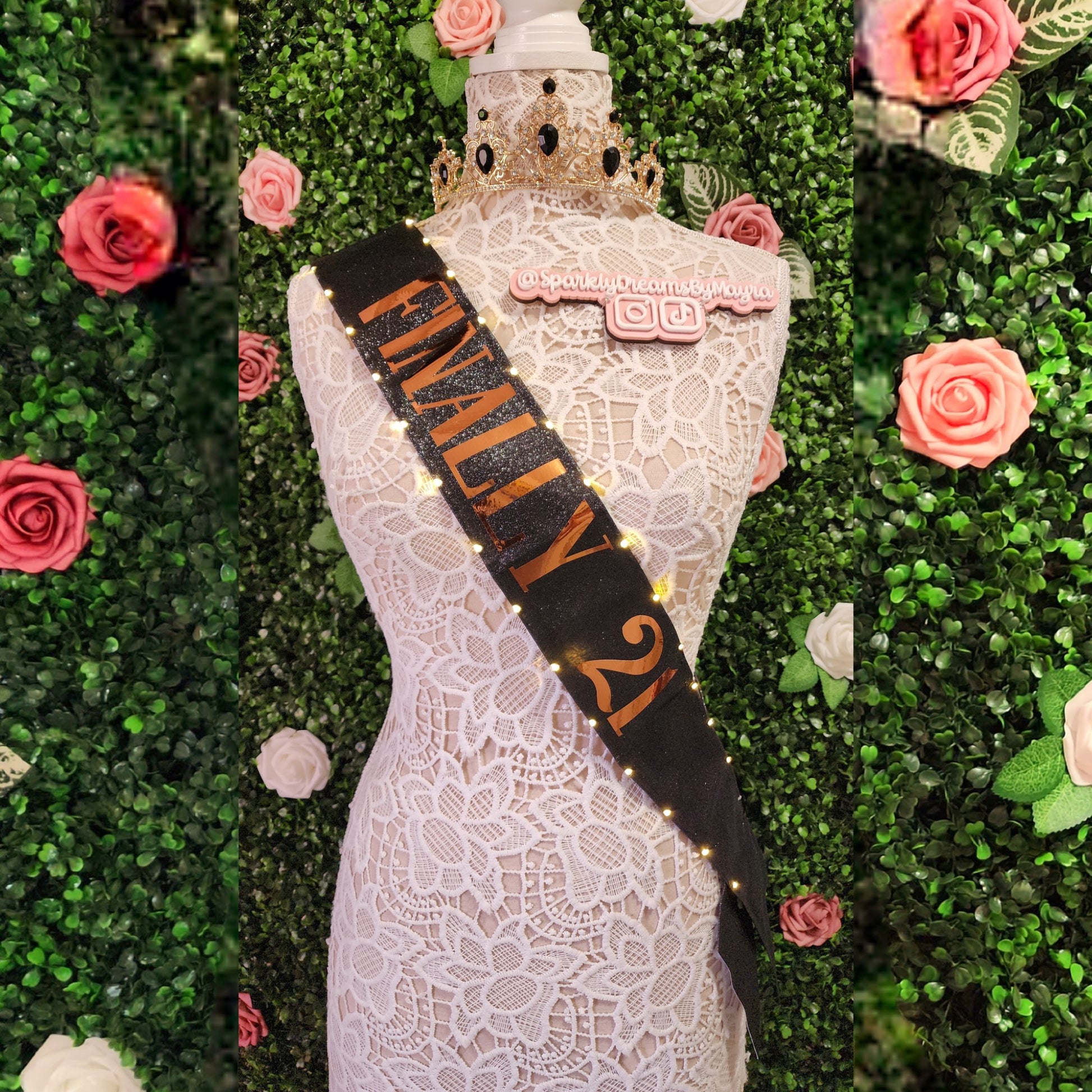 FINALLY 21 Light Up Birthday Sash | Black Sash with Rose Gold Foil, Light Up 21st celebration LED Party Accessory
