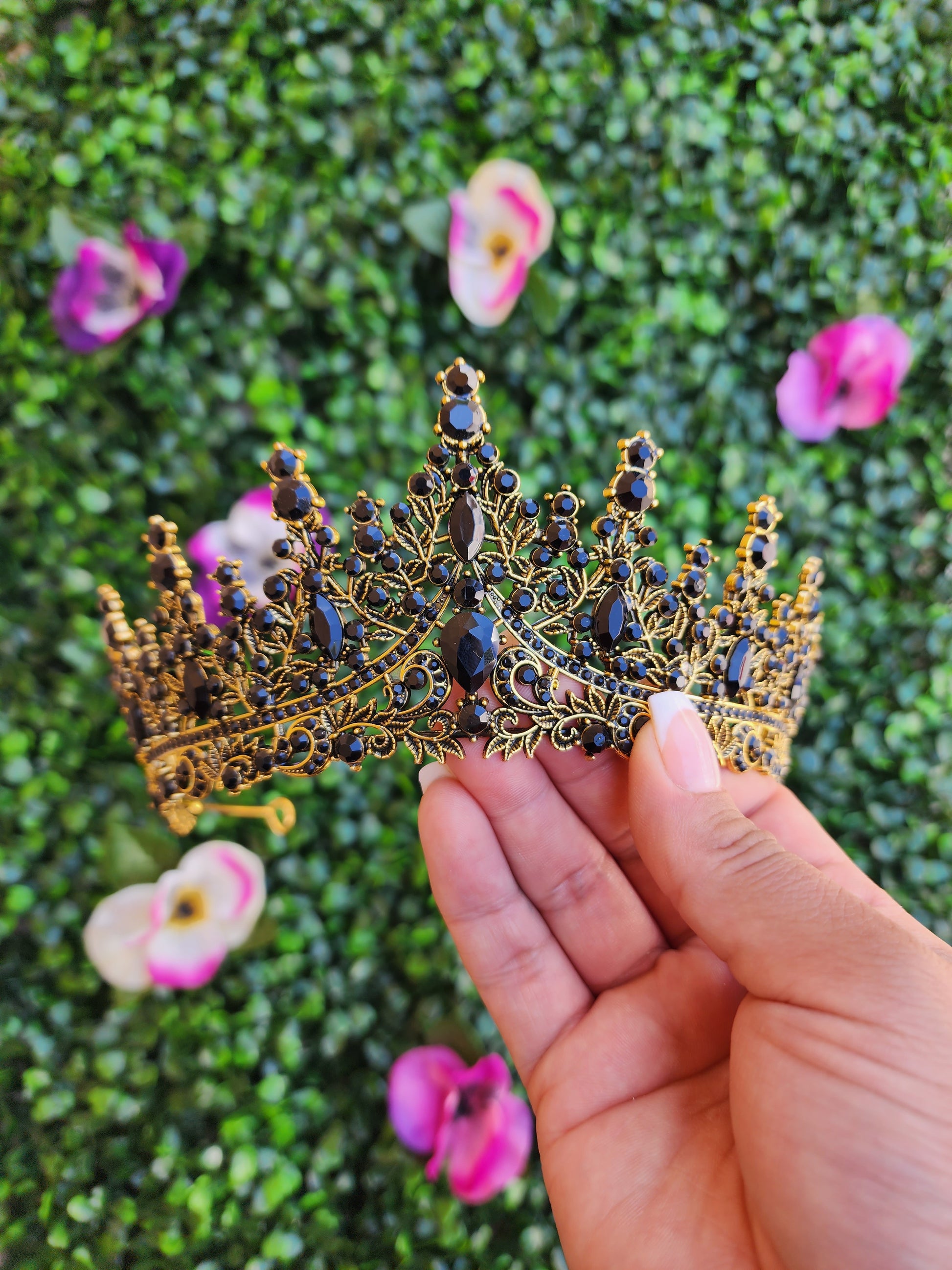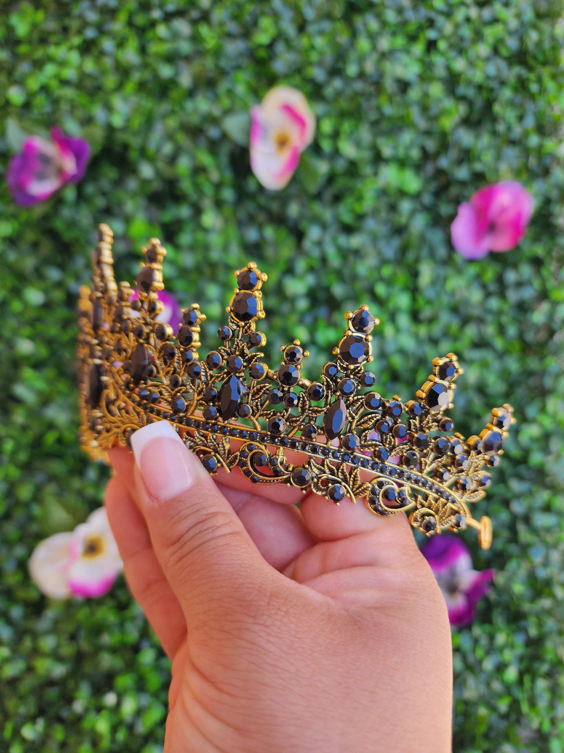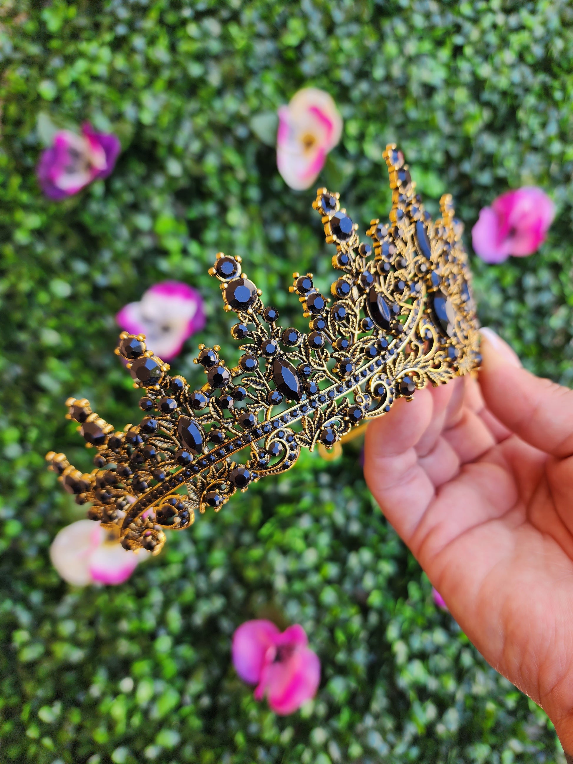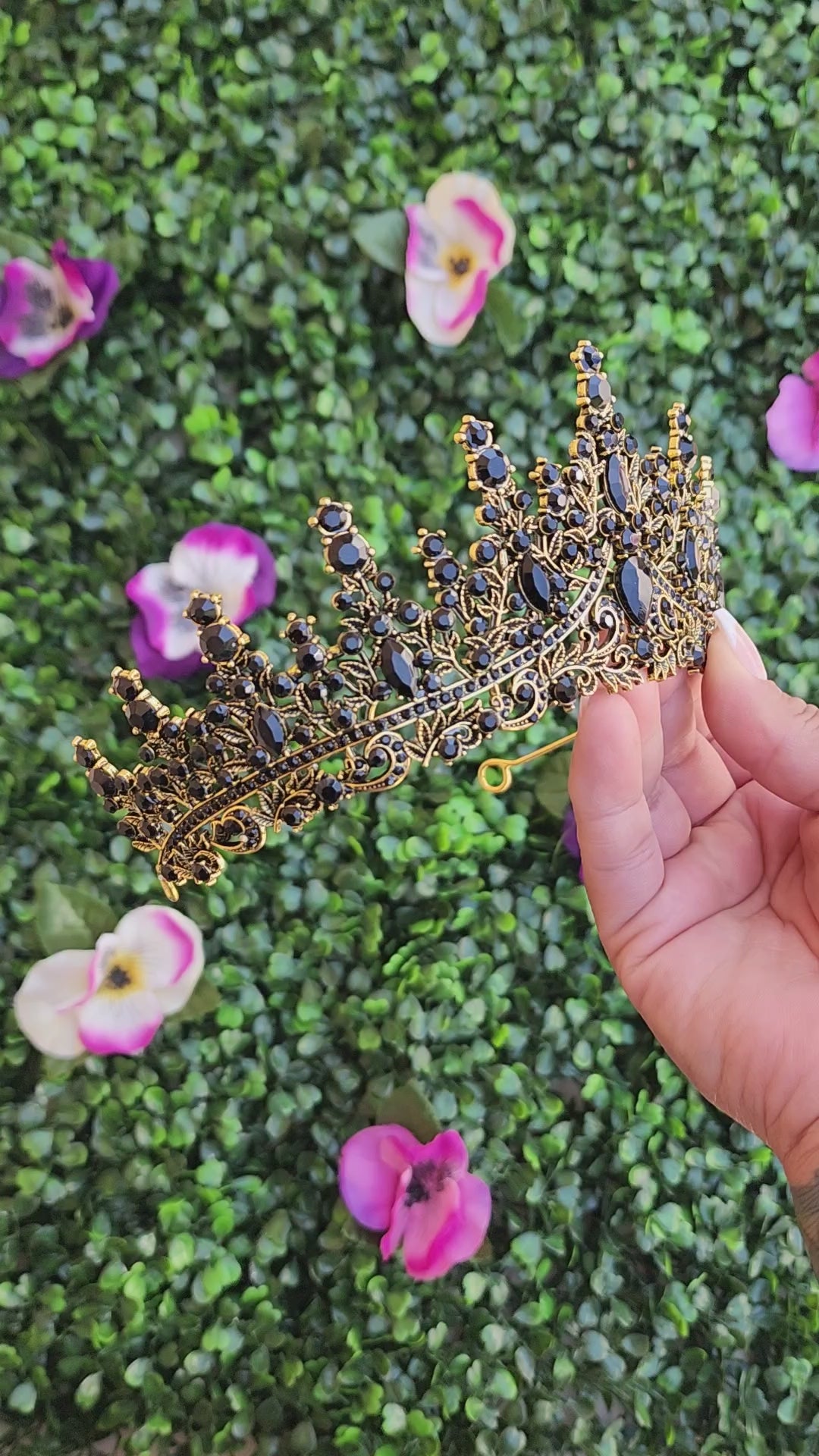 This tiara is a regal and luxurious headpiece fit for royalty. Perfect those seeking to make a glamorous and striking fashion statement. This exquisite tiara combines the richness of gold with the elegance of black to create a piece that exudes luxury and sophistication.