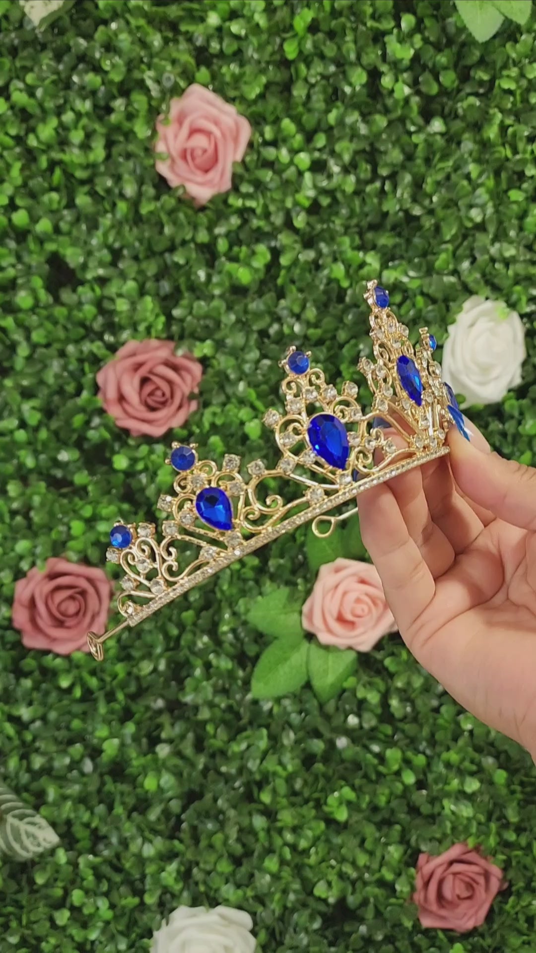 This stunning gold tiara sparkles with blue and silver rhinestones and is sure to make you shine like a star! The intricate design of the tiara is perfect for any special occasions or to add a touch of glamour to any look.