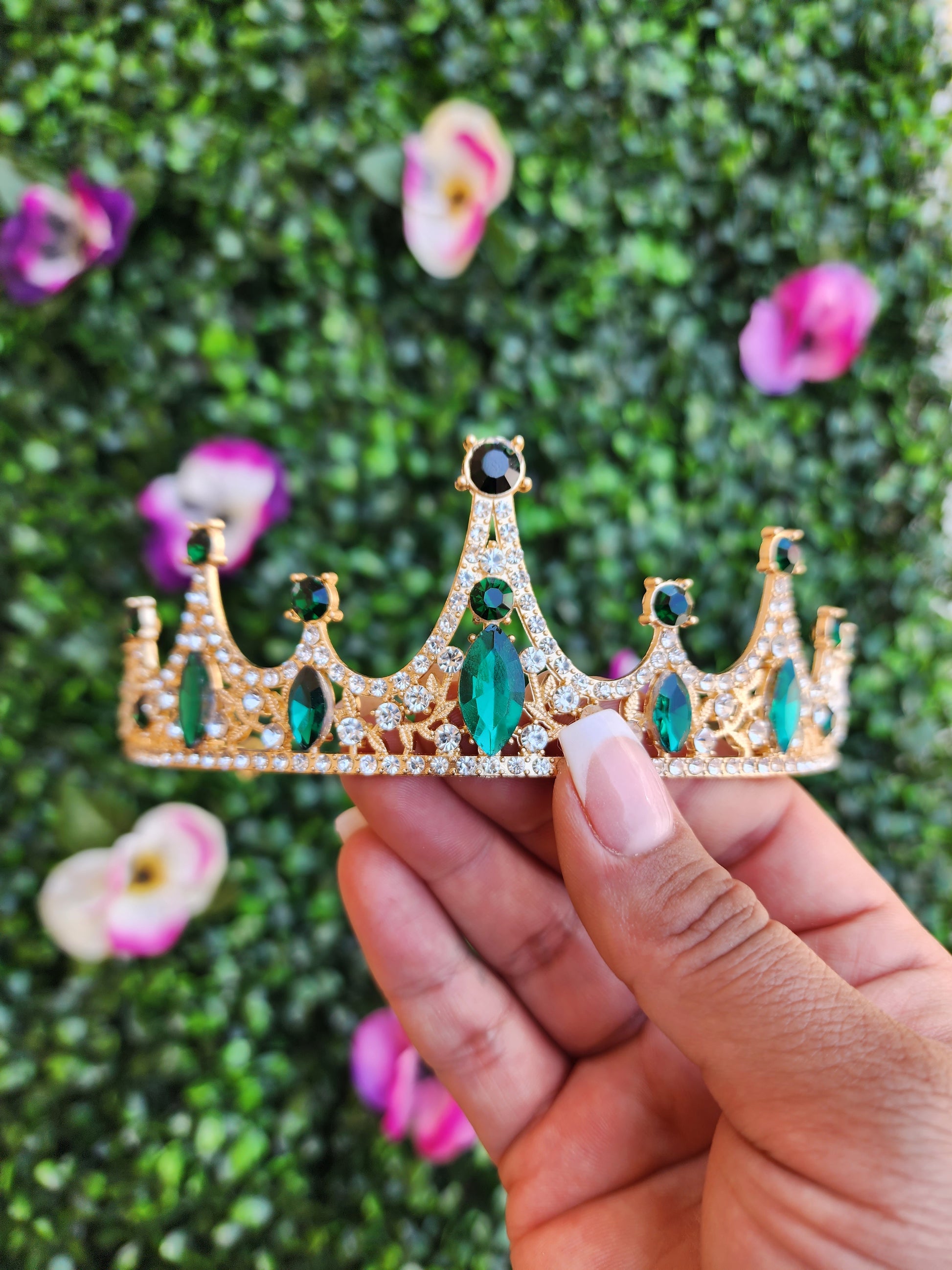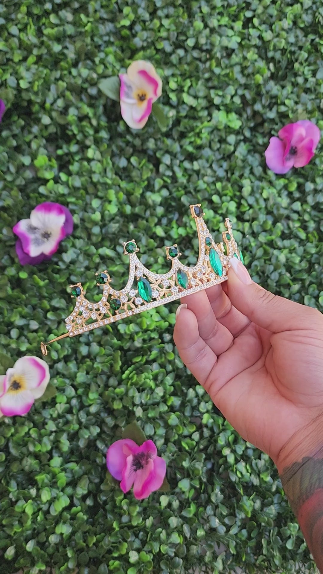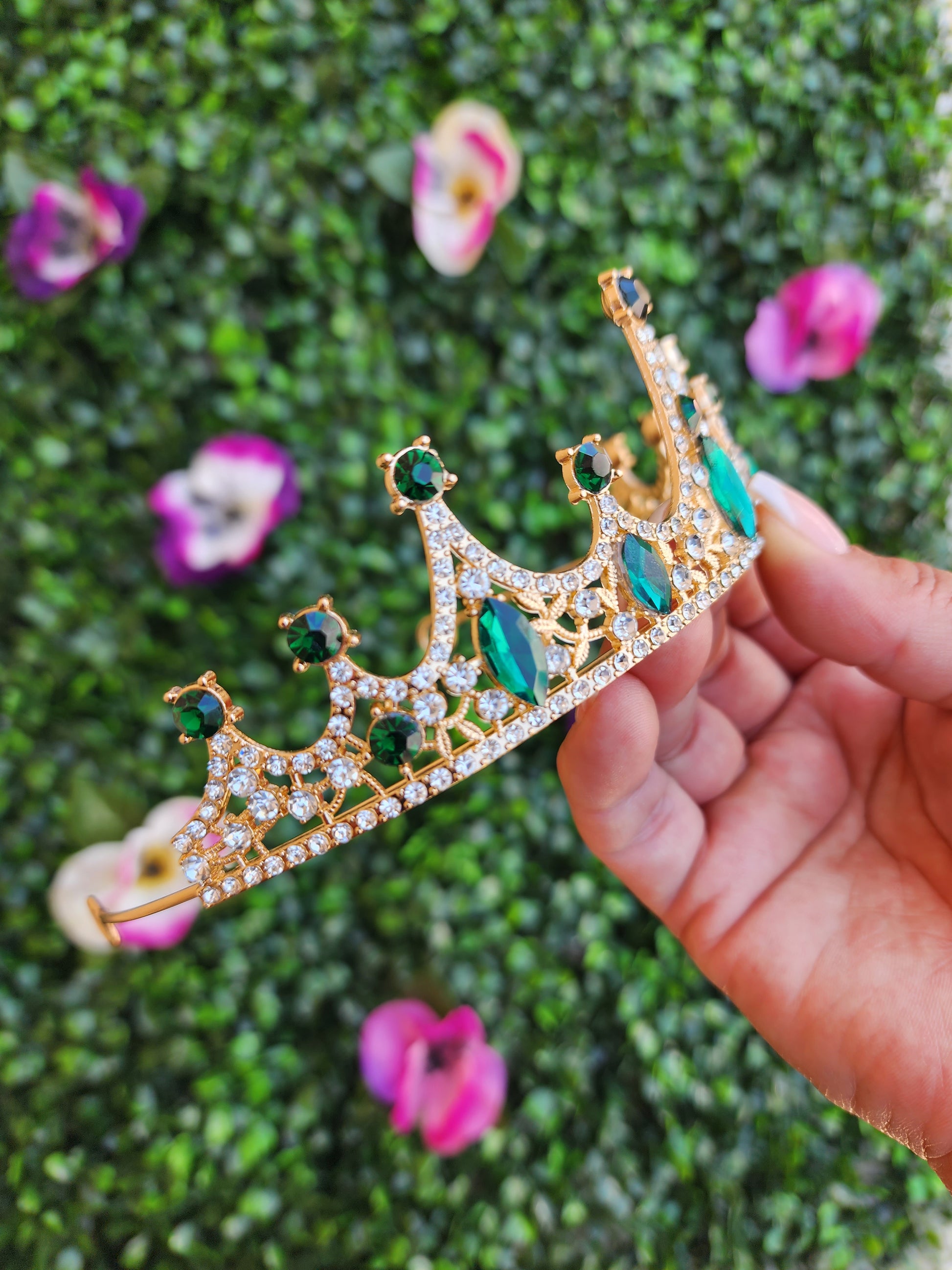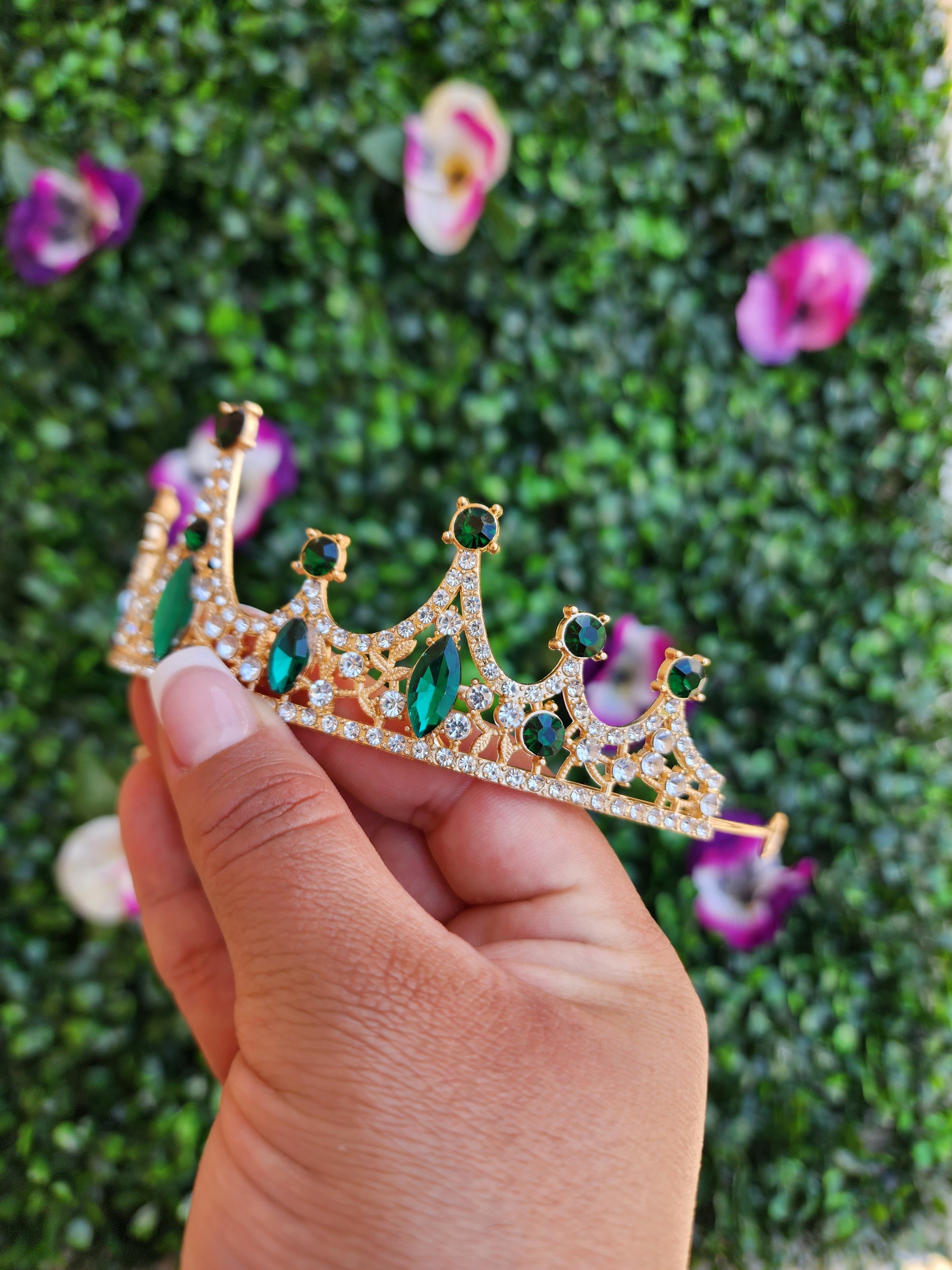 Delicate and dainty, this gold tiara is a perfect accessory for any regal look. This delicate accessory features a sleek metal frame adorned with green and silver rhinestones.
