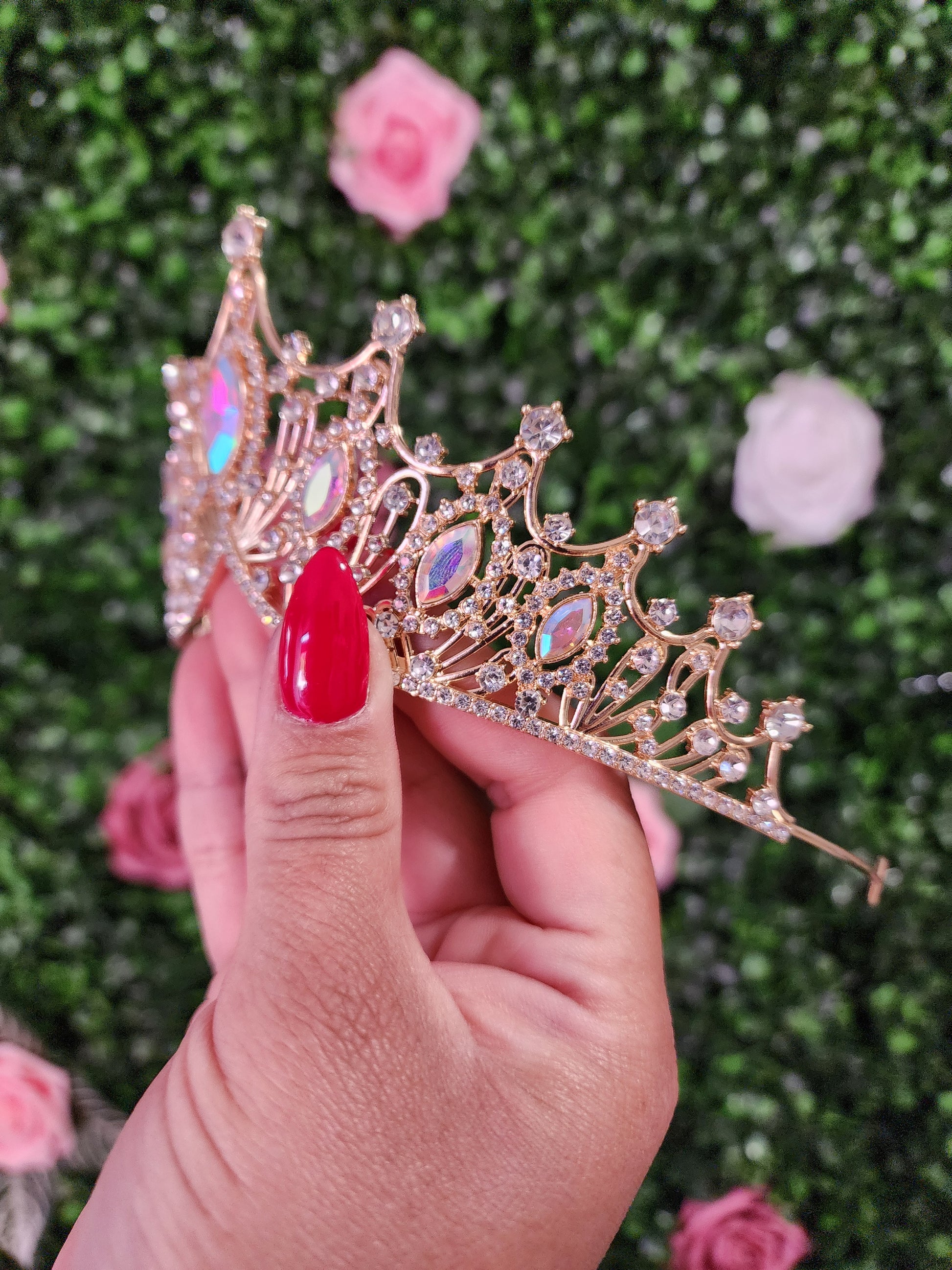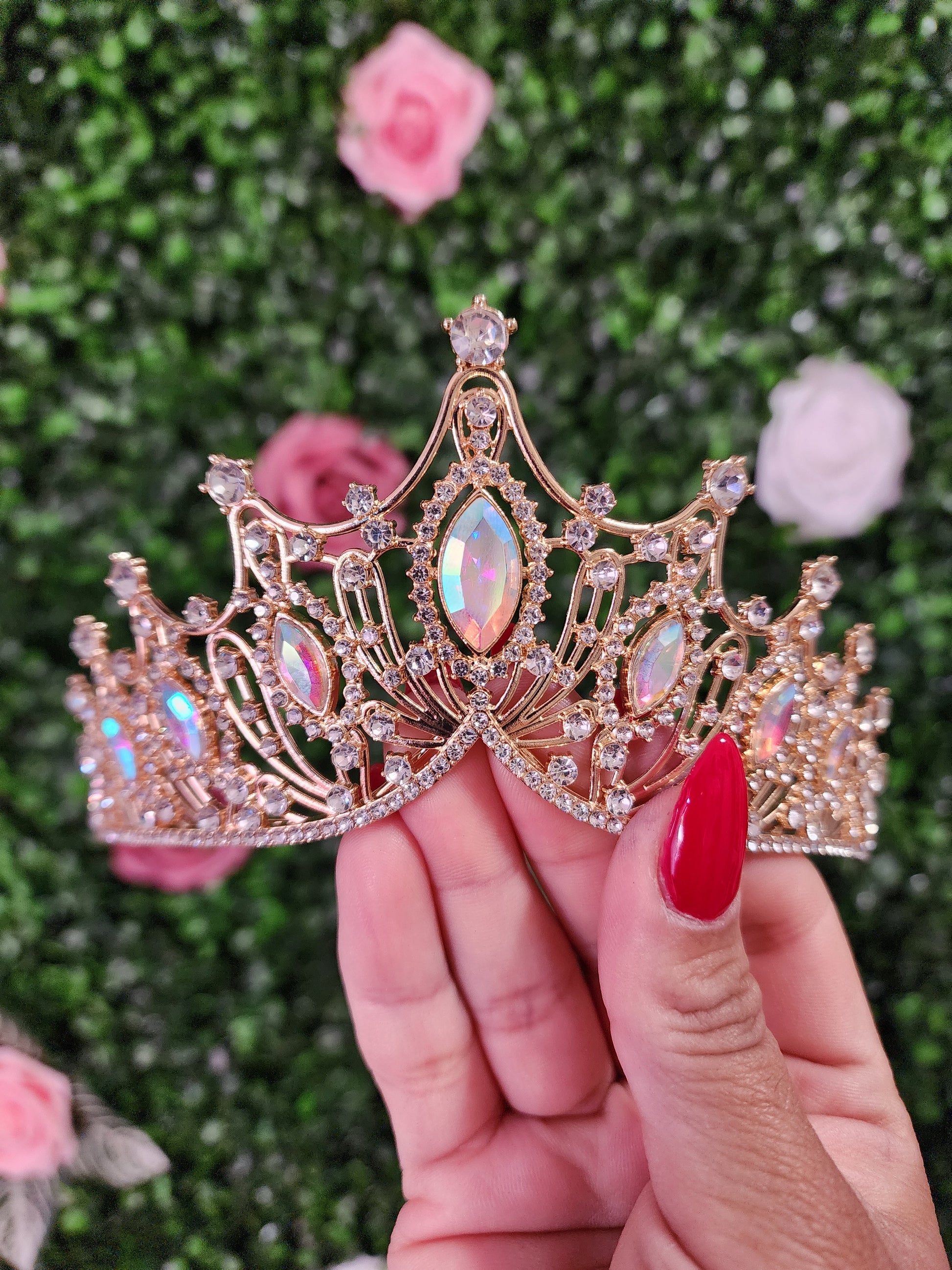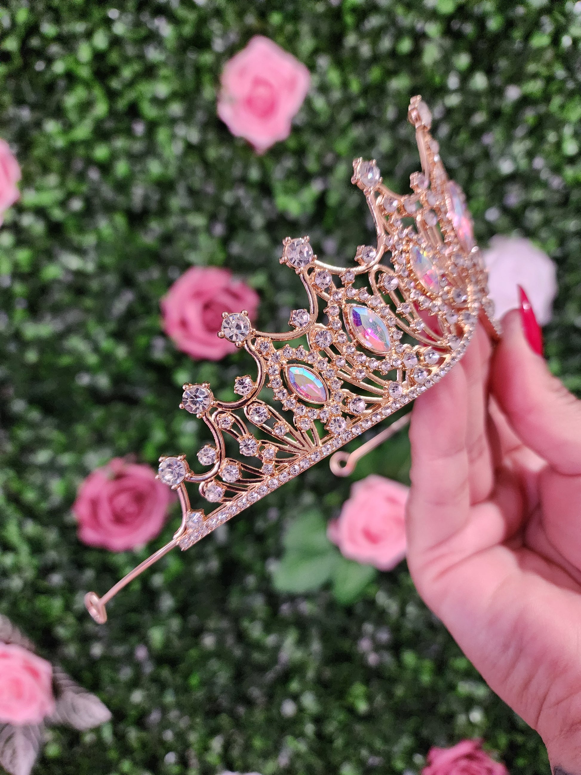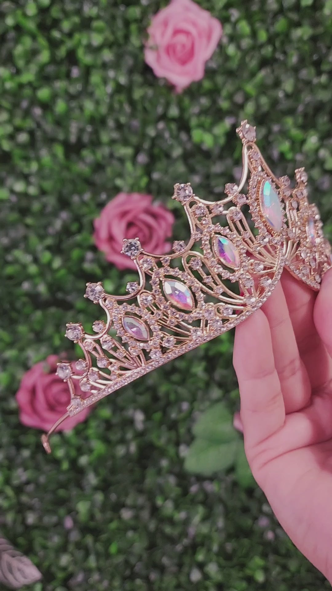 Elevate your look with this stunning gold tiara, featuring enchanting iridescent rhinestones that catch the light with every movement. Radiating elegance and charm, it's the perfect accessory for a truly unforgettable moment.