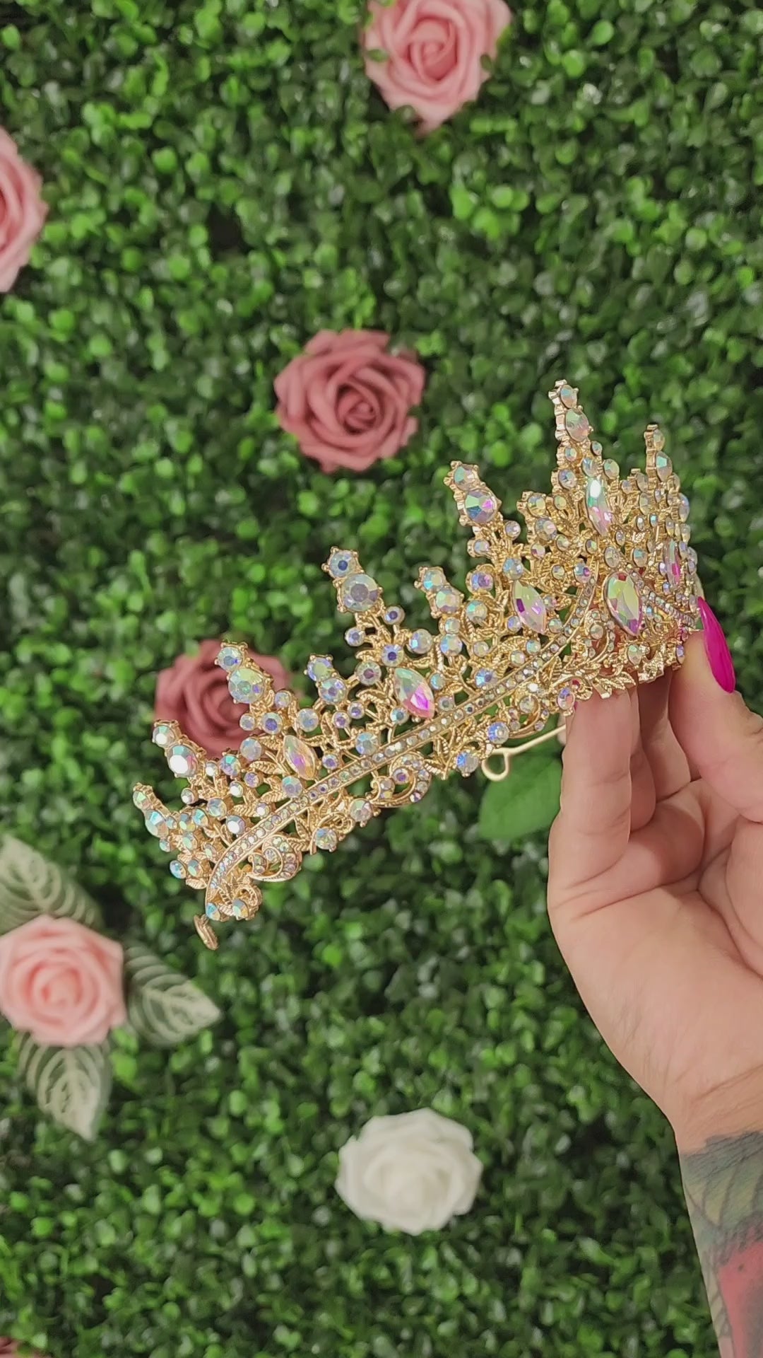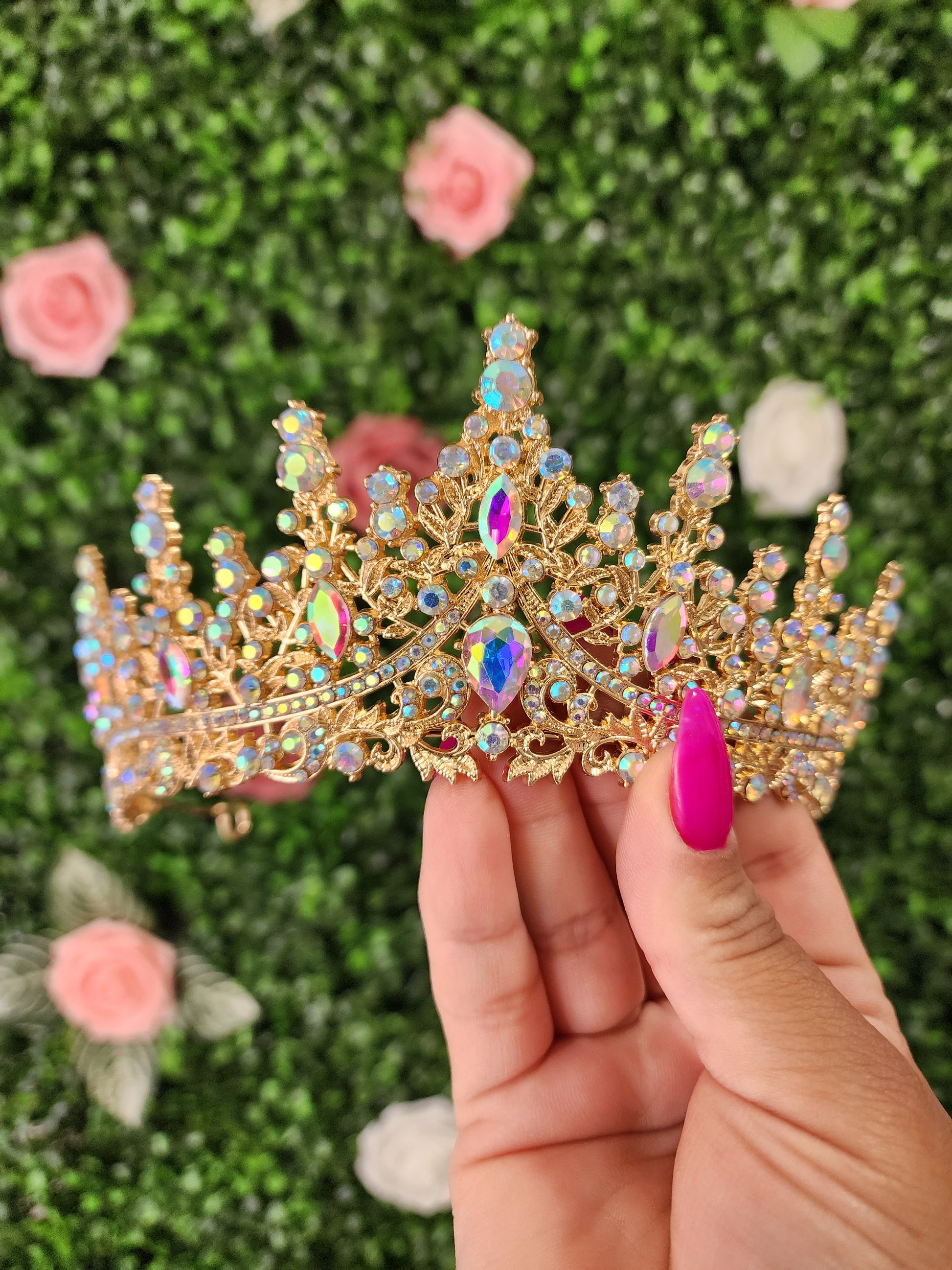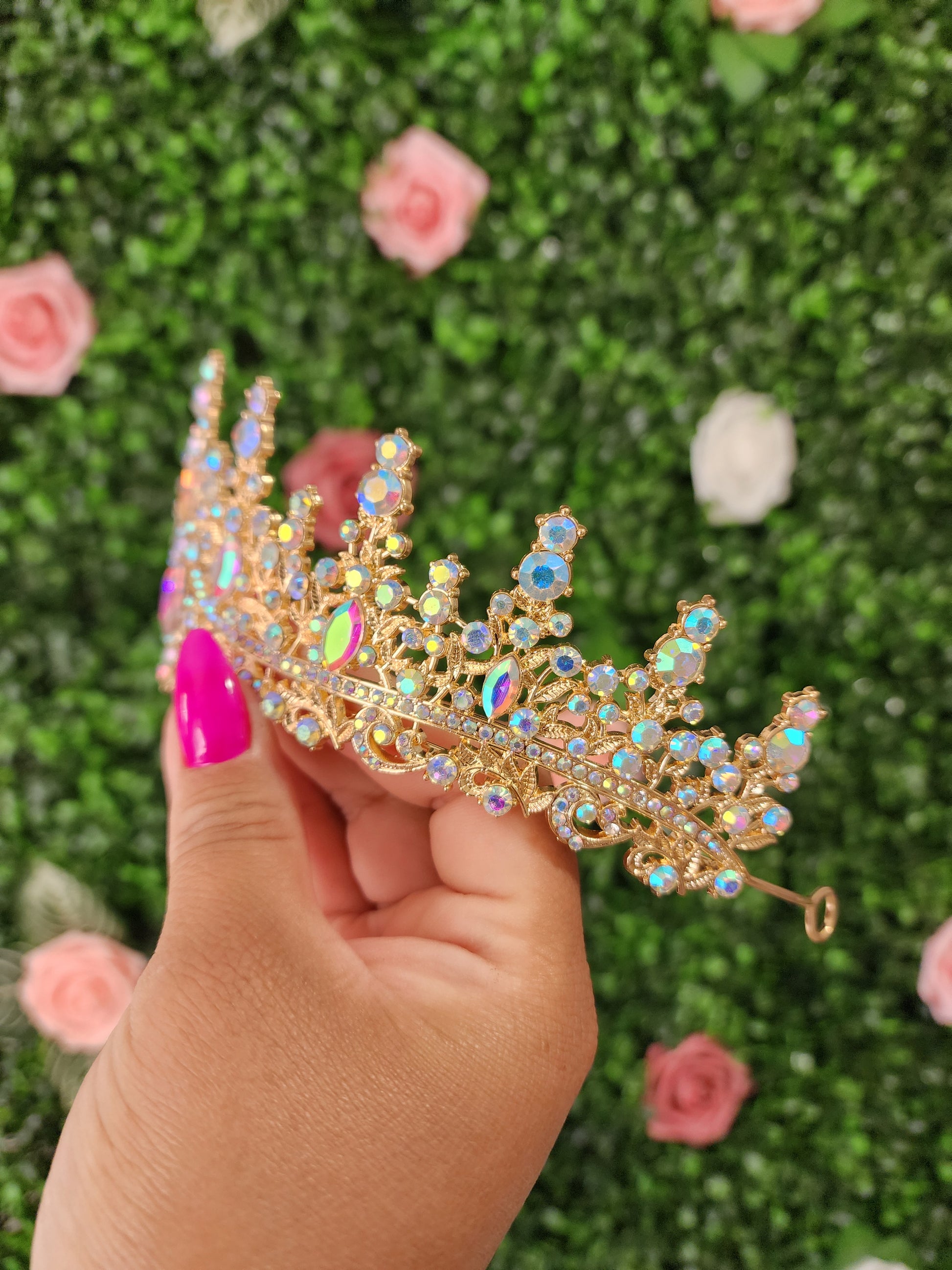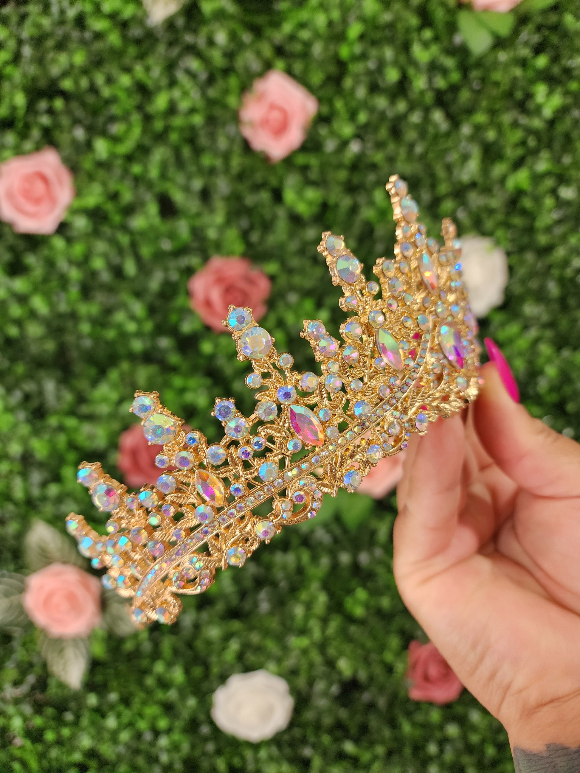 Elevate your look with this stunning gold tiara, featuring enchanting iridescent rhinestones that catch the light with every movement. Radiating elegance and charm, it's the perfect accessory for a truly unforgettable moment.