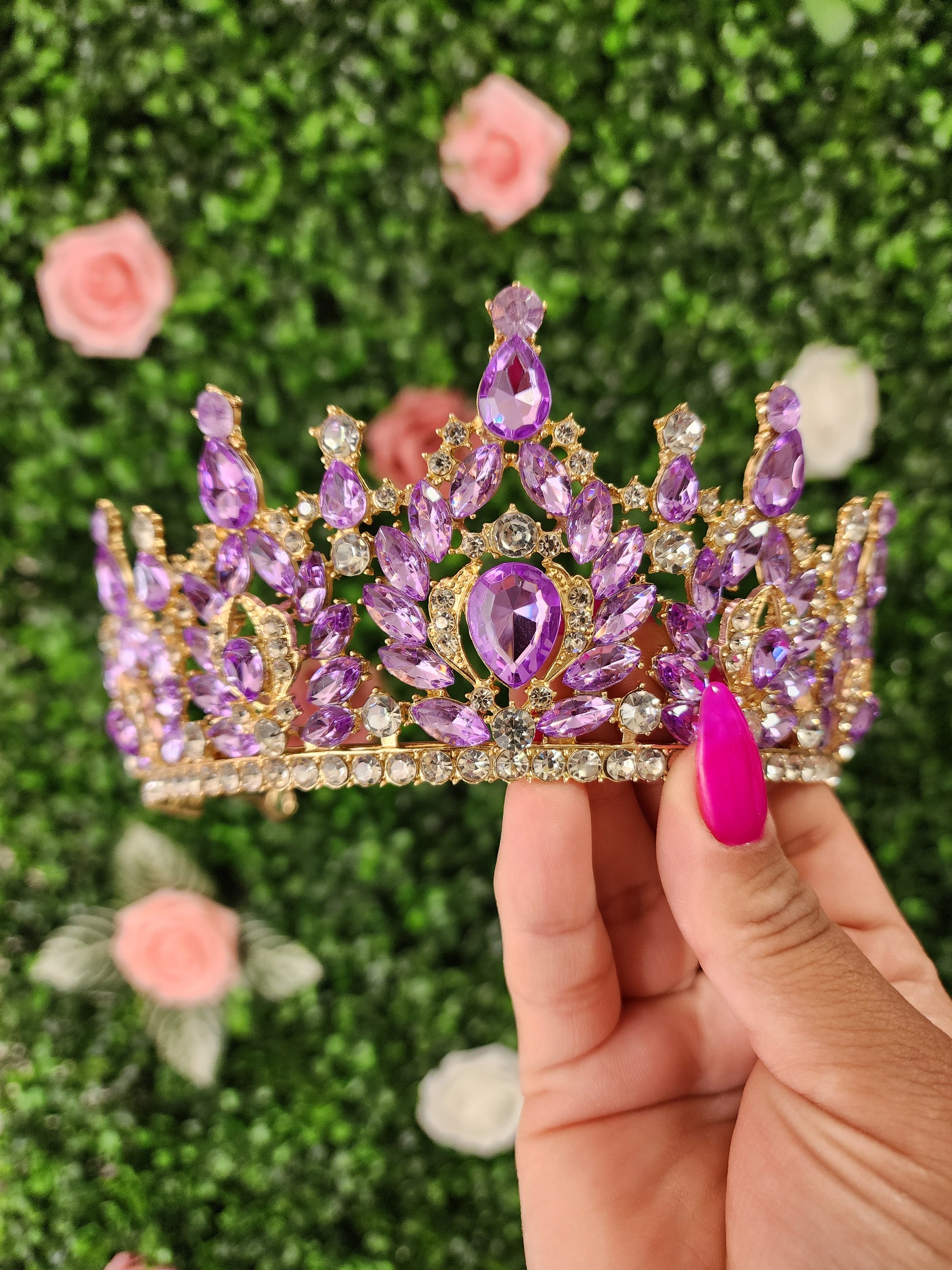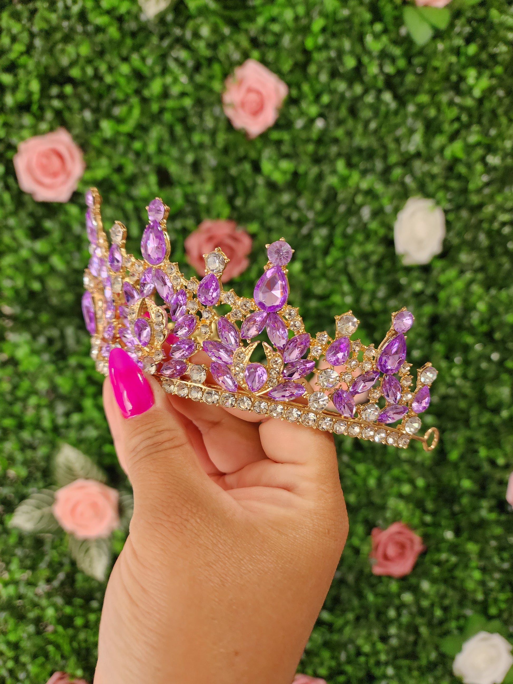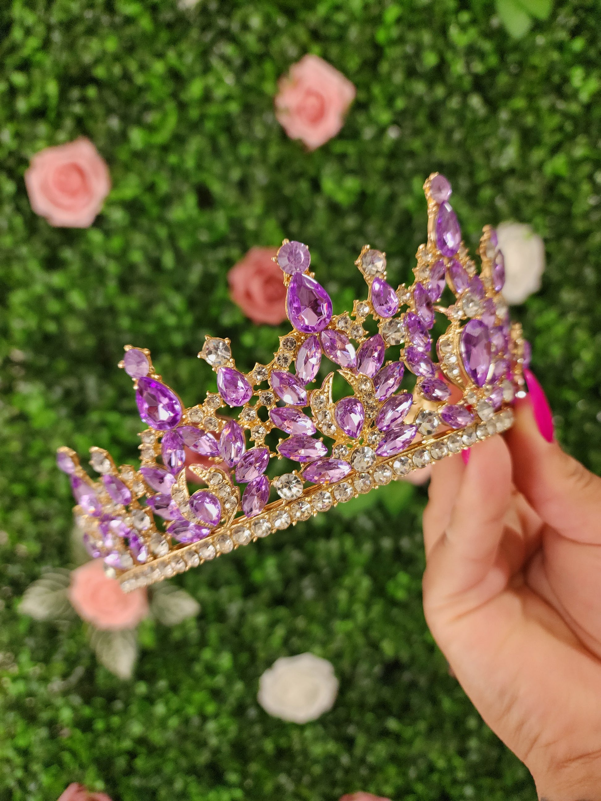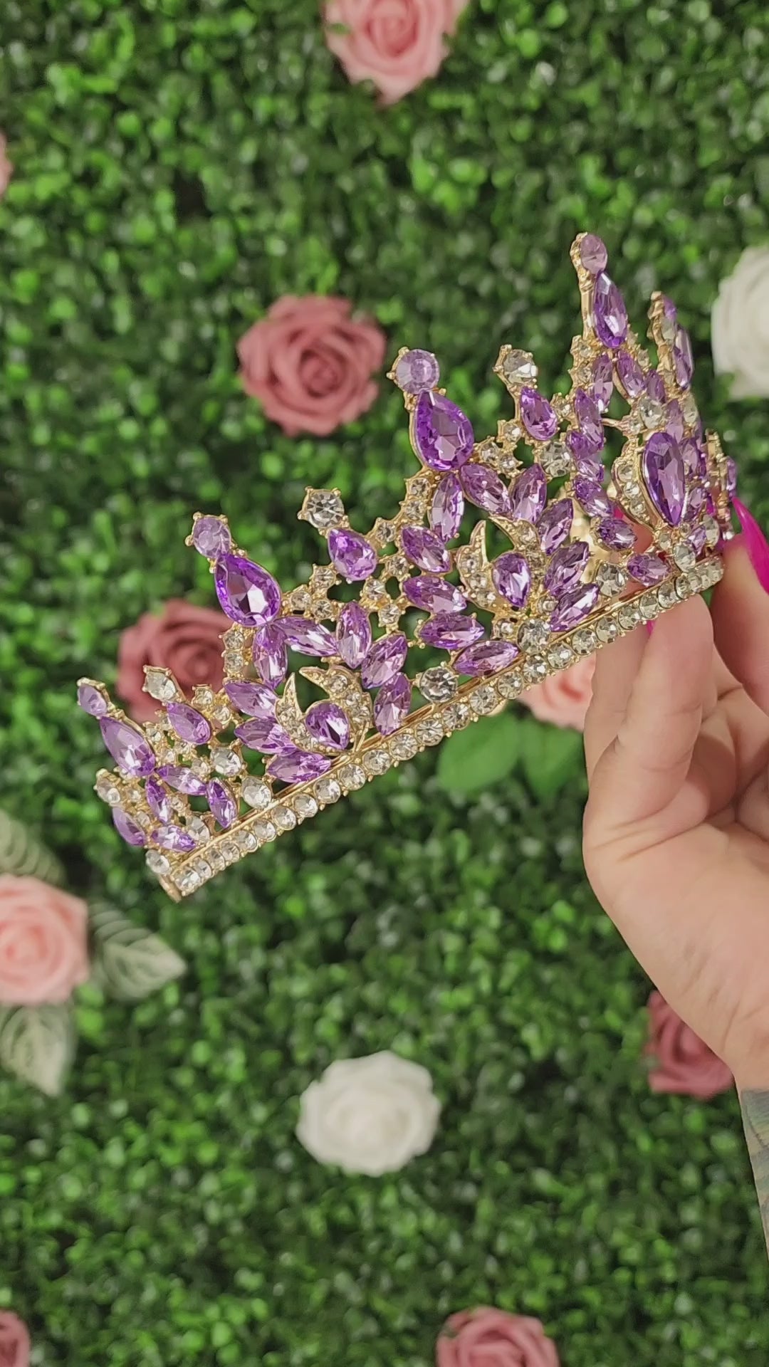 Elevate your look with this enchanting gold tiara, featuring dazzling silver rhinestones complemented by delicate lilac ice-like accents. A harmonious blend of opulence and grace, this tiara adds a touch of whimsical charm to any occasion, ensuring you stand out with timeless elegance.