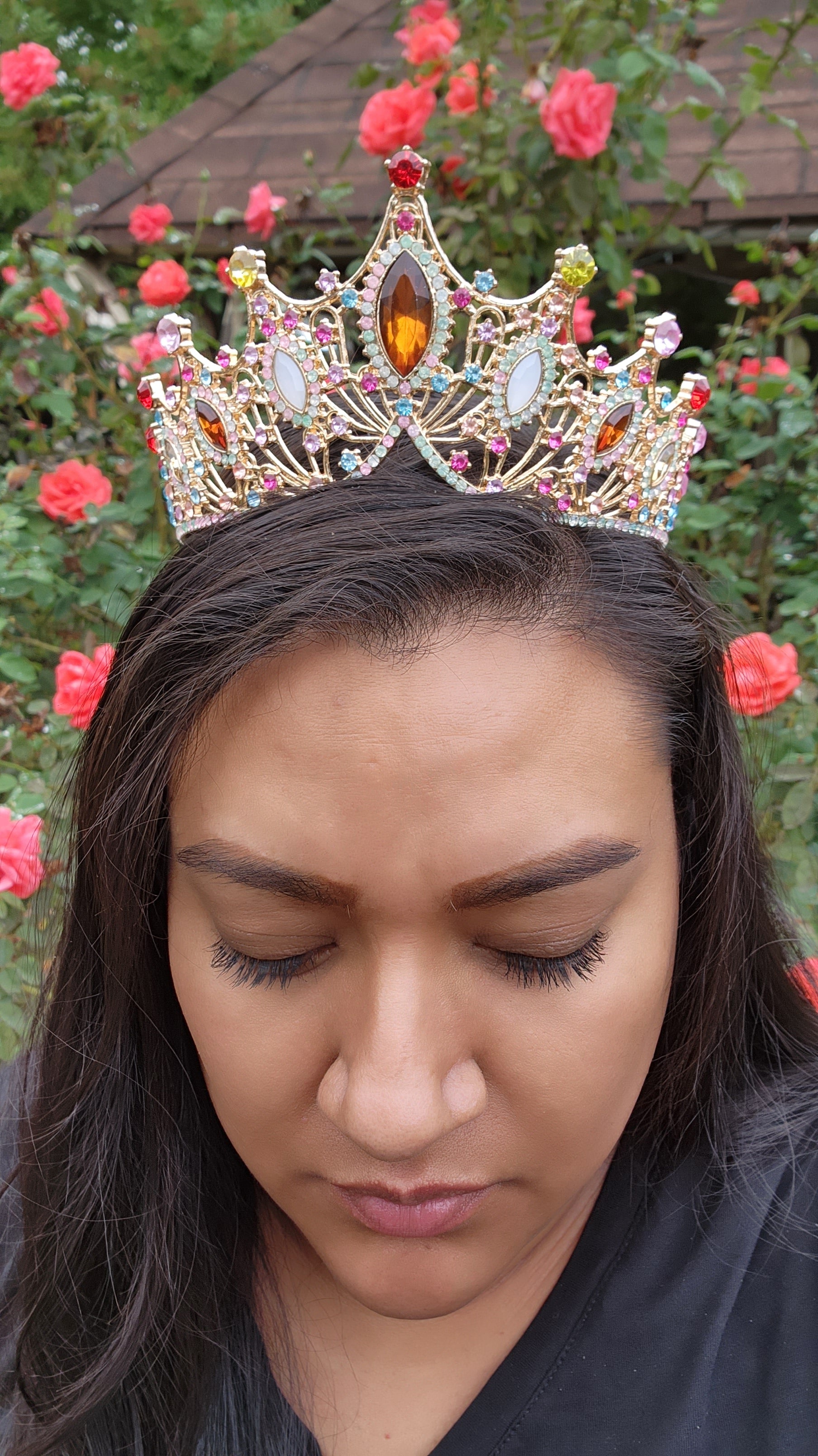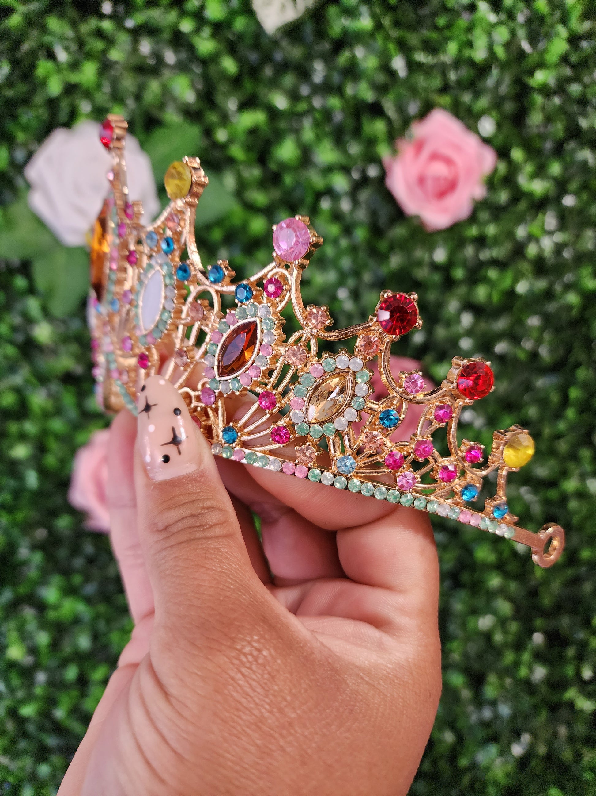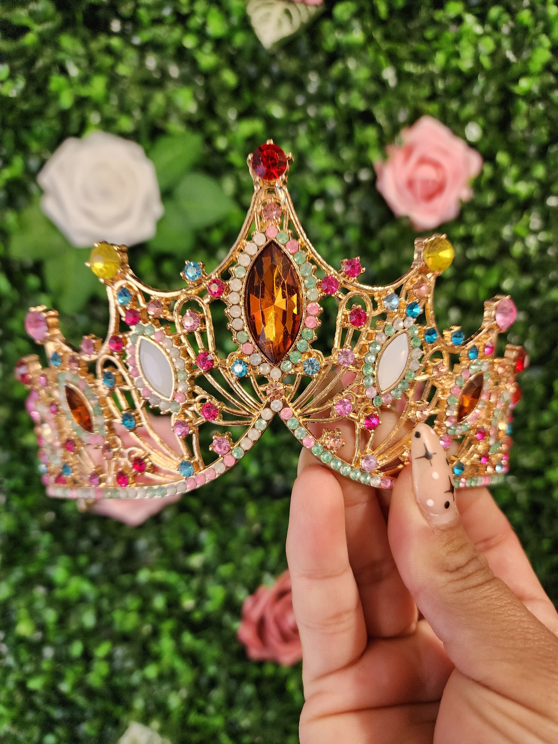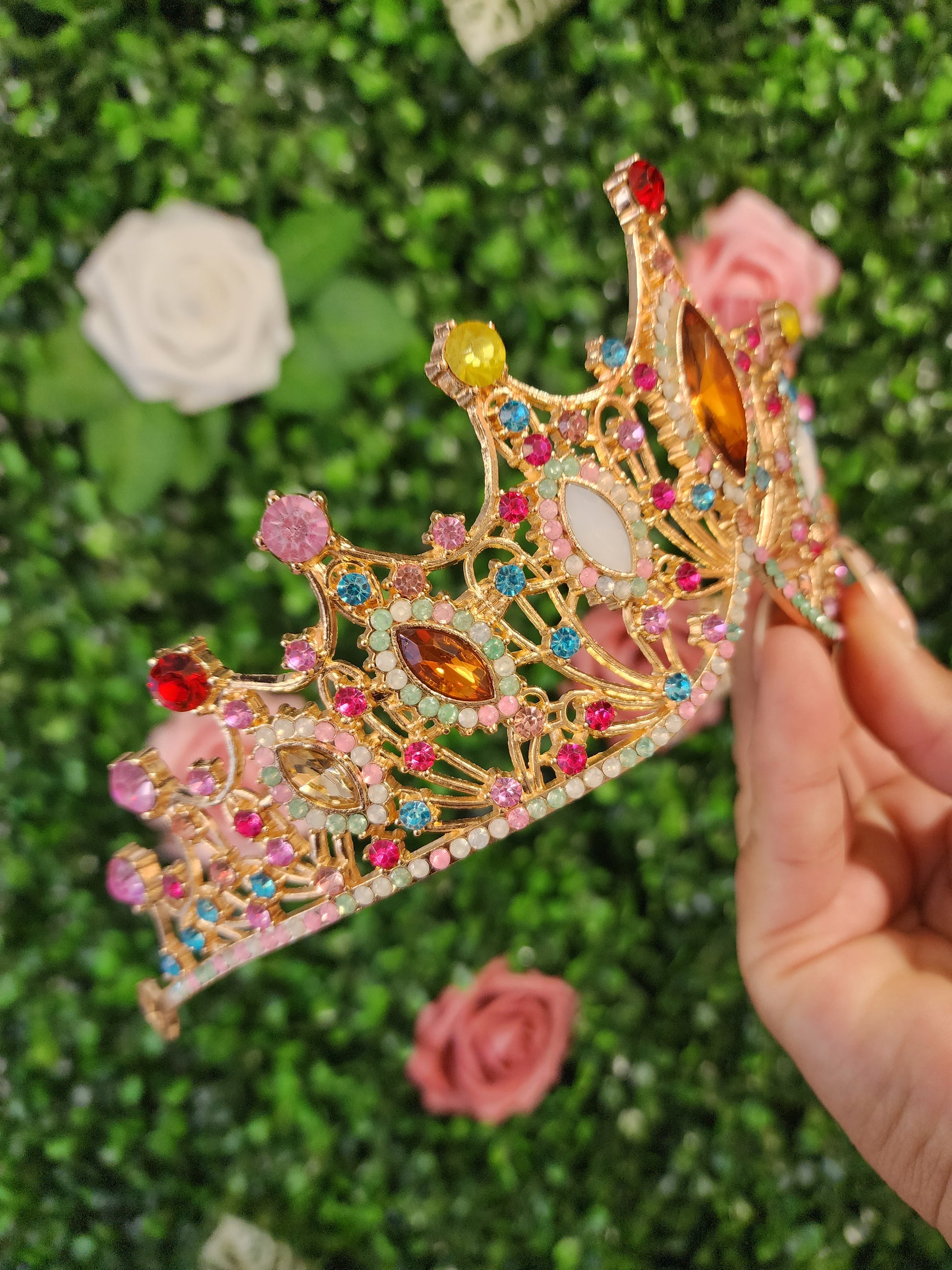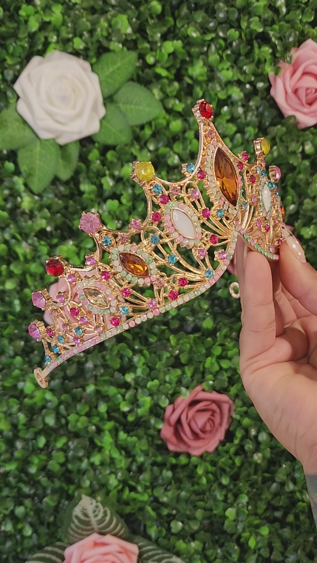 This gold and multicolored tiara is a captivating and enchanting headpiece that beautifully combines the timeless elegance of gold with refreshing and vibrant multicolor. This tiara gives a sense of sophistication and natural beauty, making it a striking accessory for various special occasions.