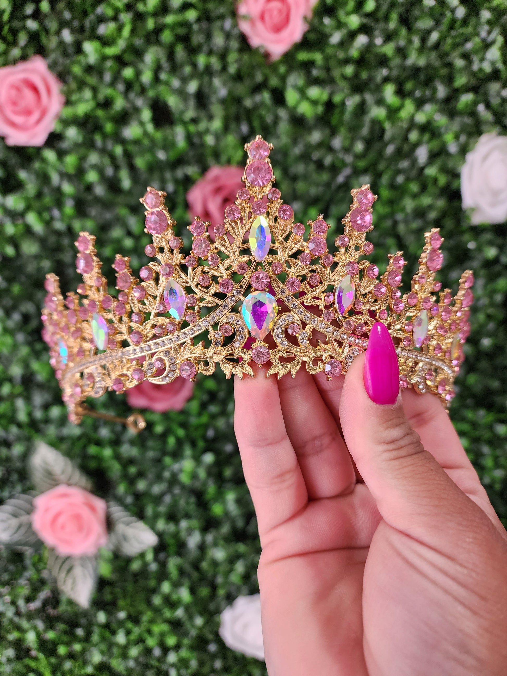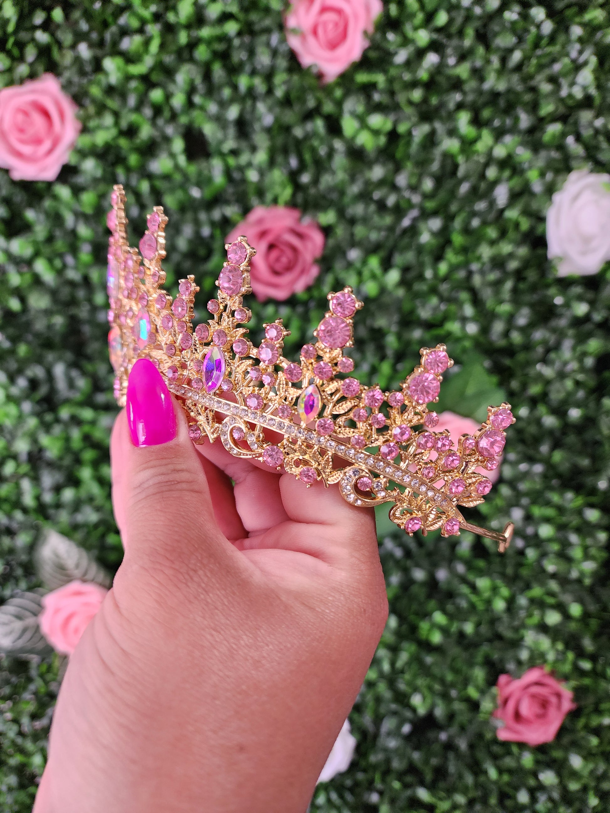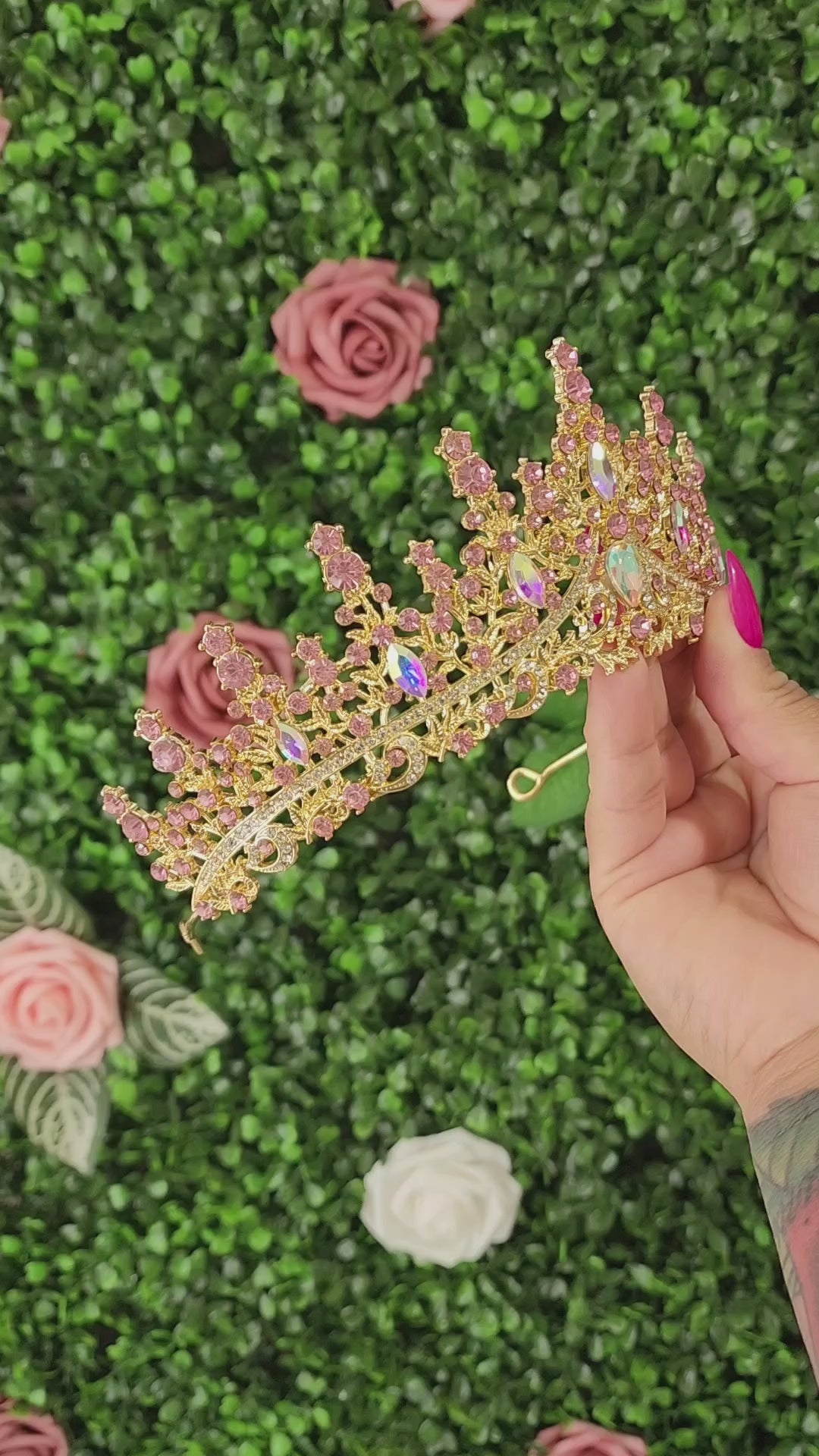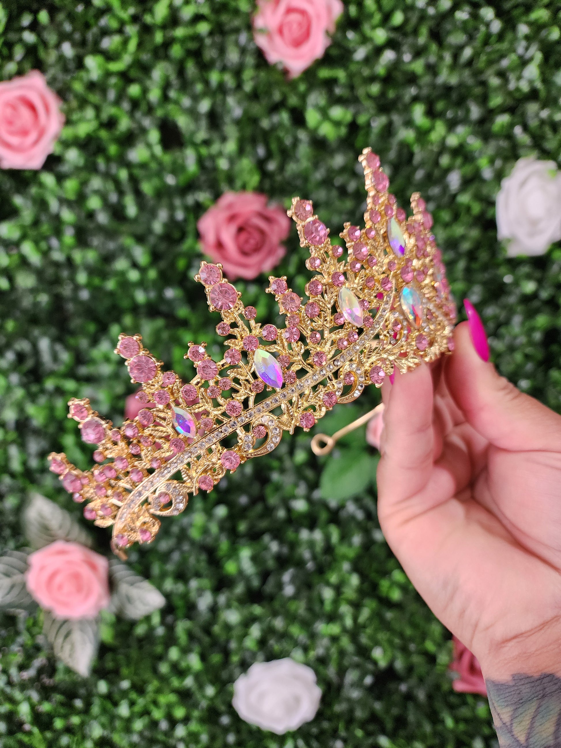 This tiara is a regal and luxurious headpiece fit for royalty. Perfect those seeking to make a glamorous and striking fashion statement. This exquisite tiara combines the richness of gold with the elegance of pink to create a piece that exudes luxury and sophistication.
