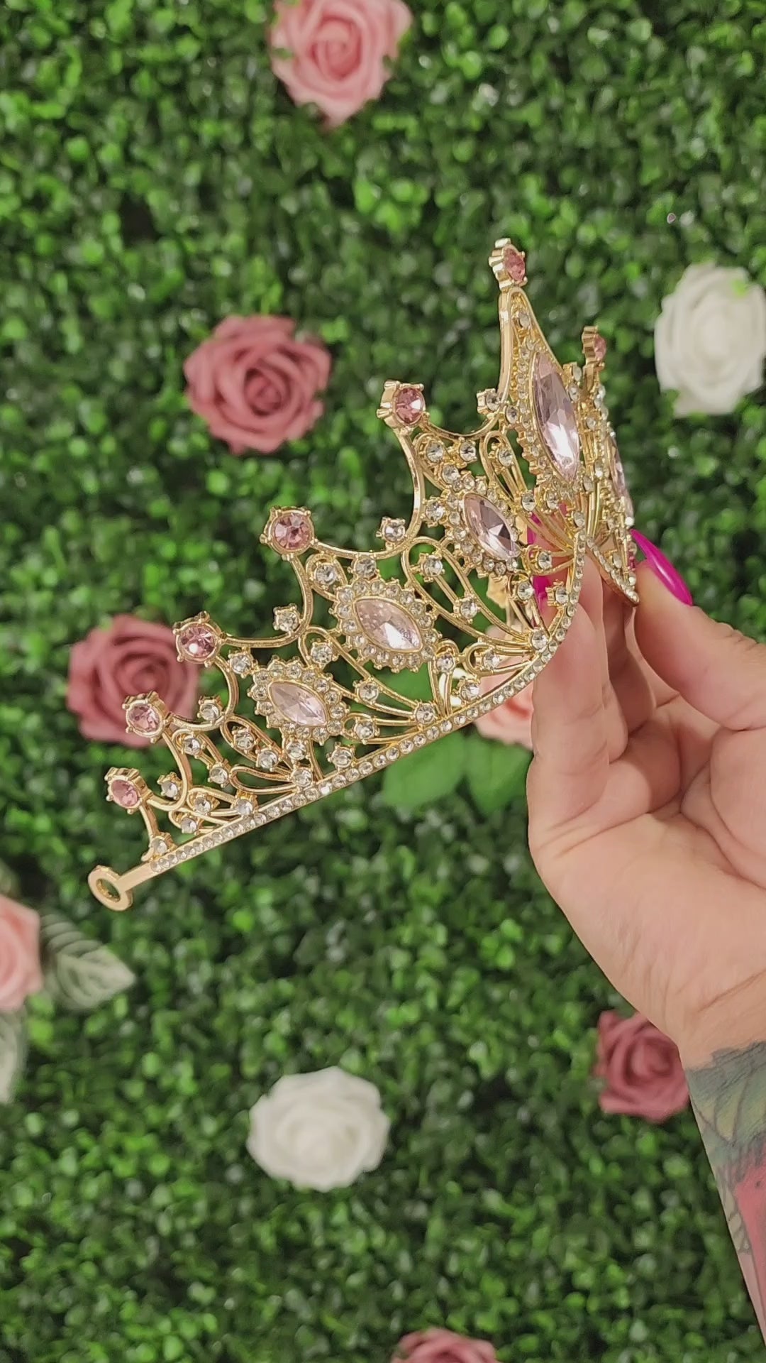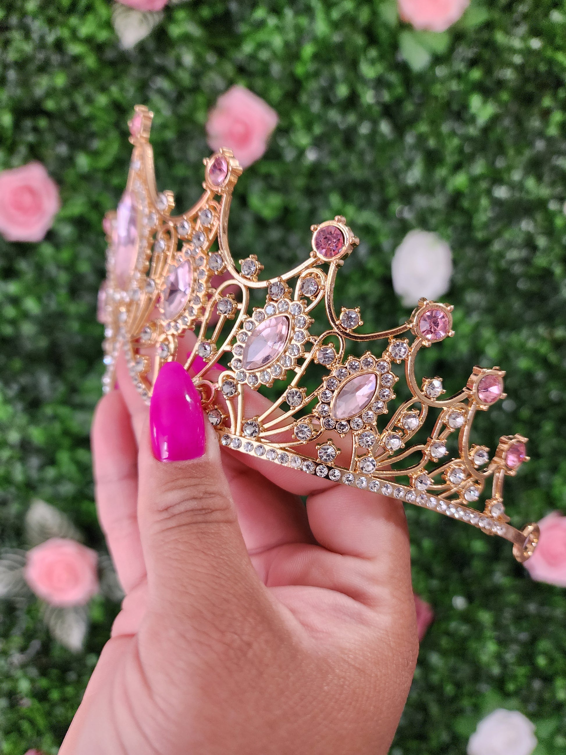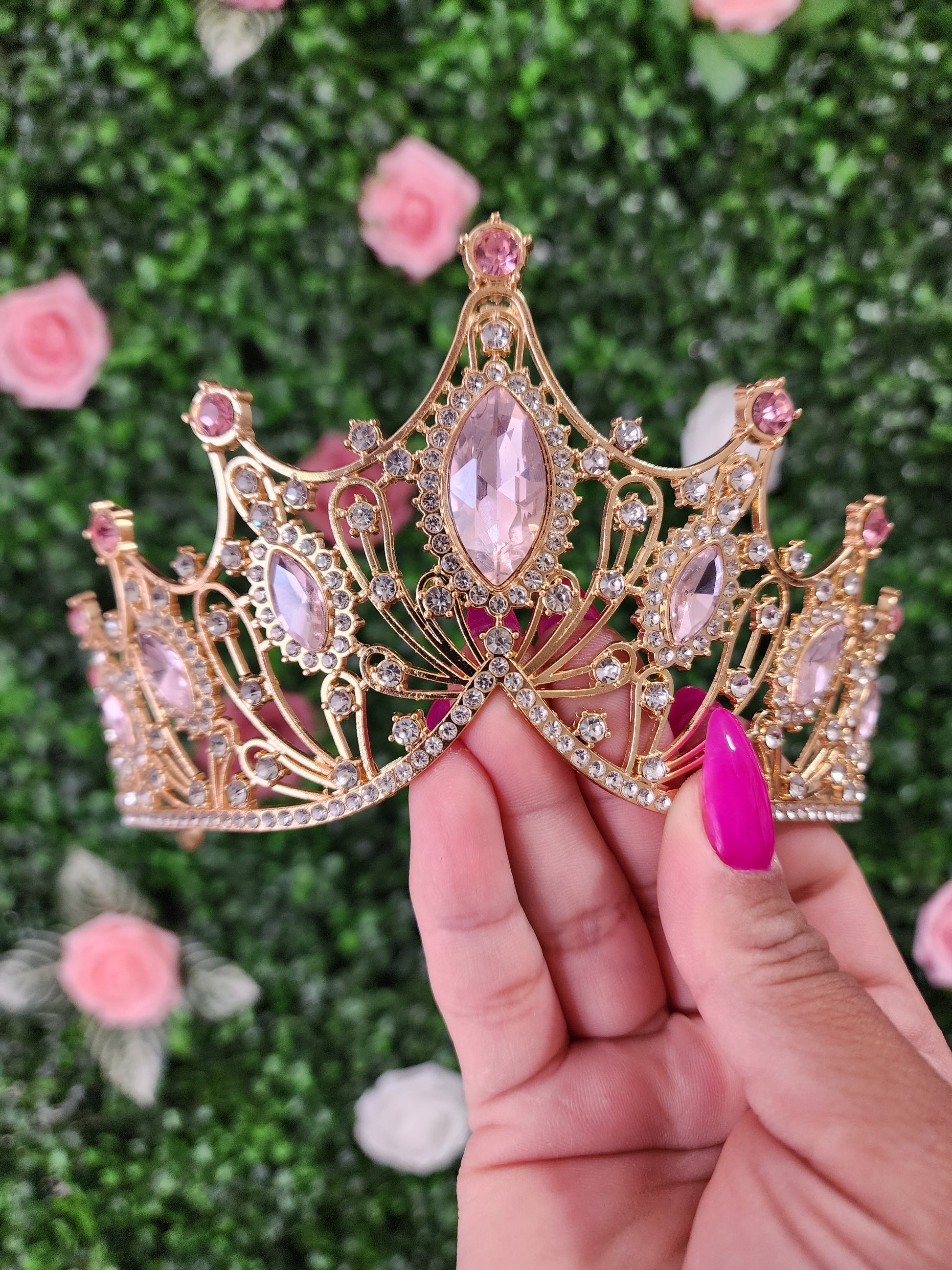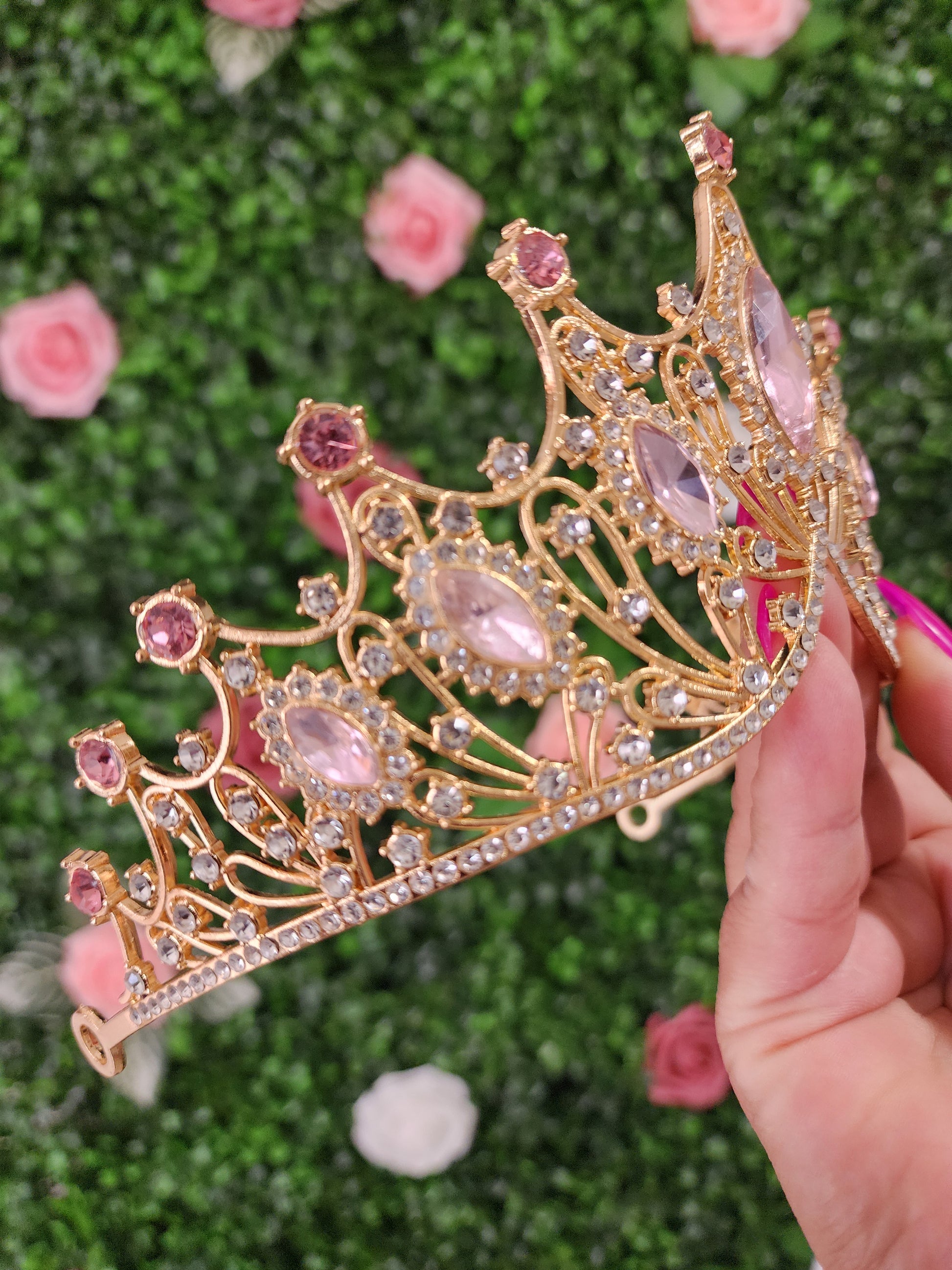 Crafted with opulent gold, this regal tiara is a mesmerizing masterpiece. Its intricate design features intricate silver embellishments that intertwine with lustrous pink rhinestones, creating a captivating harmony of colors and textures. Fit for a queen, this tiara emanates grace and sophistication, adding a touch of timeless beauty to any ensemble or occasion.