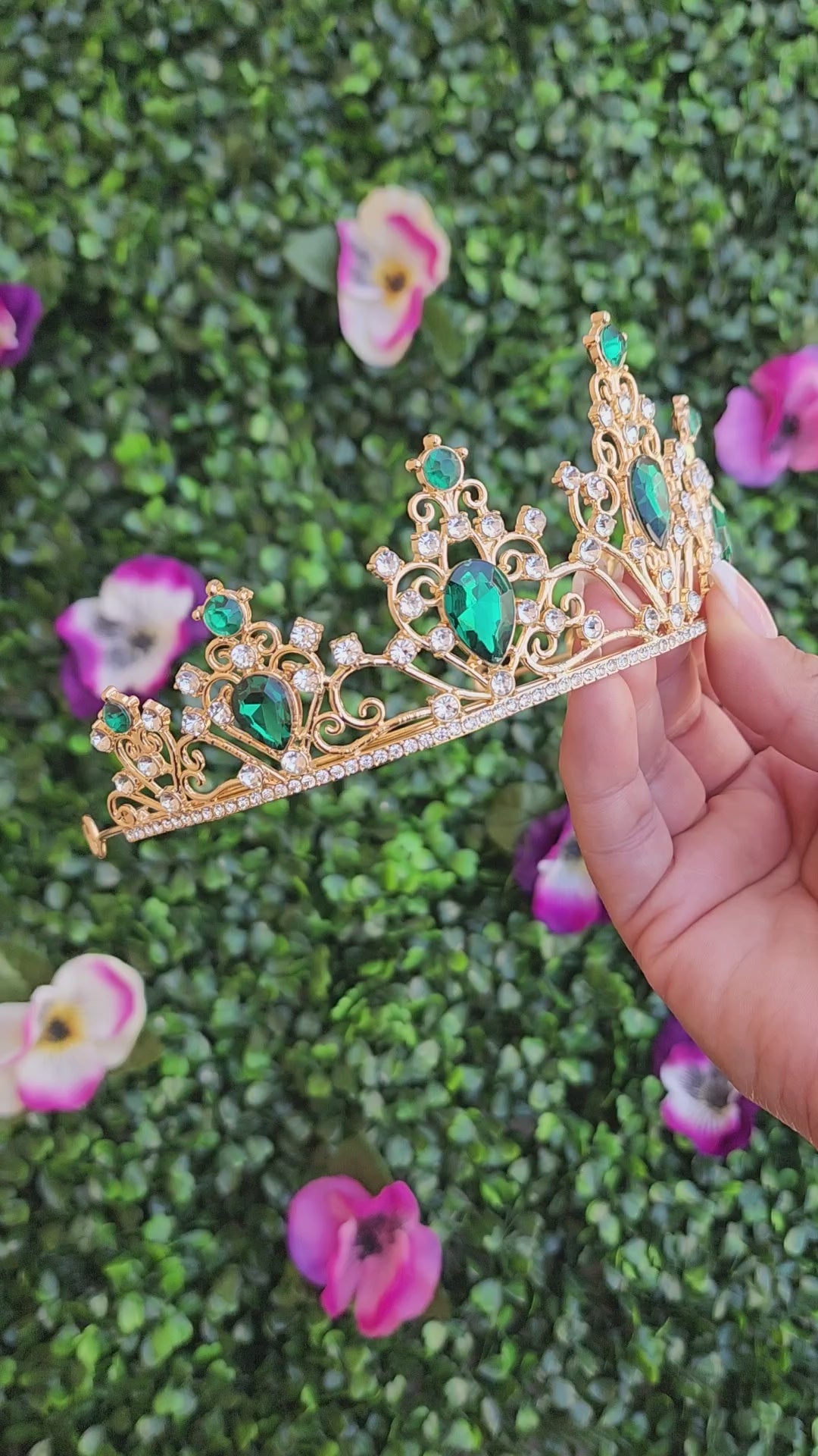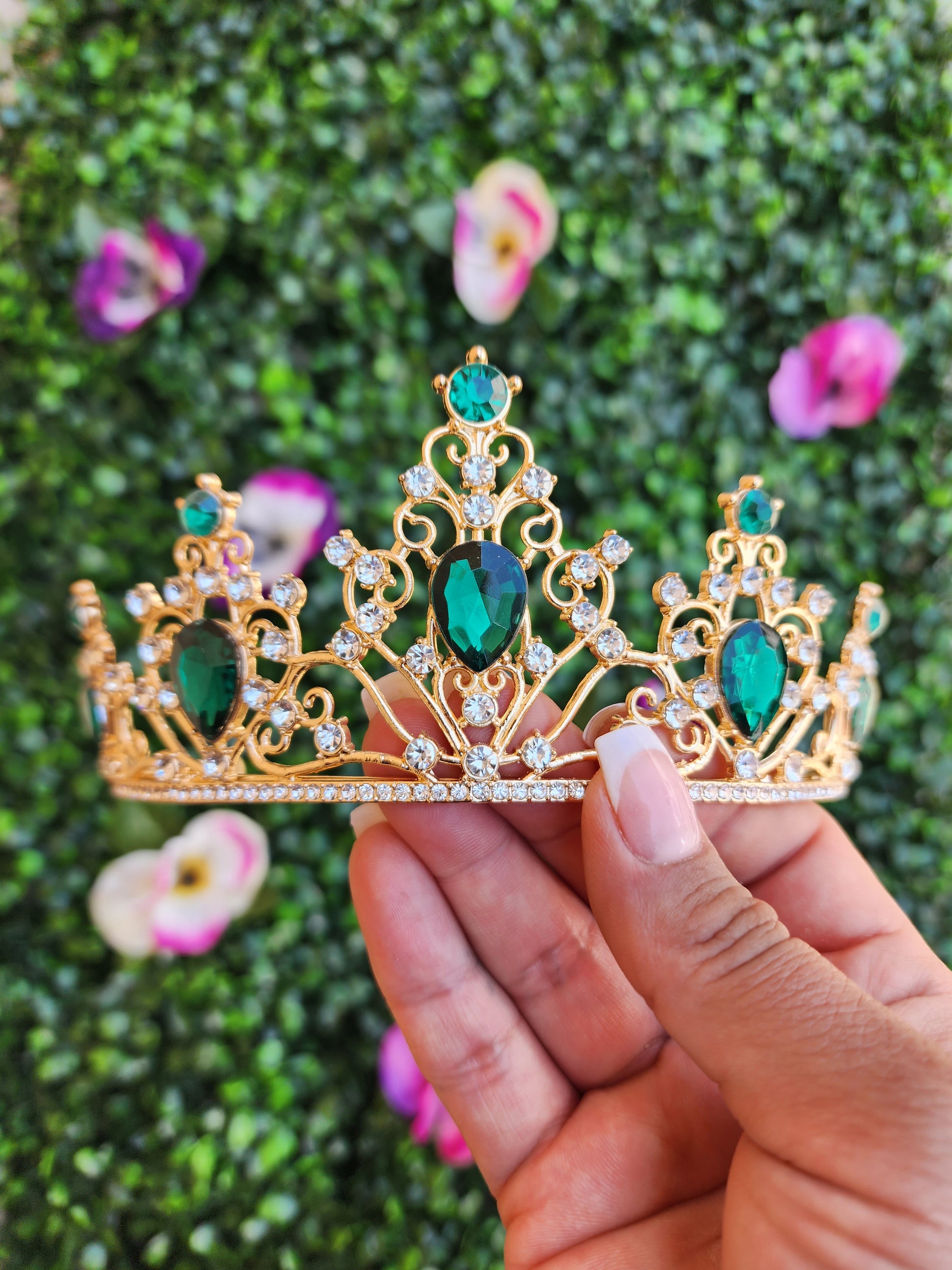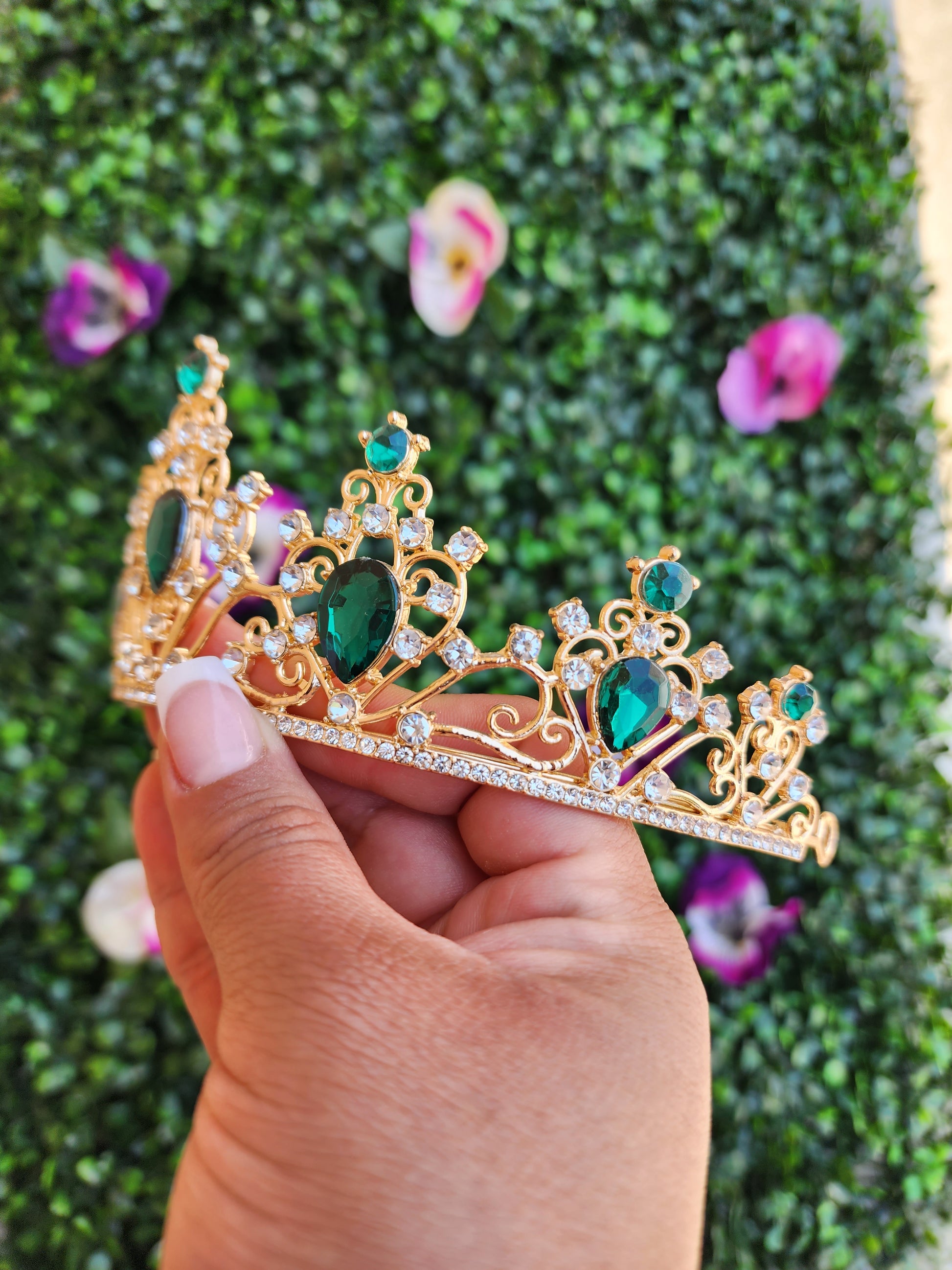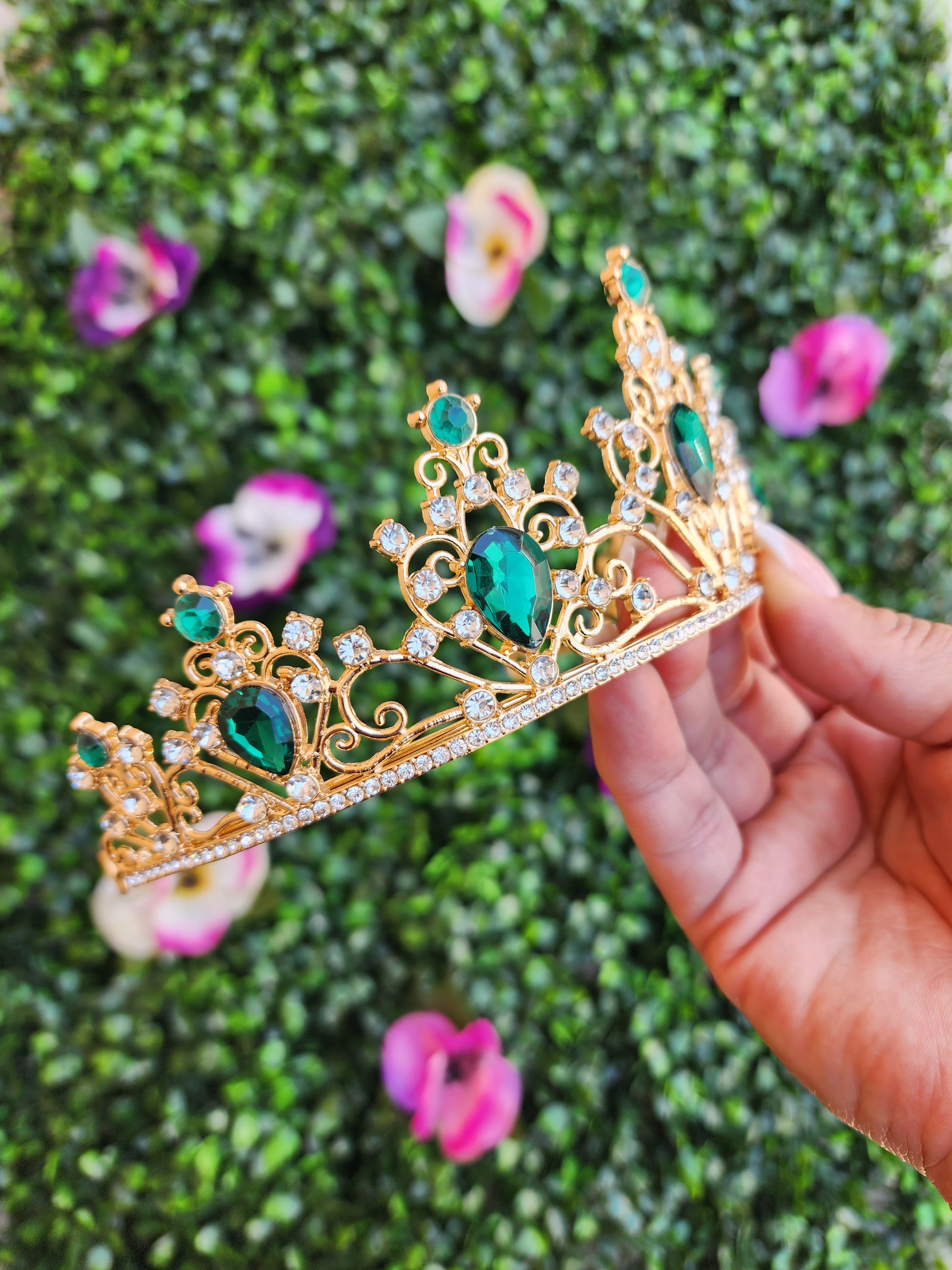 This stunning gold tiara sparkles with green and silver rhinestones and is sure to make you shine like a star! The intricate design of the tiara is perfect for any special occasions or to add a touch of glamour to any look.