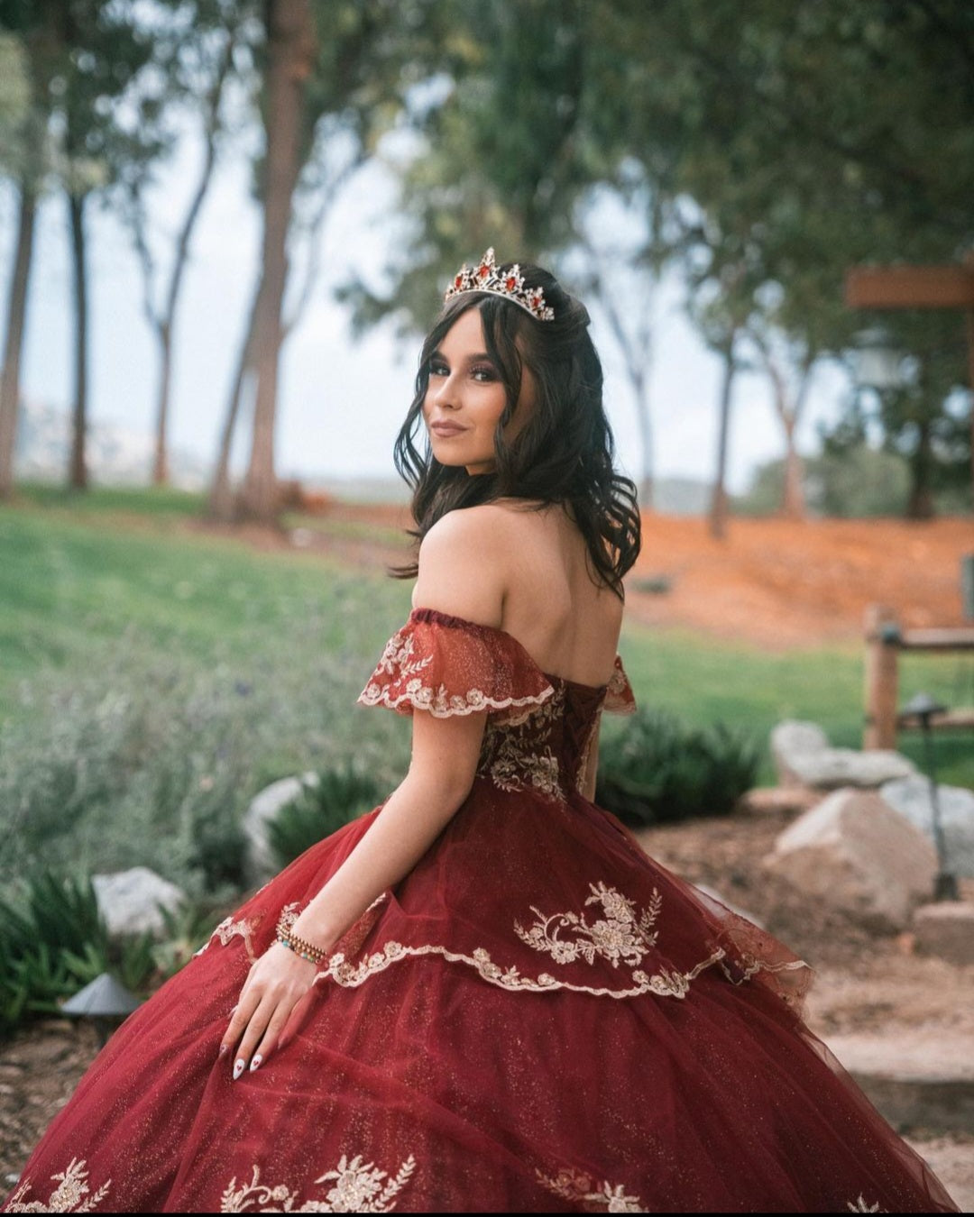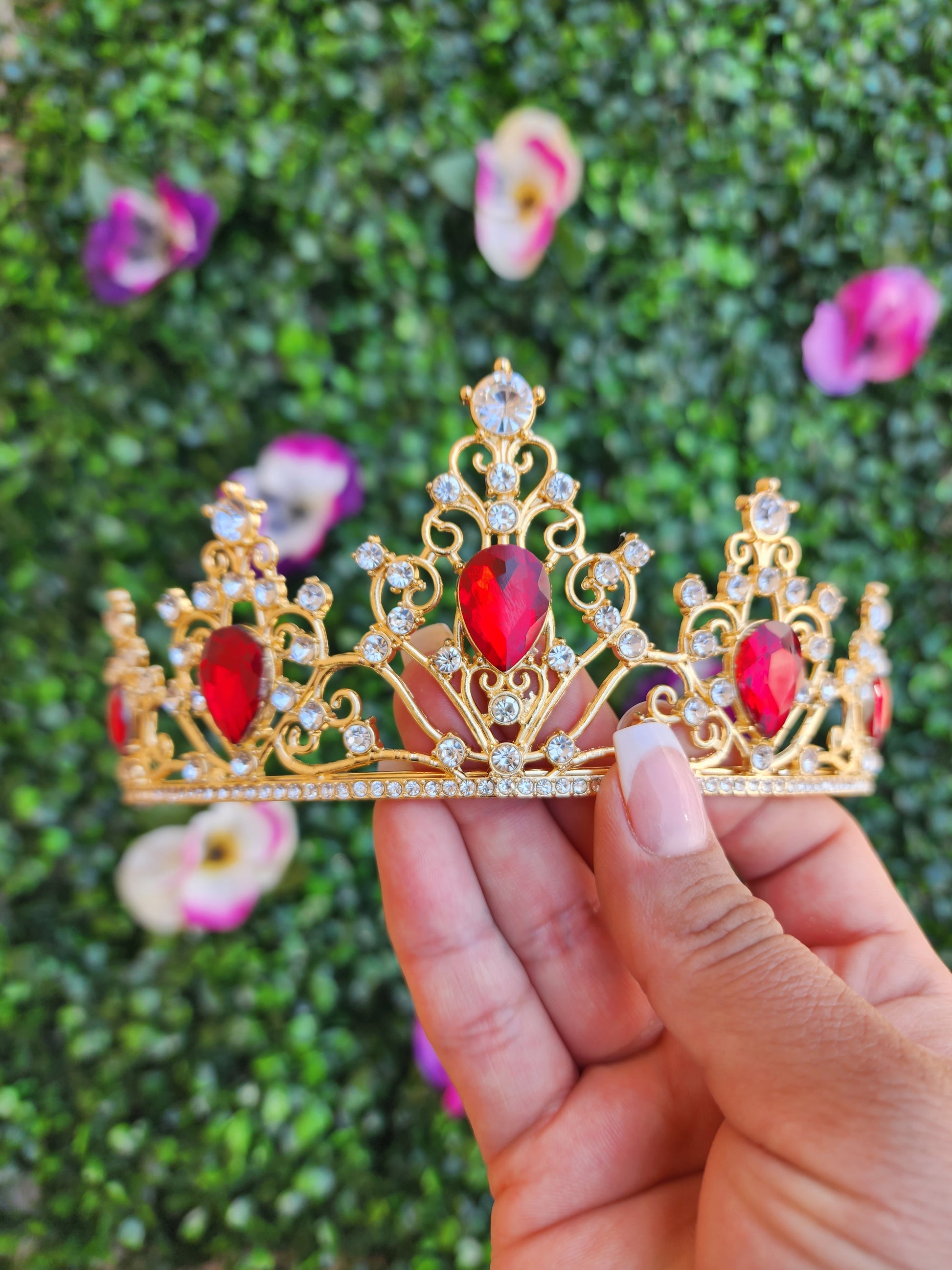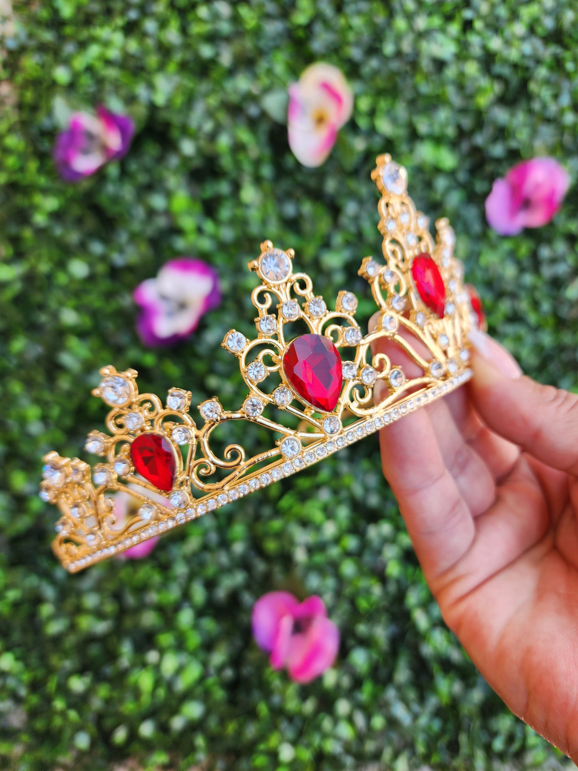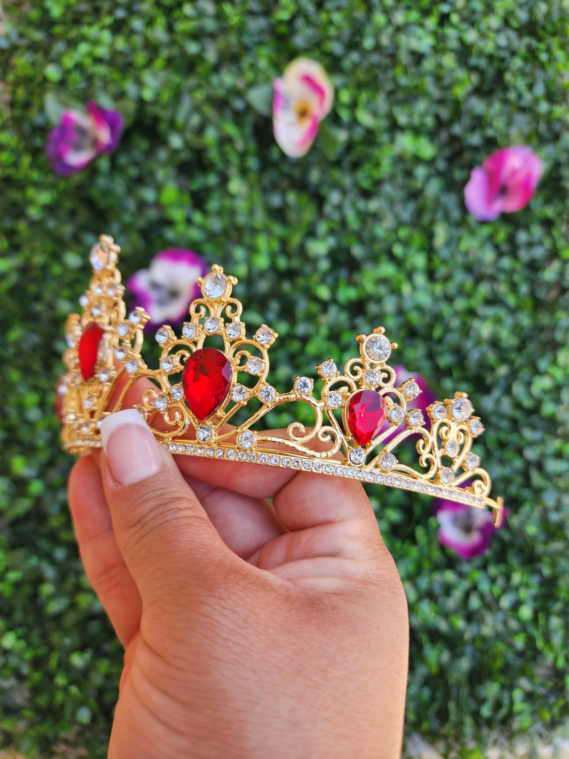 This stunning gold tiara sparkles with red and silver rhinestones and is sure to make you shine like a star! The intricate design of the tiara is perfect for any special occasions or to add a touch of glamour to any look.
