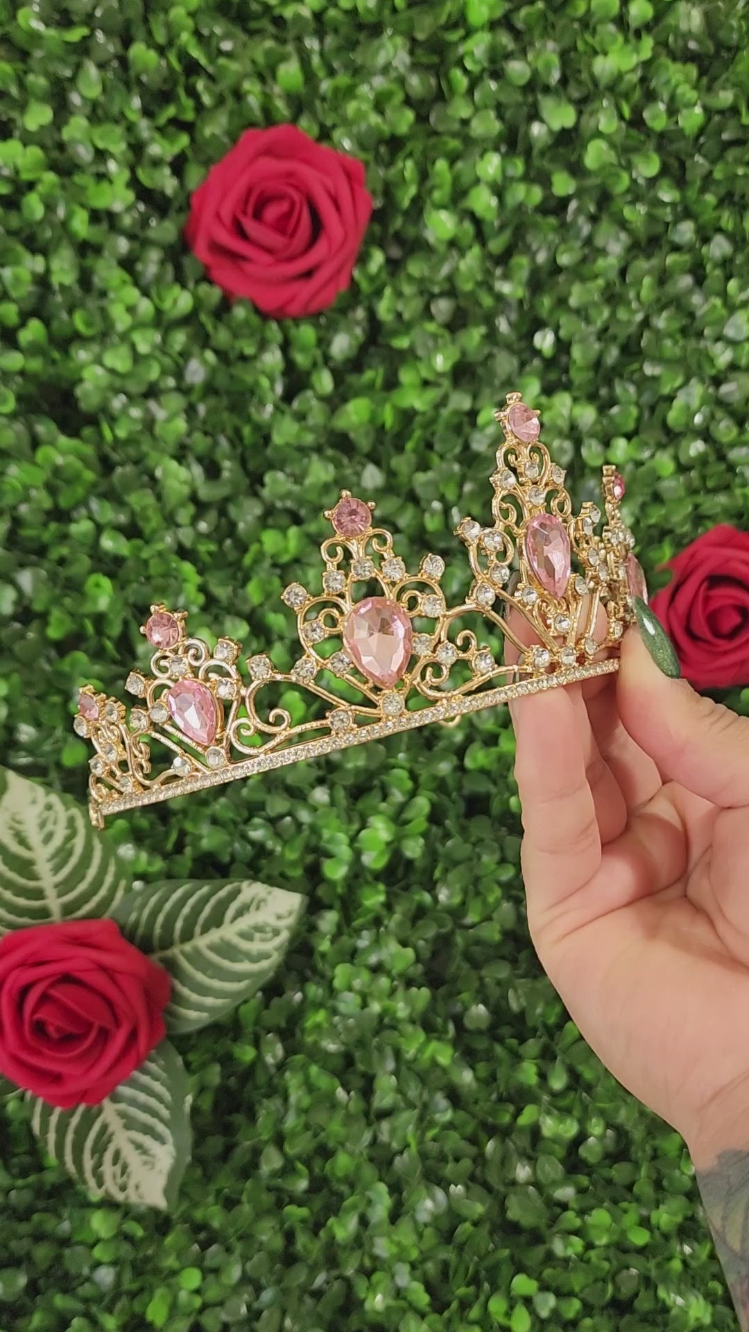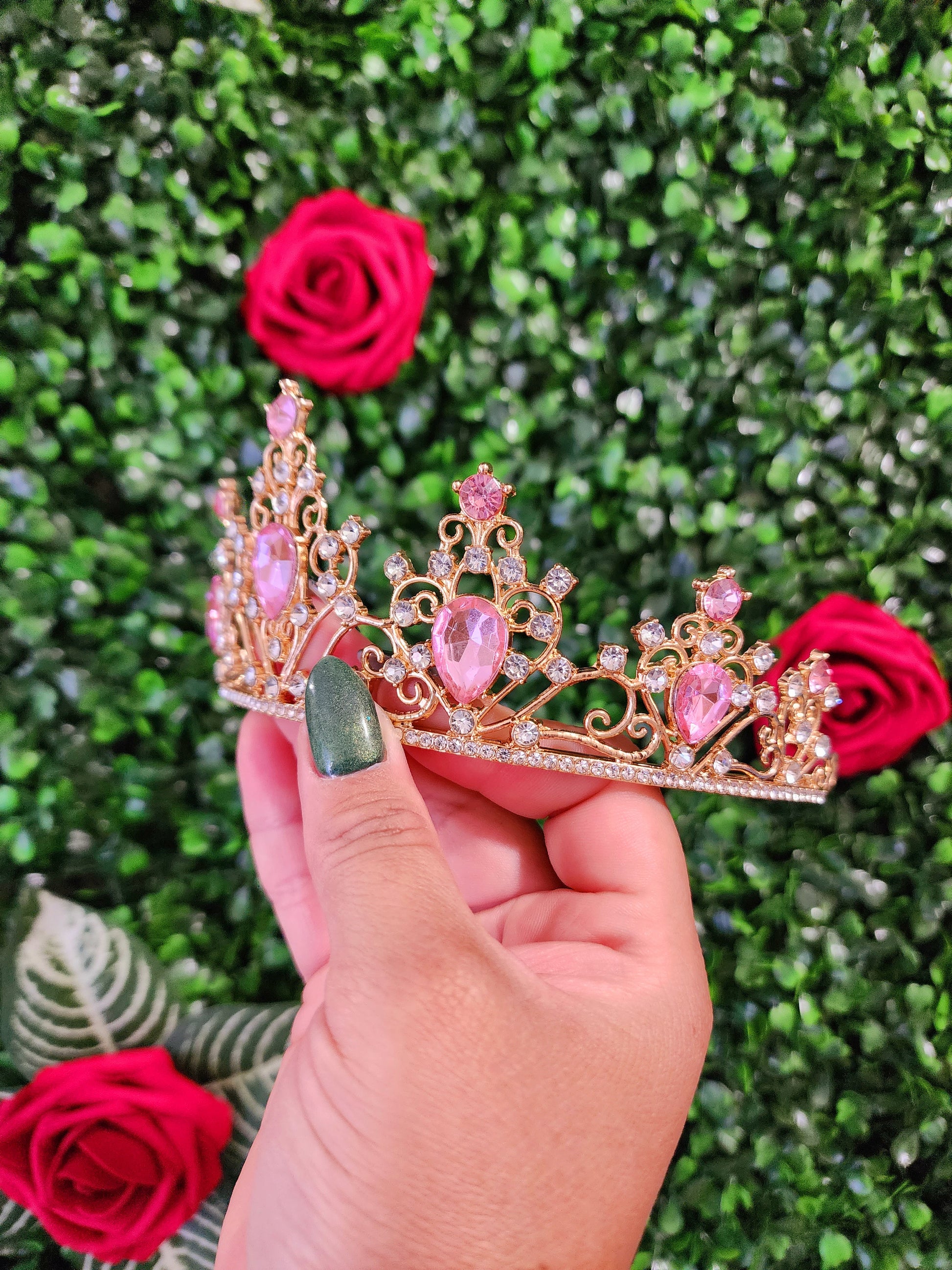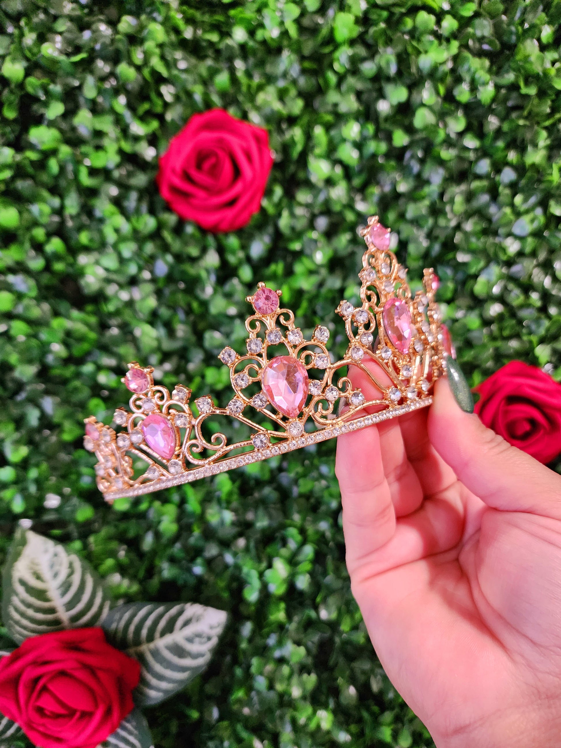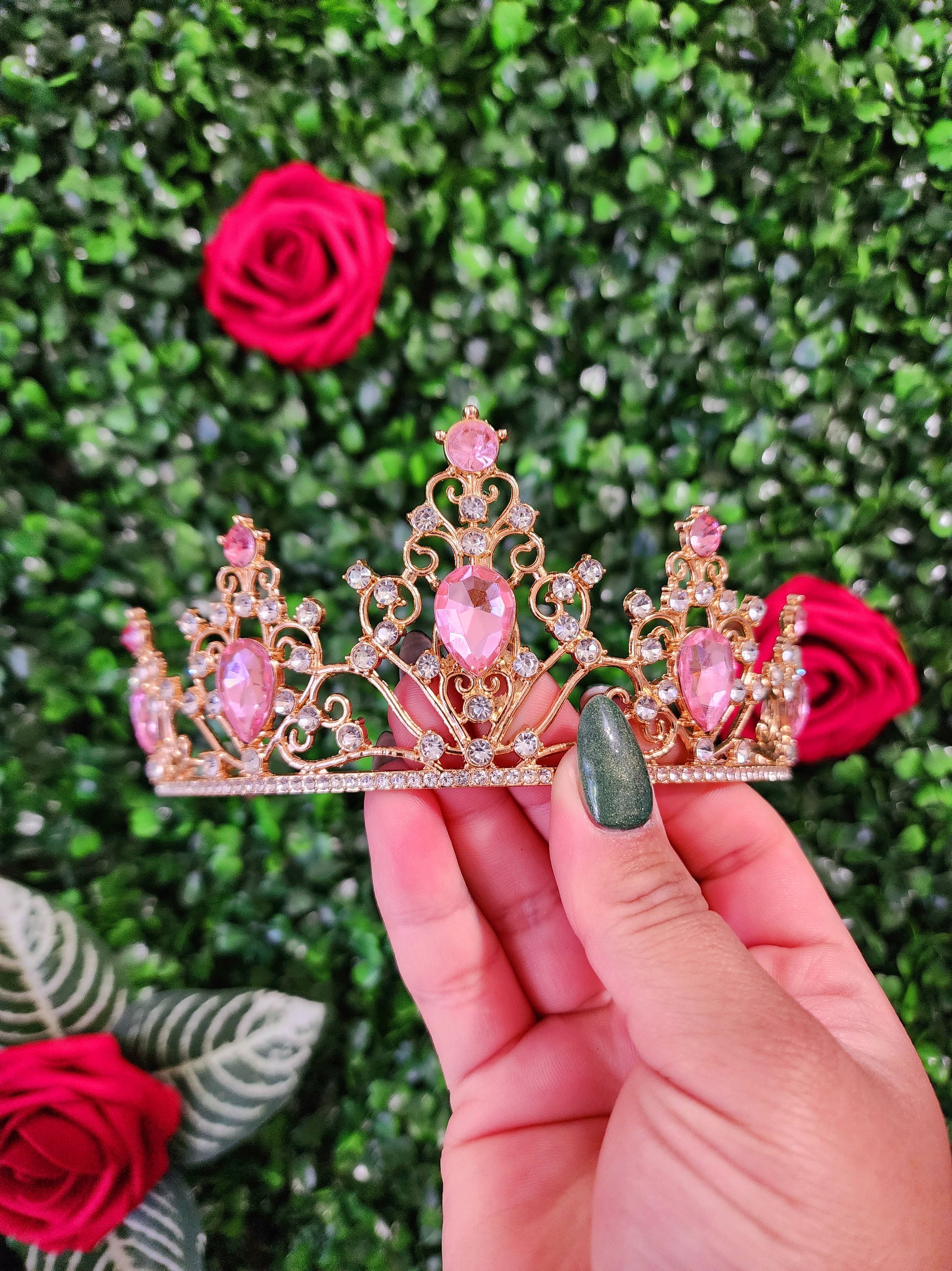 This stunning gold tiara sparkles with pink and silver rhinestones and is sure to make you shine like a star! The intricate design of the tiara is perfect for any special occasions or to add a touch of glamour to any look.