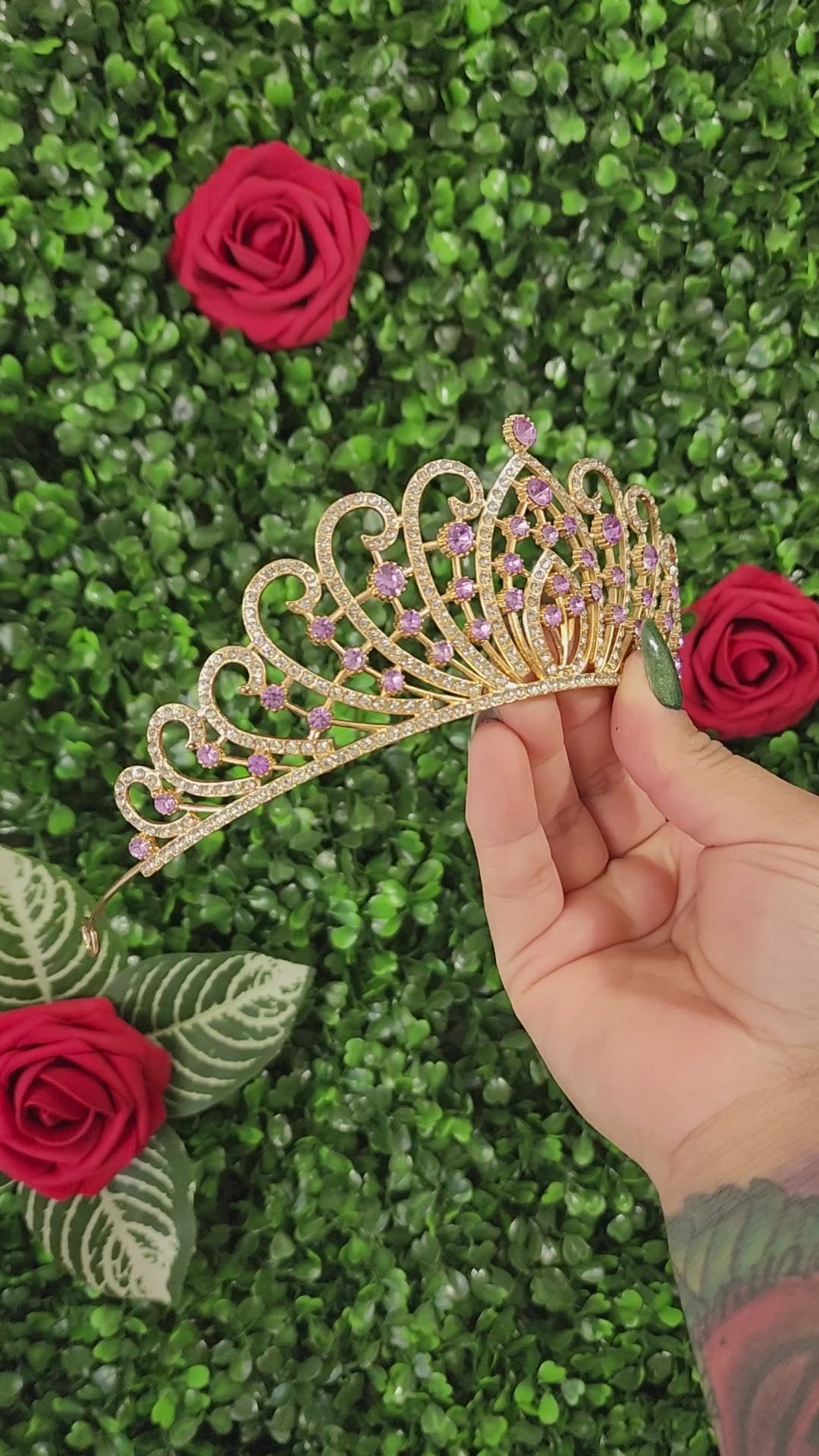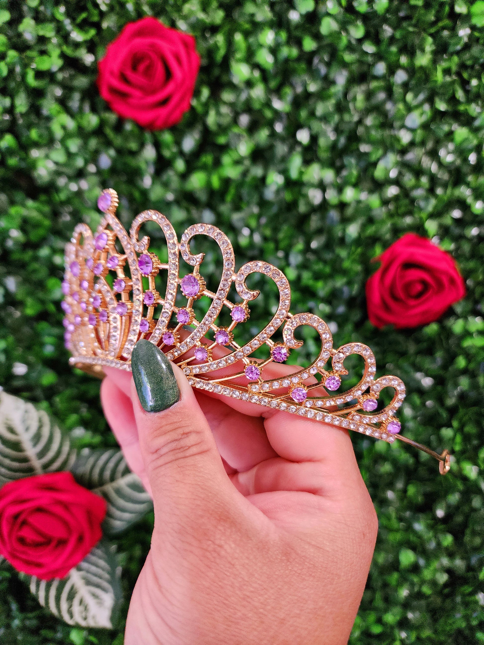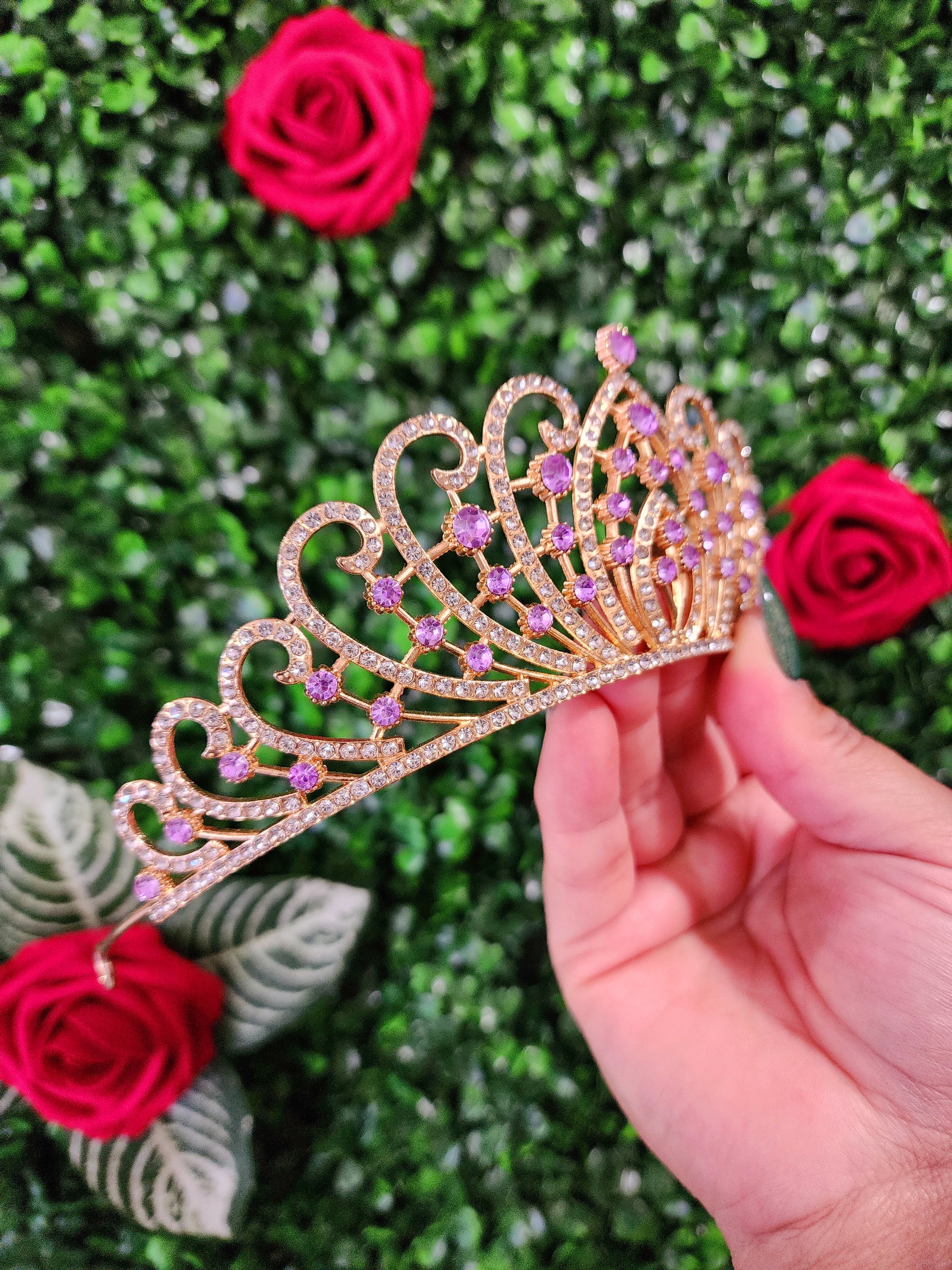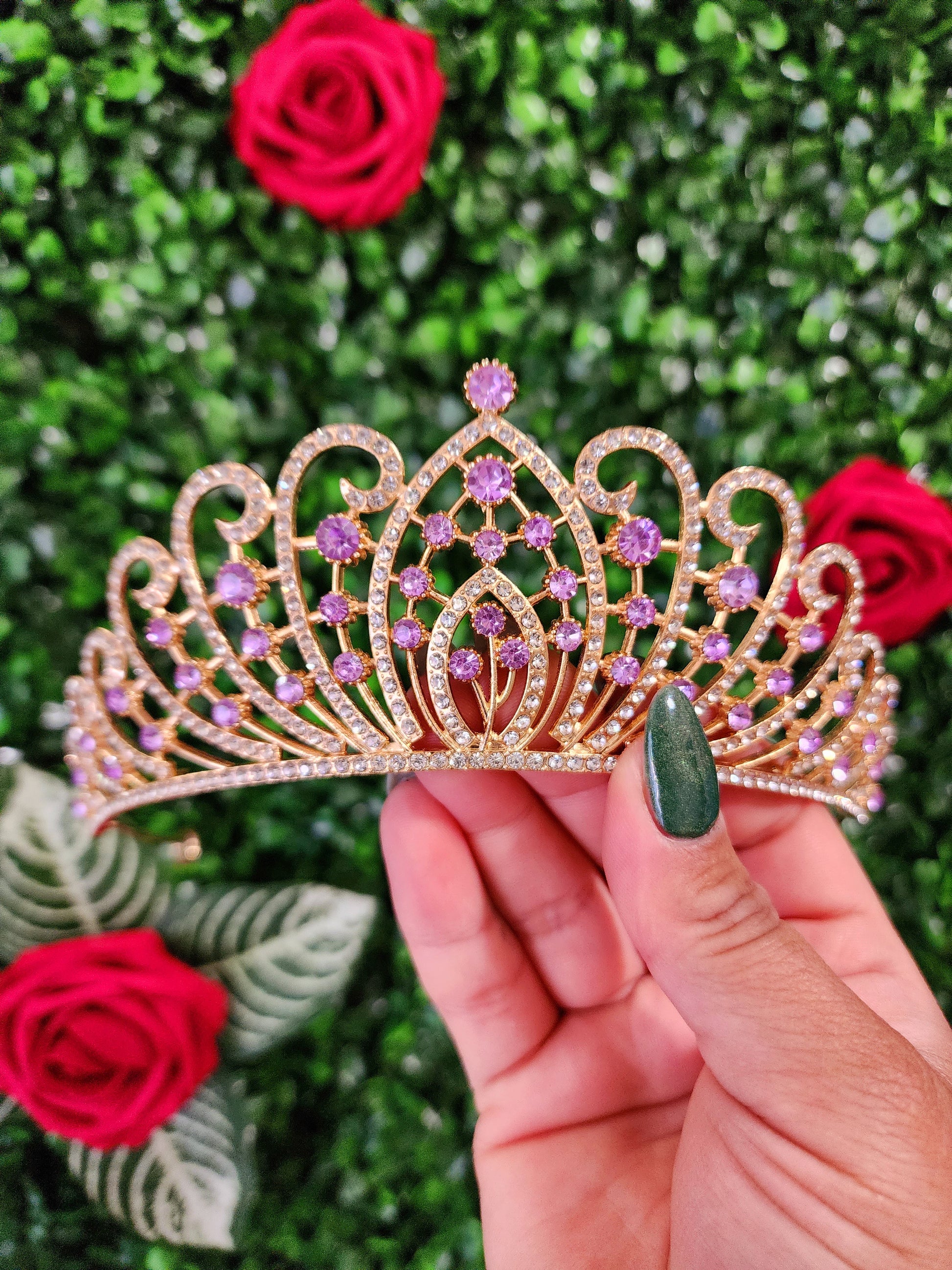 A gold and lilac tiara is a mesmerizing and opulent headpiece that blends the rich and timeless qualities of gold with the sleek and modern appeal of lilac. This unique tiara embodies a captivating fusion of tradition and contemporary design, making it a striking and versatile accessory for a wide range of occasions.