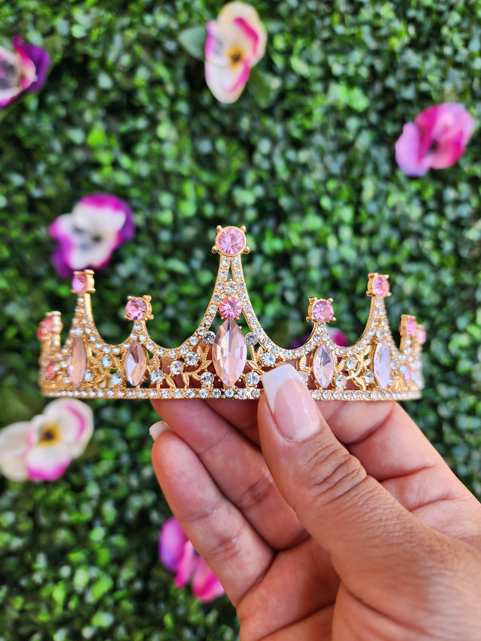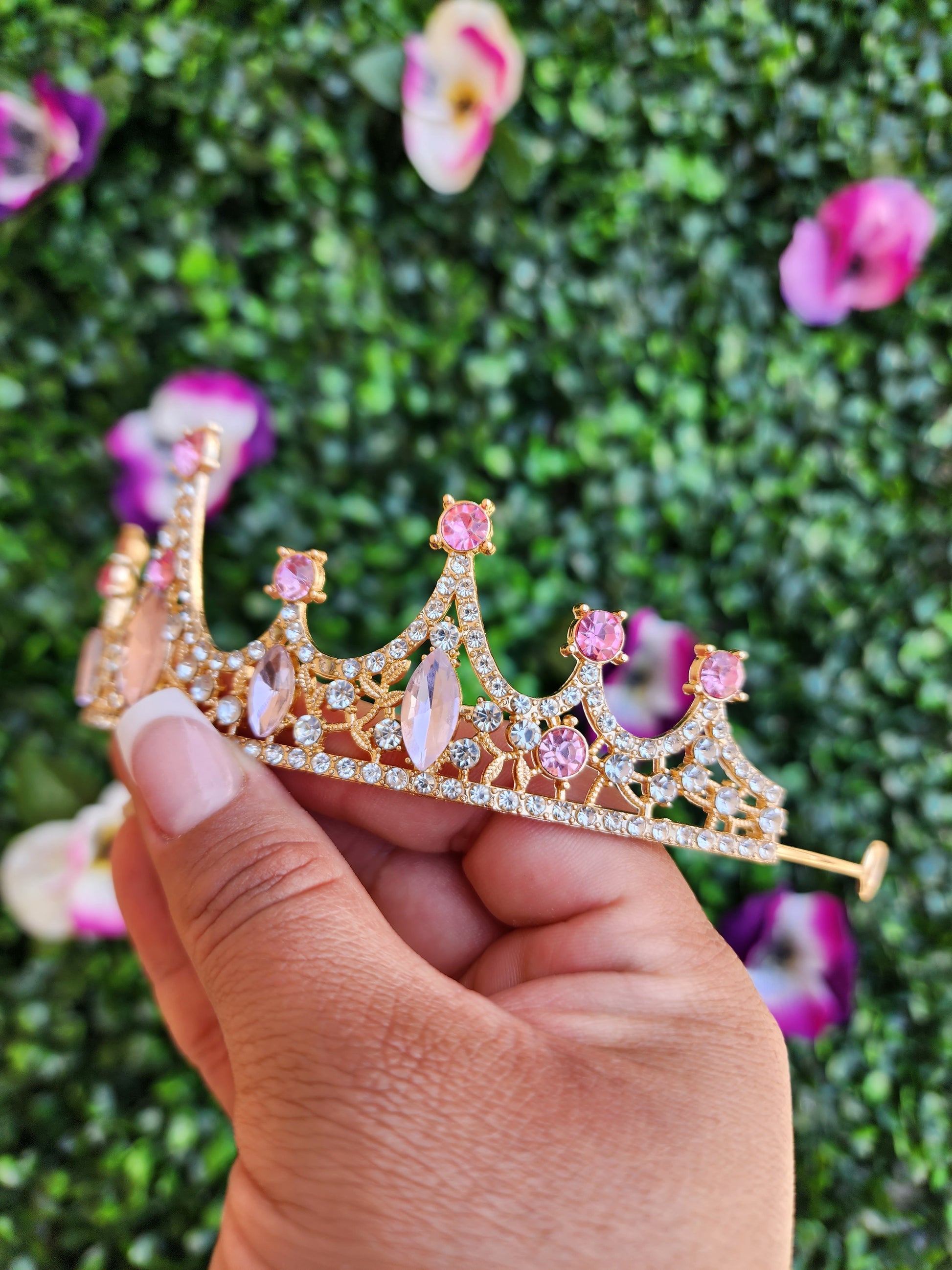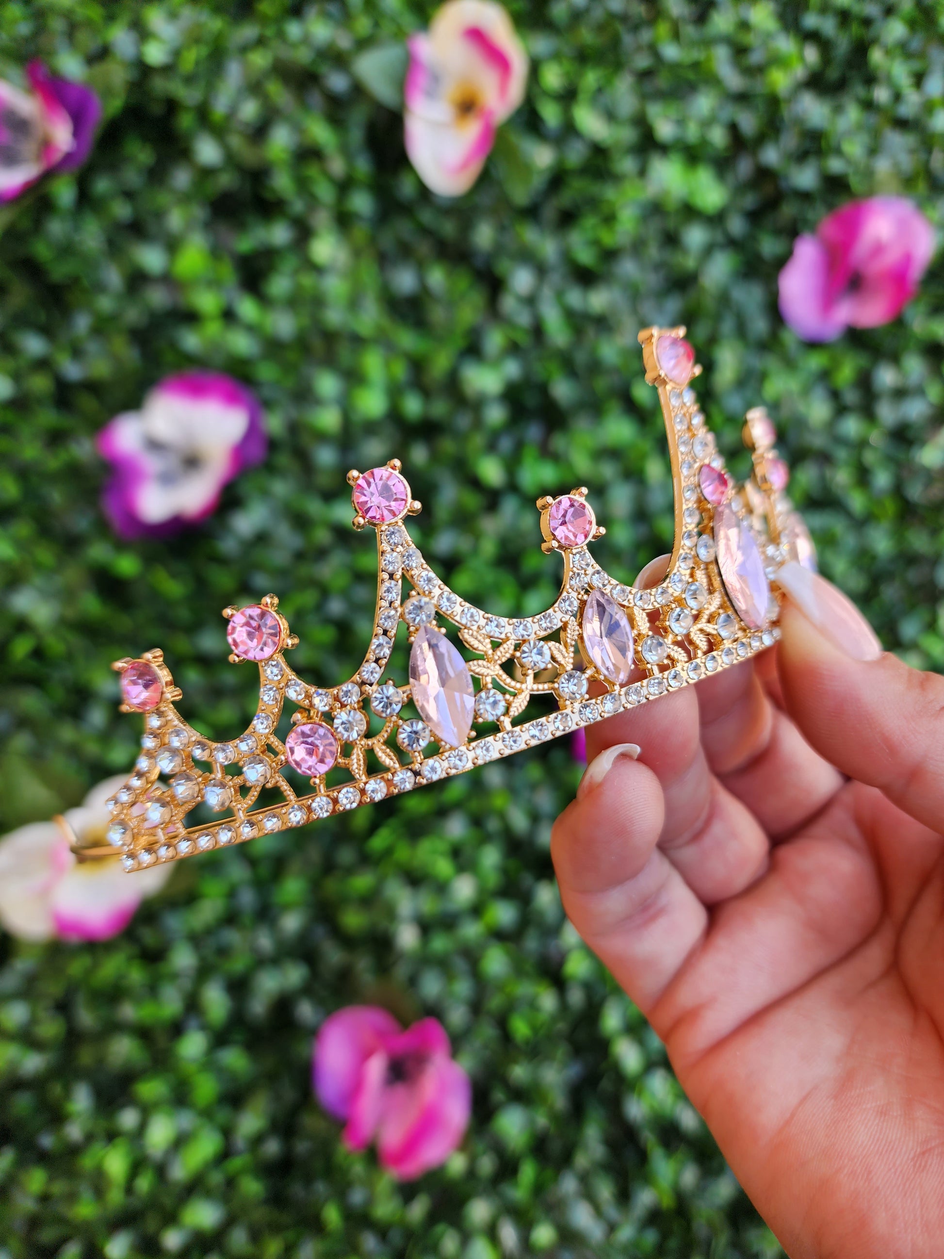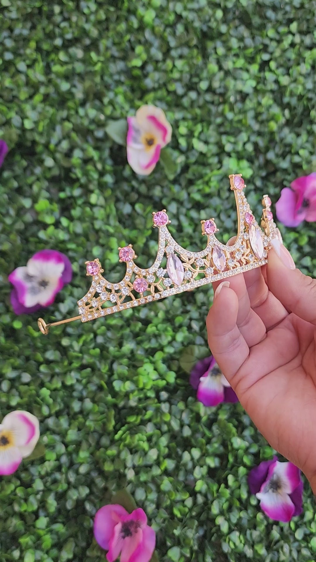 Delicate and dainty, this gold tiara is a perfect accessory for any regal look. This delicate accessory features a sleek metal frame adorned with pink and silver rhinestones.