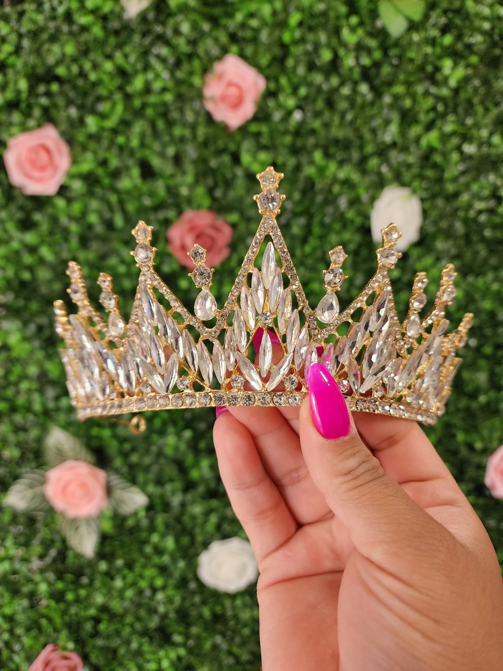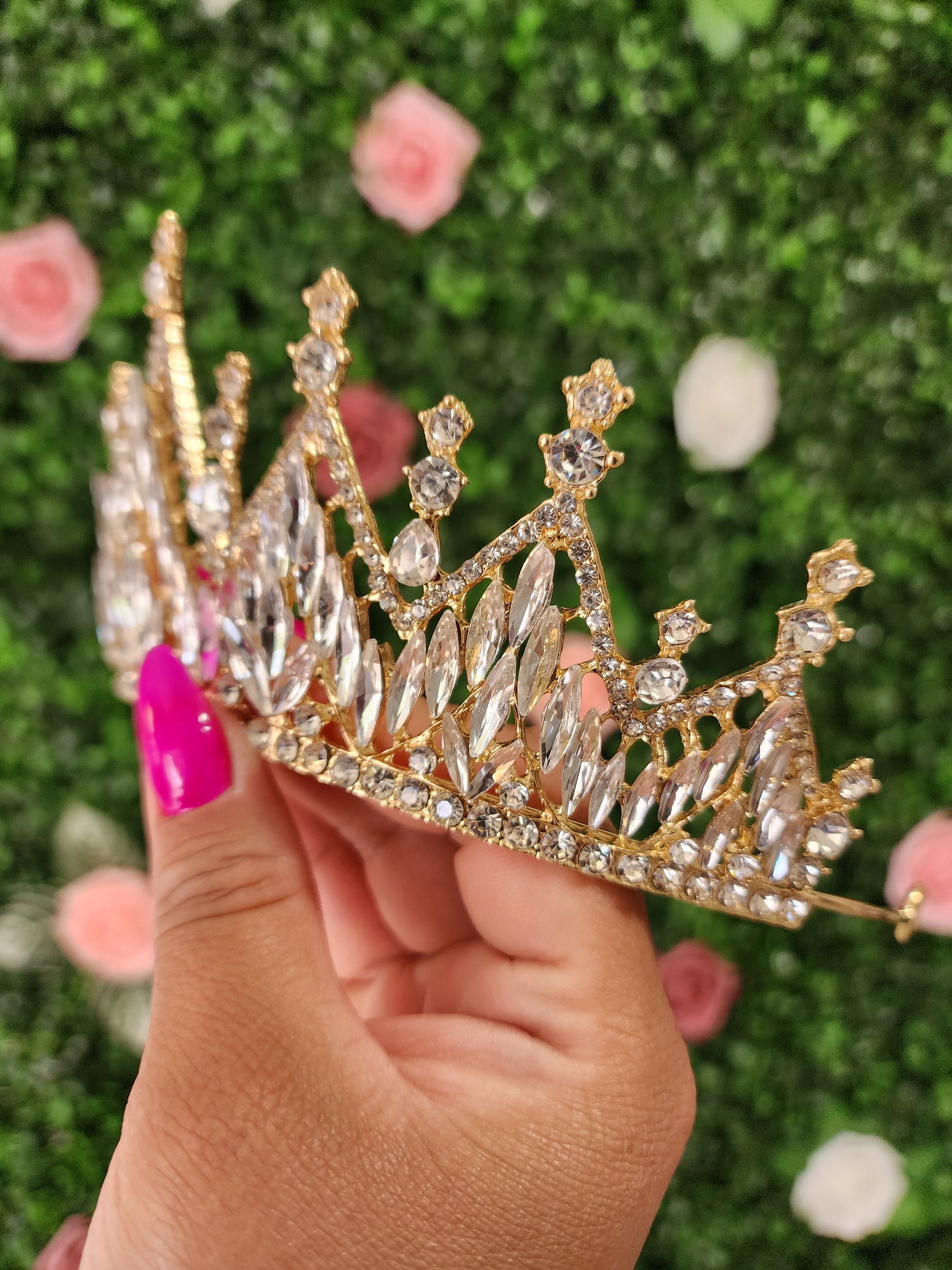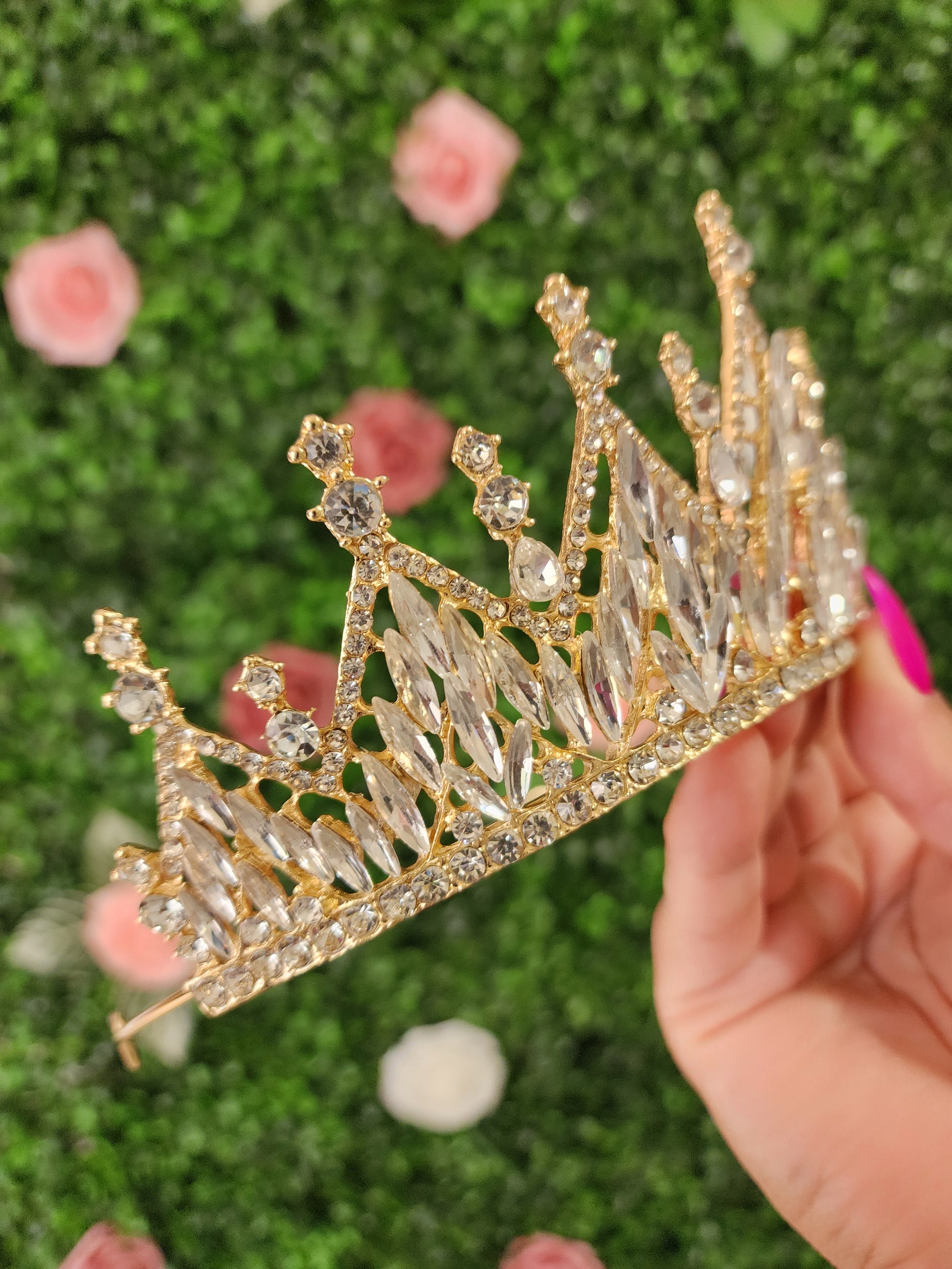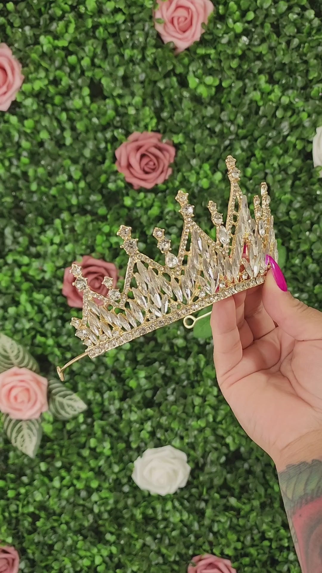Dazzle like royalty in this captivating gold tiara adorned with glistening silver ice-like rhinestones. A harmonious blend of opulence and sophistication, this tiara adds a touch of enchantment to any ensemble, ensuring you shine bright on your special day.