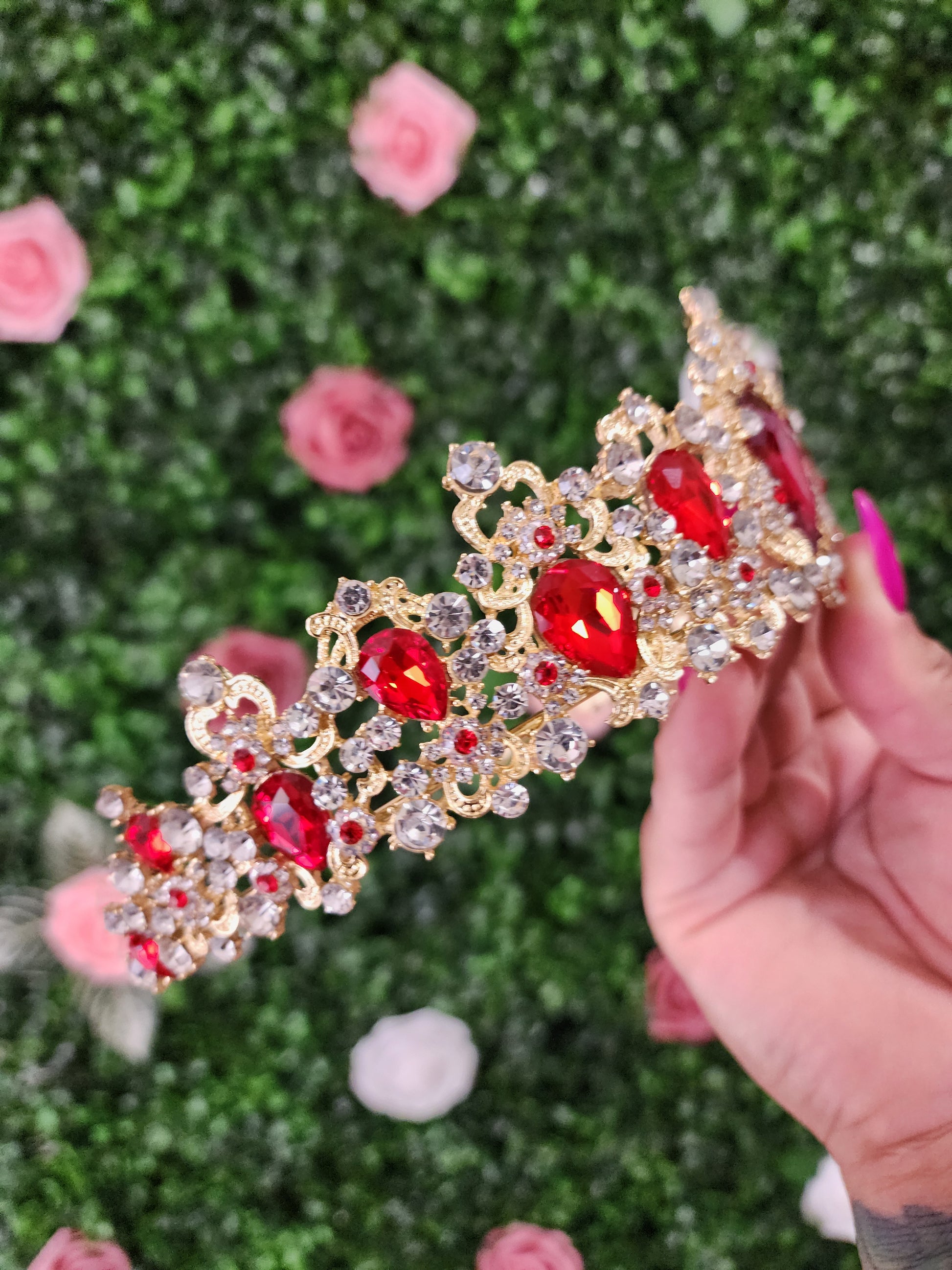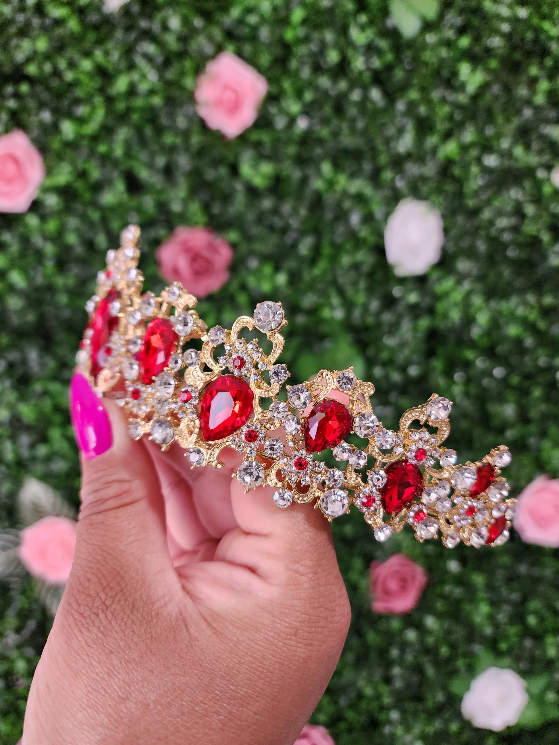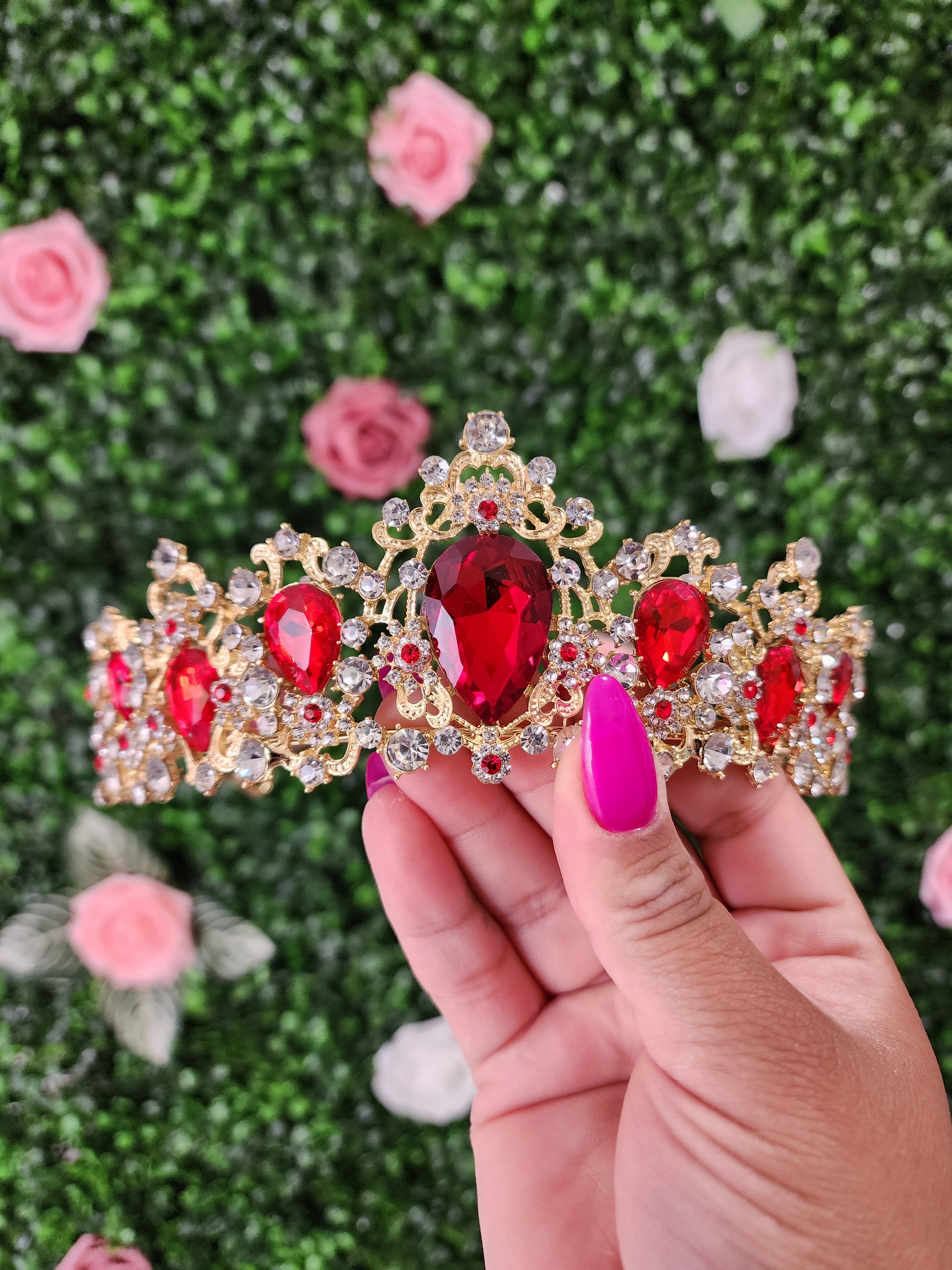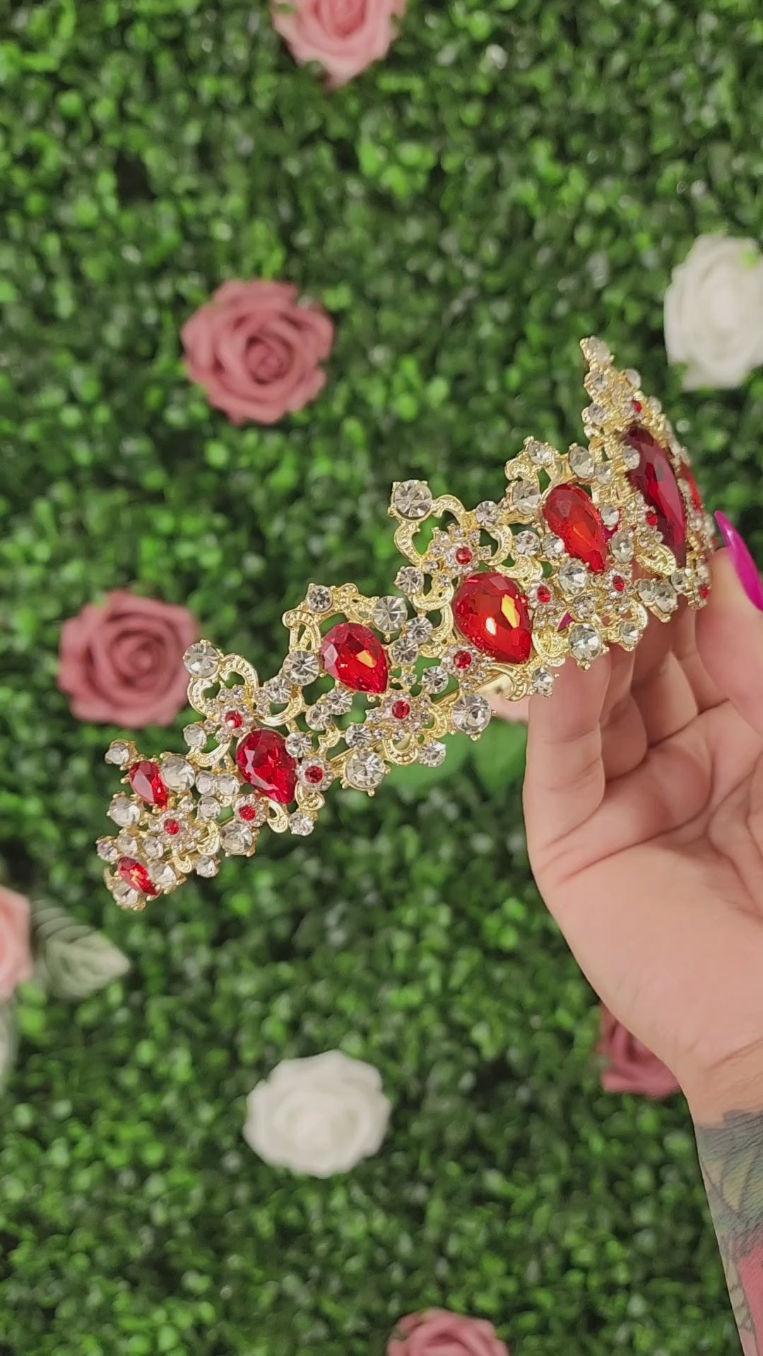 Make a statement with this striking gold tiara, featuring a captivating arrangement of small red, medium silver, and large red rhinestones. Effortlessly blending glamour with sophistication, this tiara is the epitome of regal elegance, perfect for adding a touch of boldness to any ensemble.