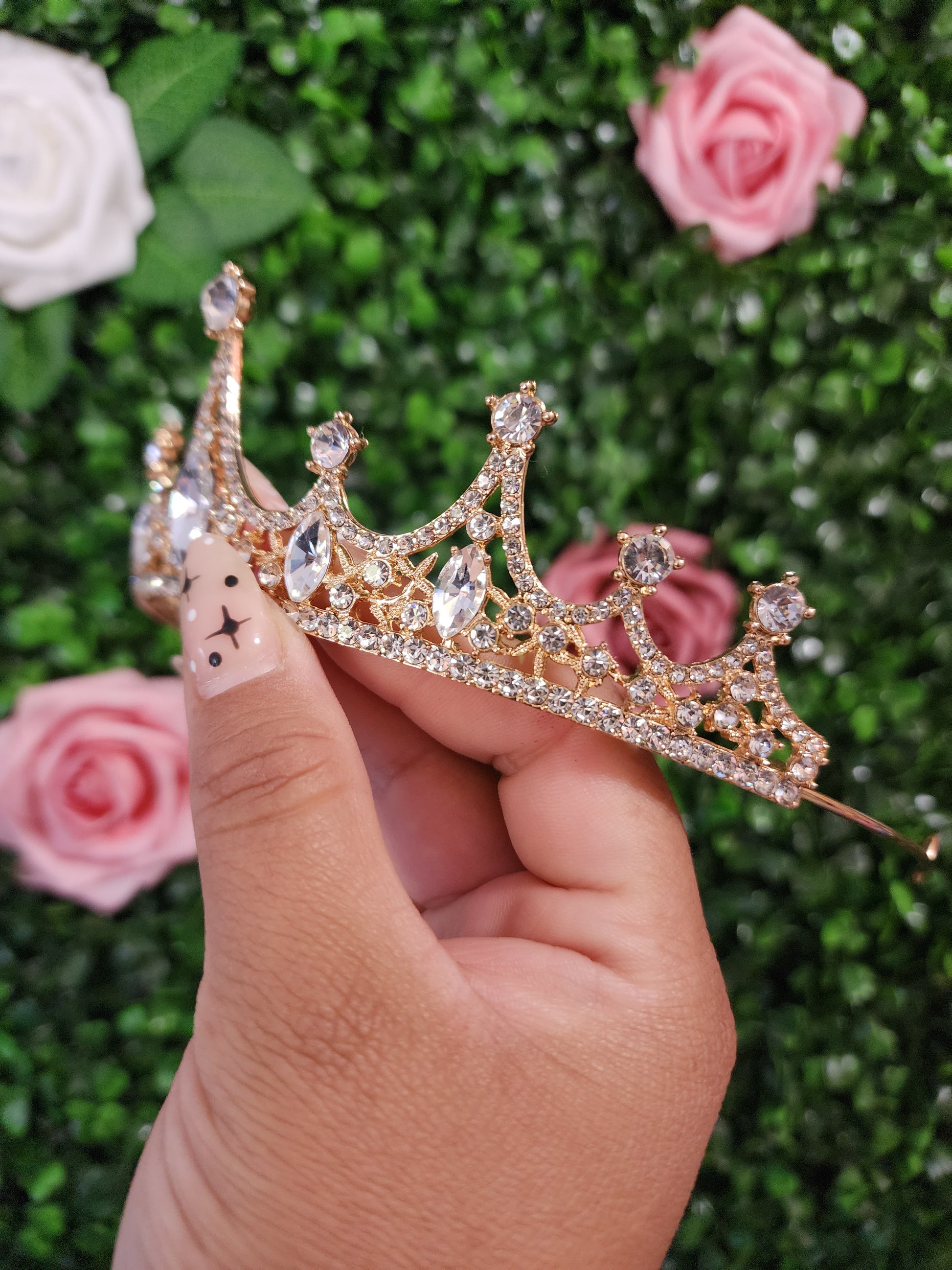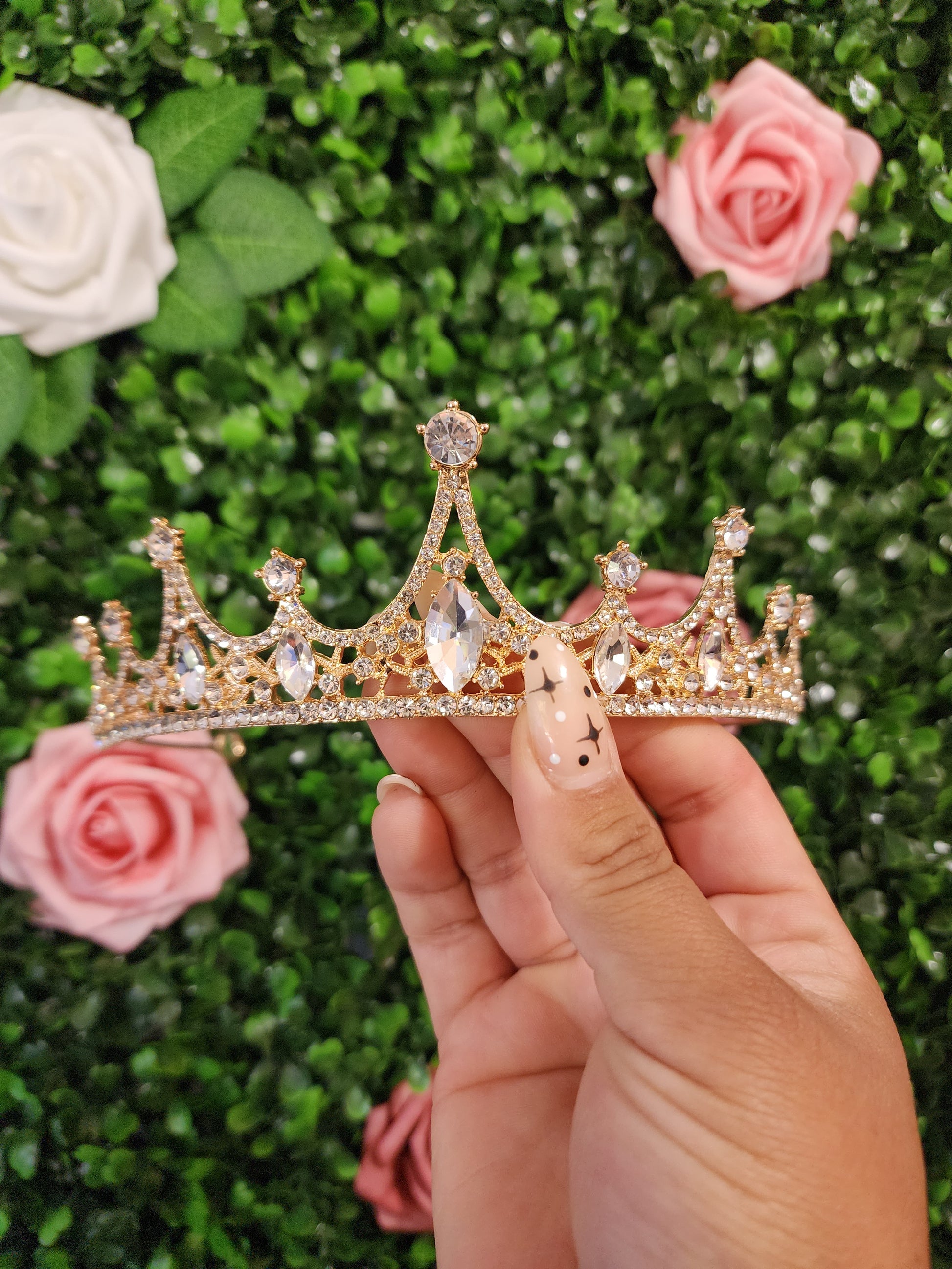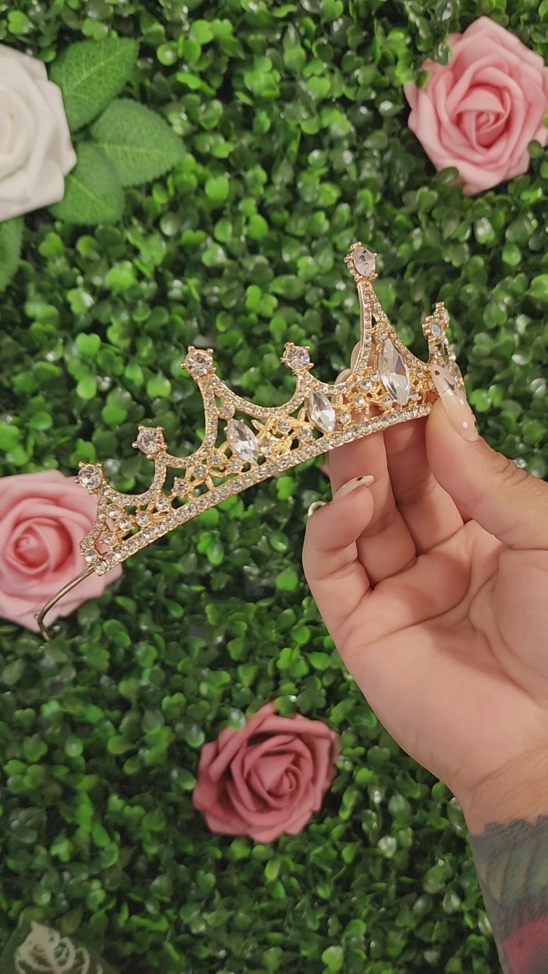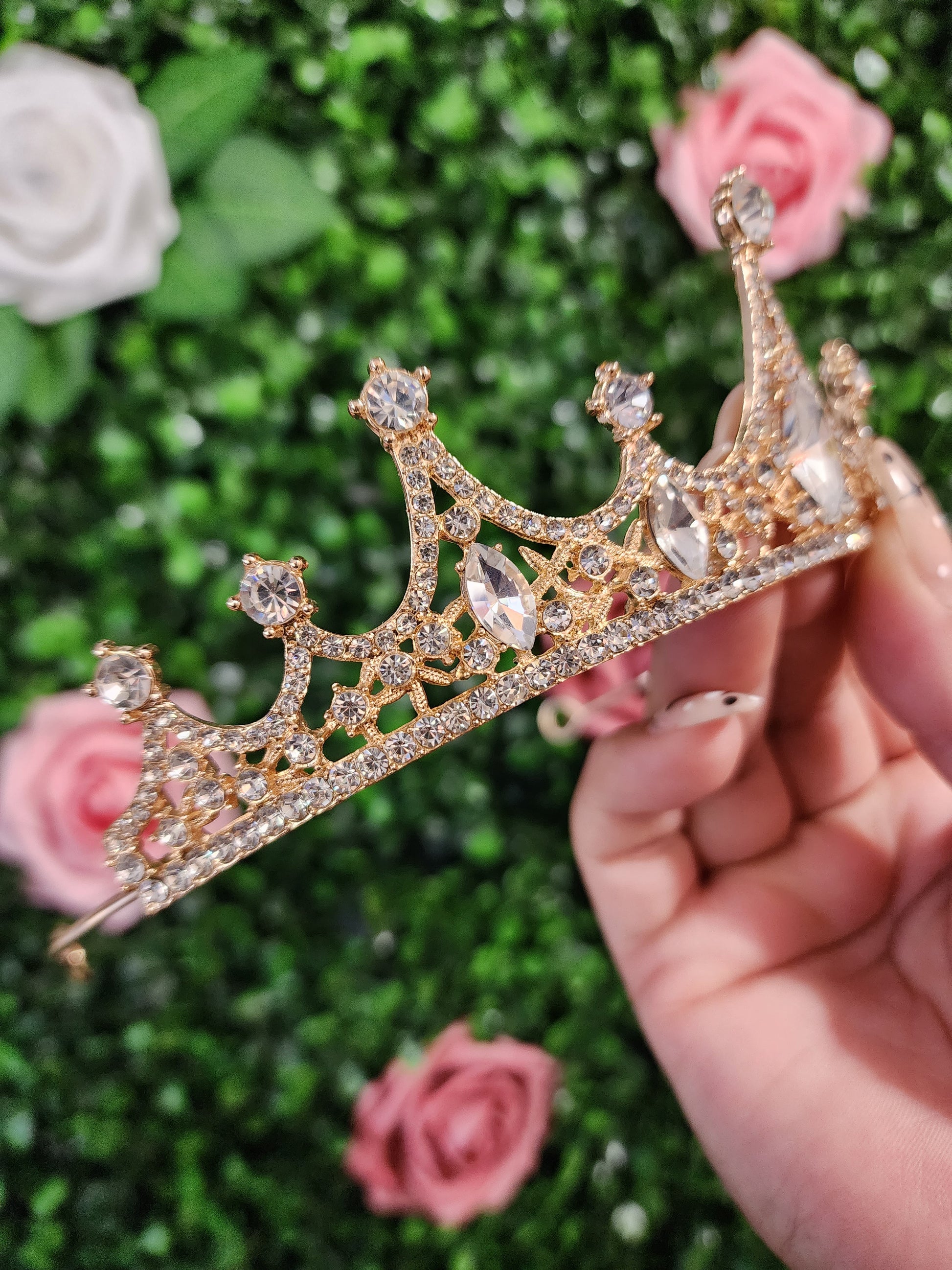 Delicate and dainty, this gold tiara is a perfect accessory for any regal look. This delicate accessory features a sleek metal frame adorned with silver rhinestones.