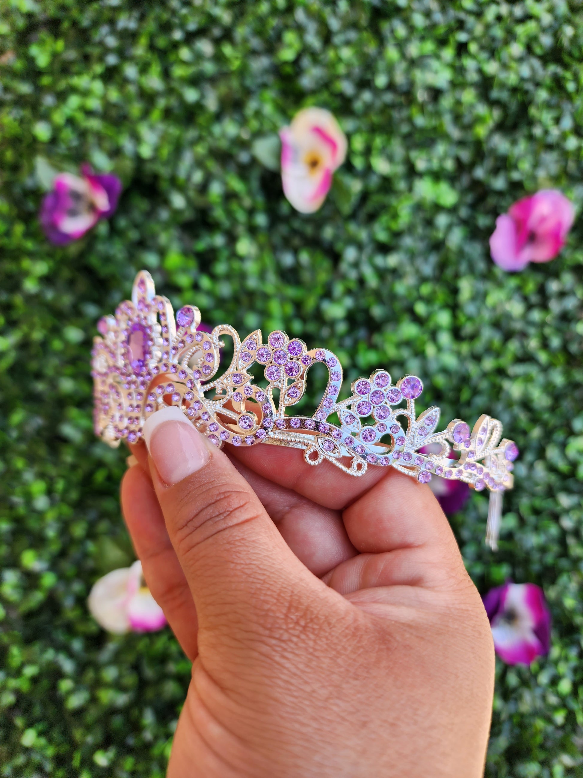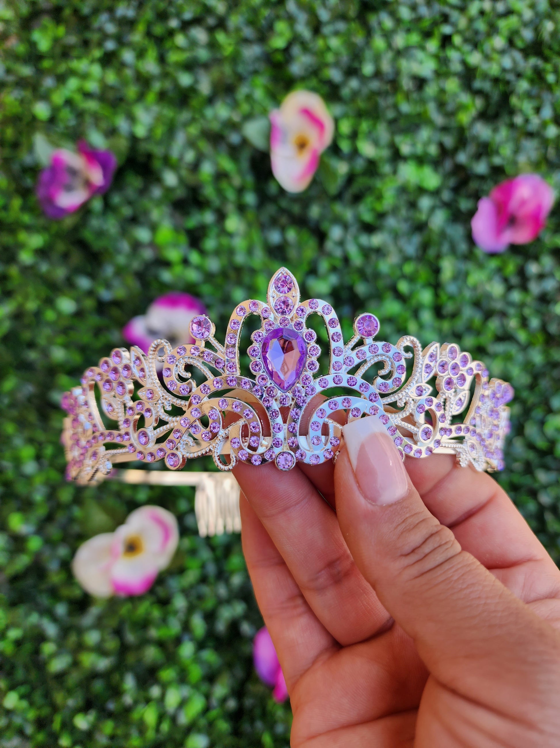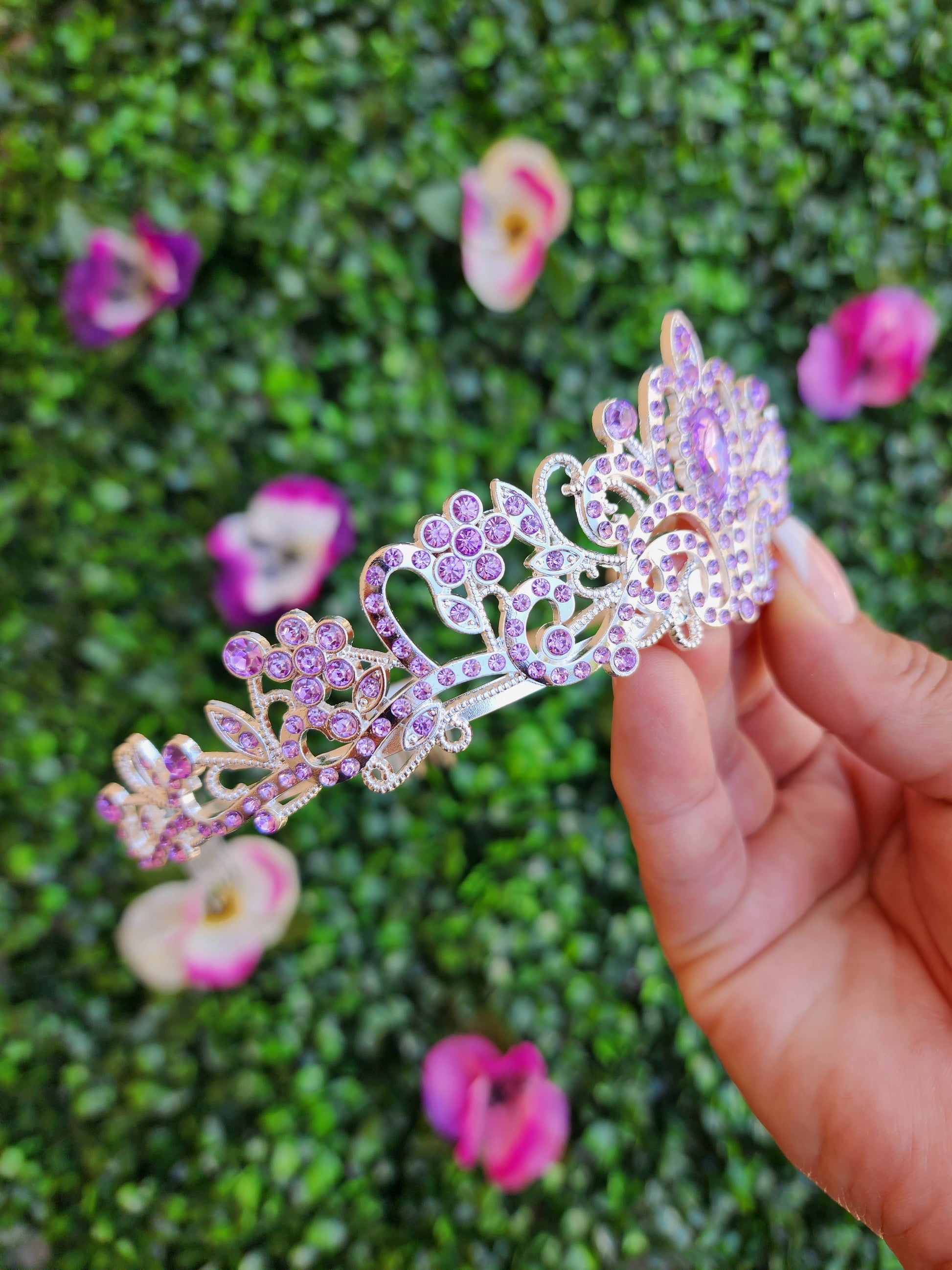 This kids' size lilac tiara with hair combs is a charming and delightful headpiece designed to make young ones feel like little royalty. This adorable tiara is crafted for children and combines the whimsical appeal of lilac and silver.
