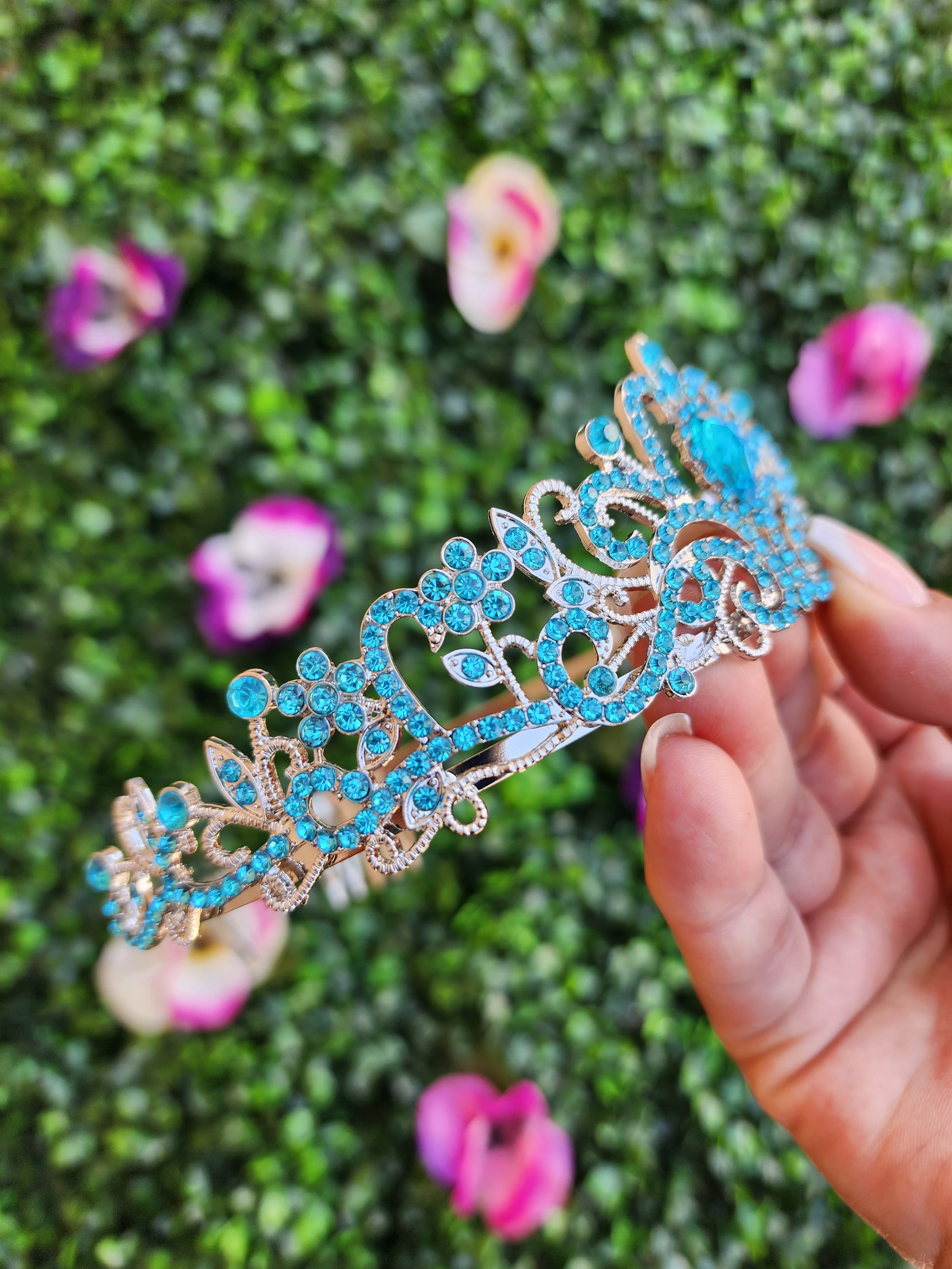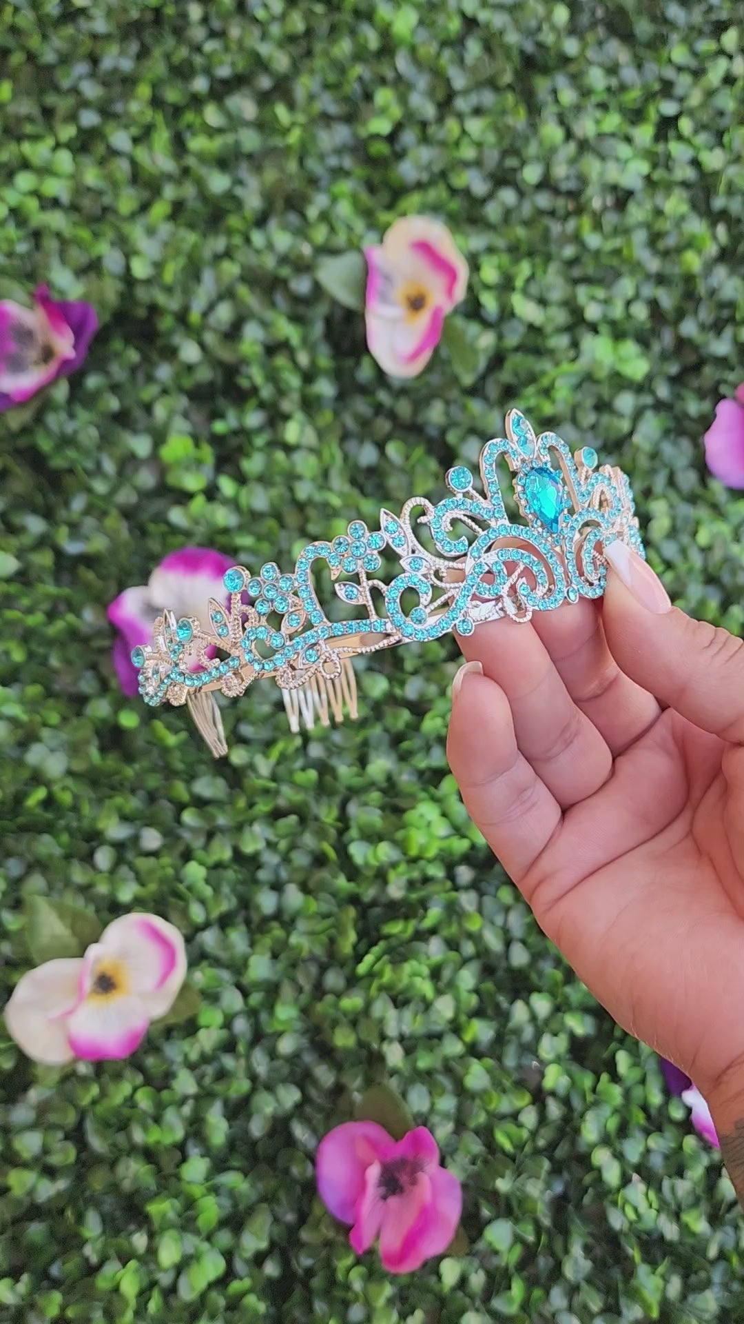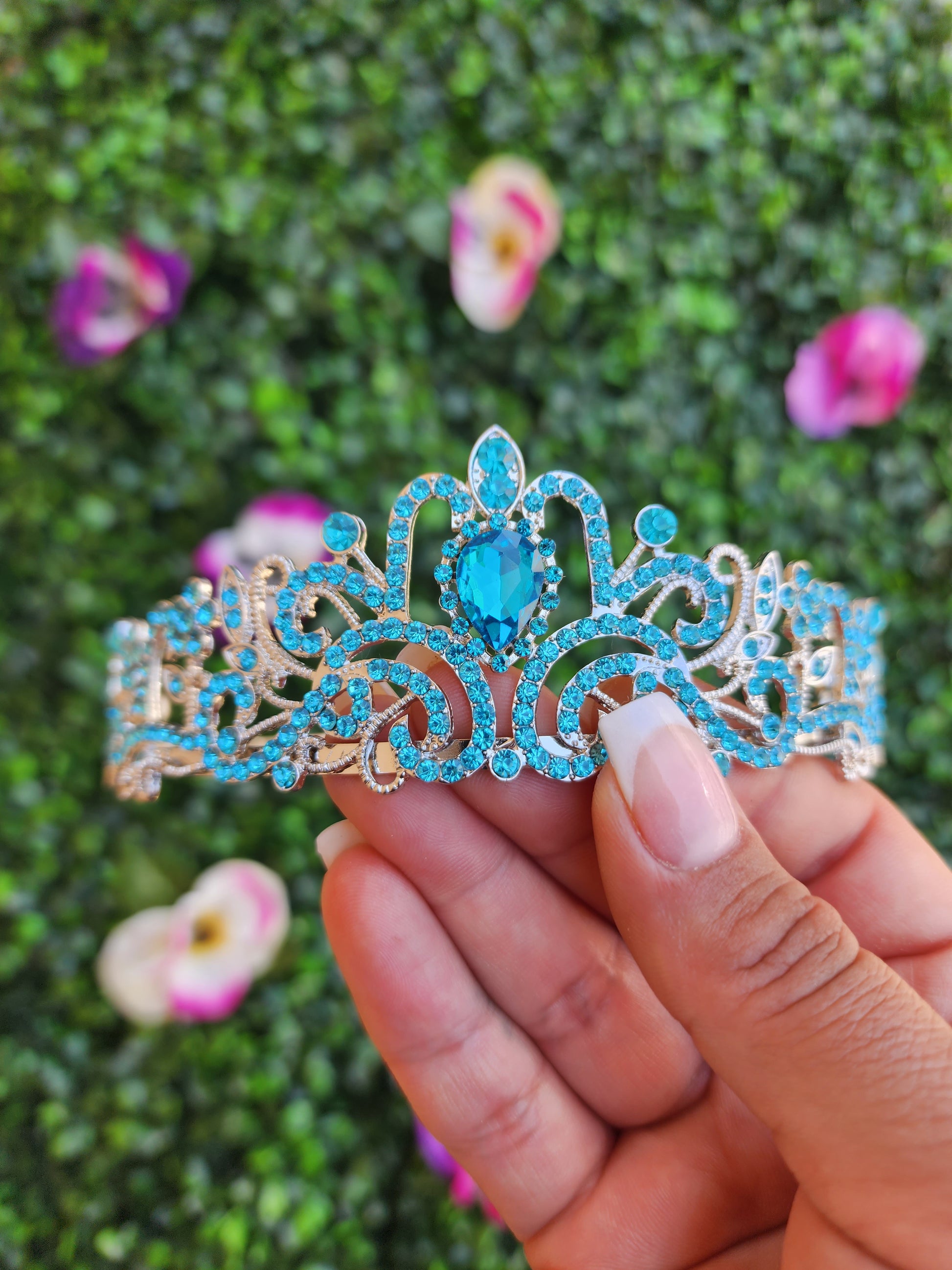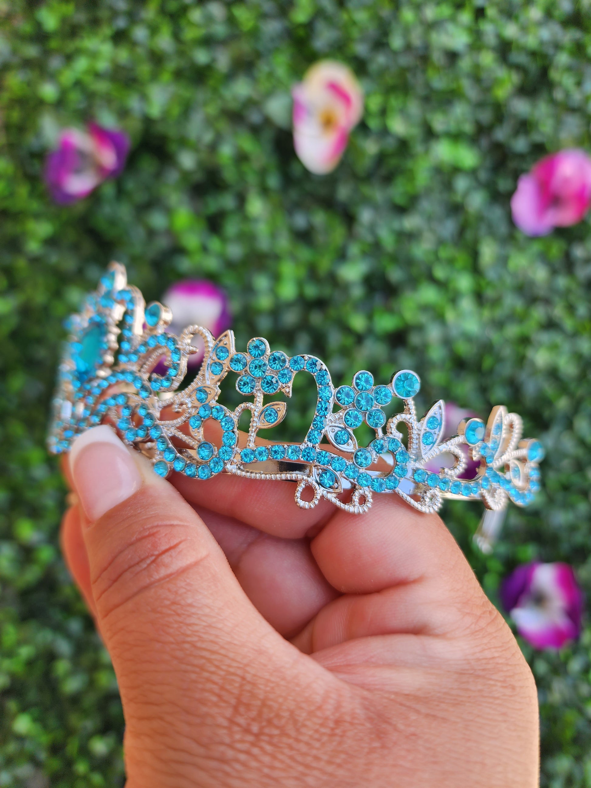 This kids' size teal tiara with hair combs is a charming and delightful headpiece designed to make young ones feel like little royalty. This adorable tiara is crafted for children and combines the whimsical appeal of teal and silver.