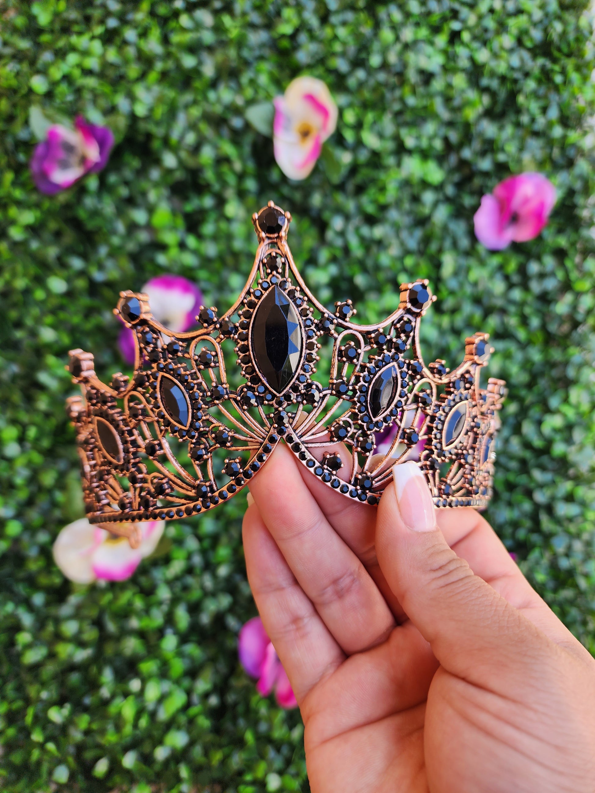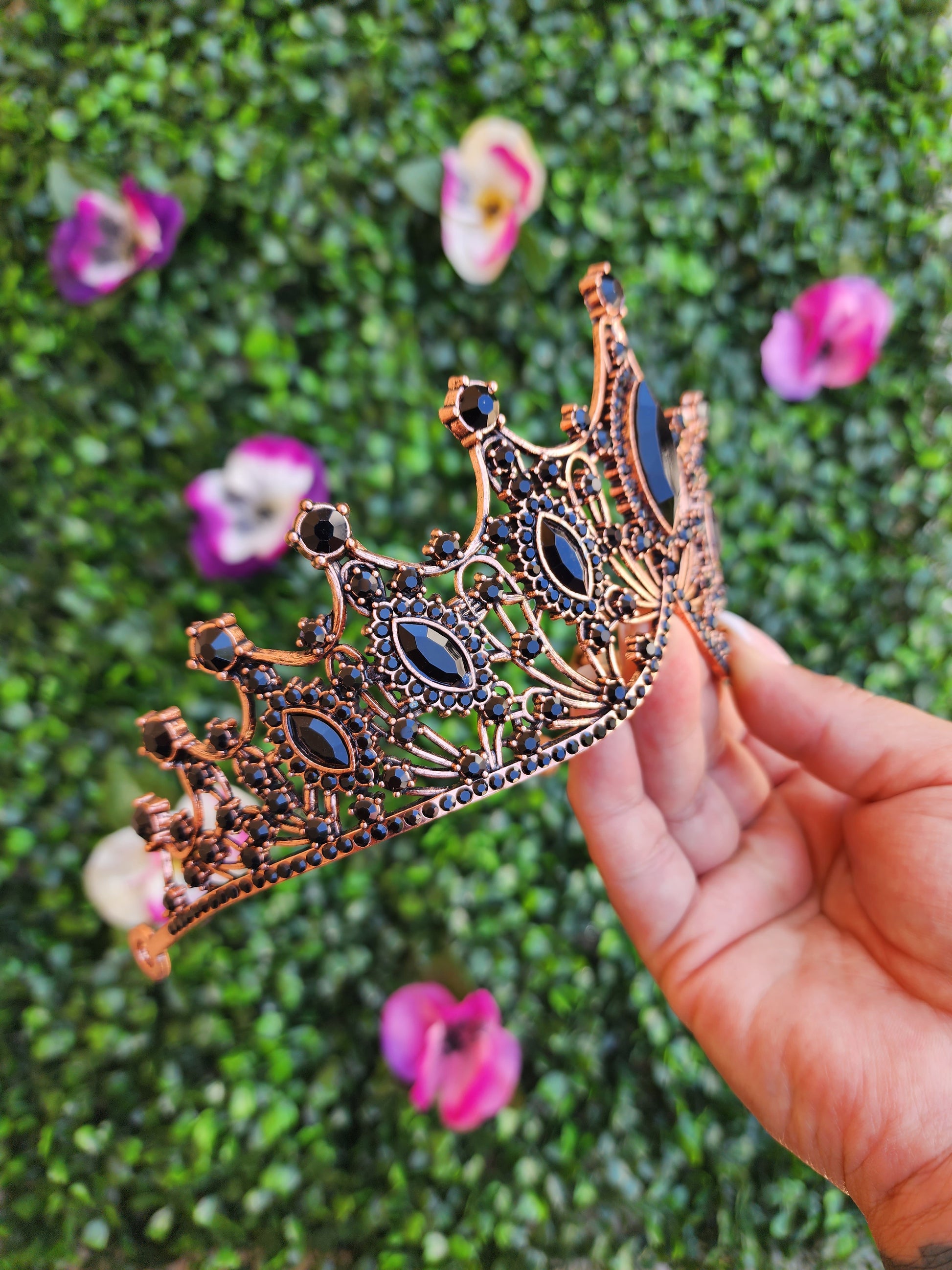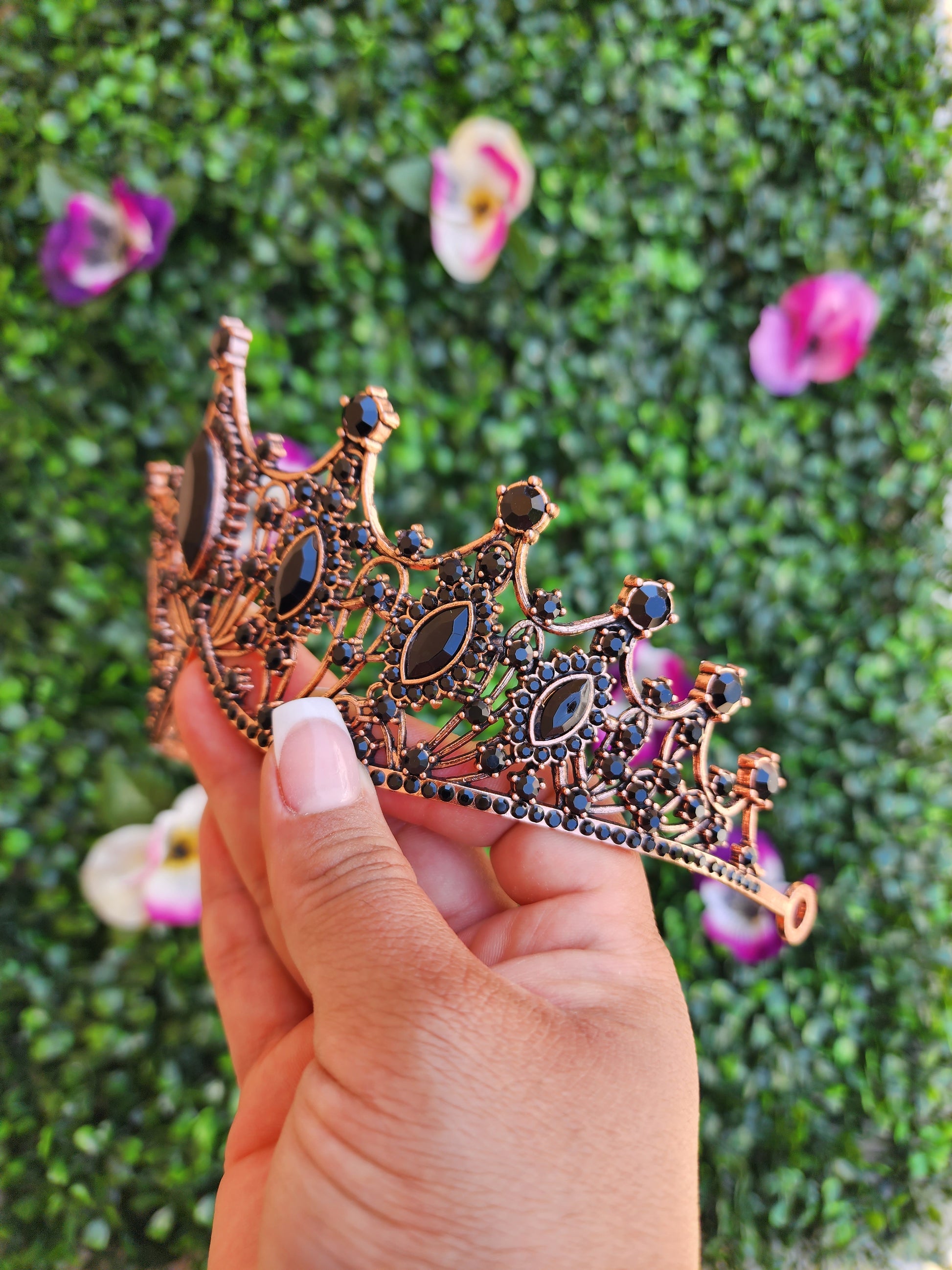 This rose gold and black tiara is a captivating and enchanting headpiece that beautifully combines the timeless elegance of rose gold with black. This tiara gives a sense of sophistication and natural beauty, making it a striking accessory for various special occasions.