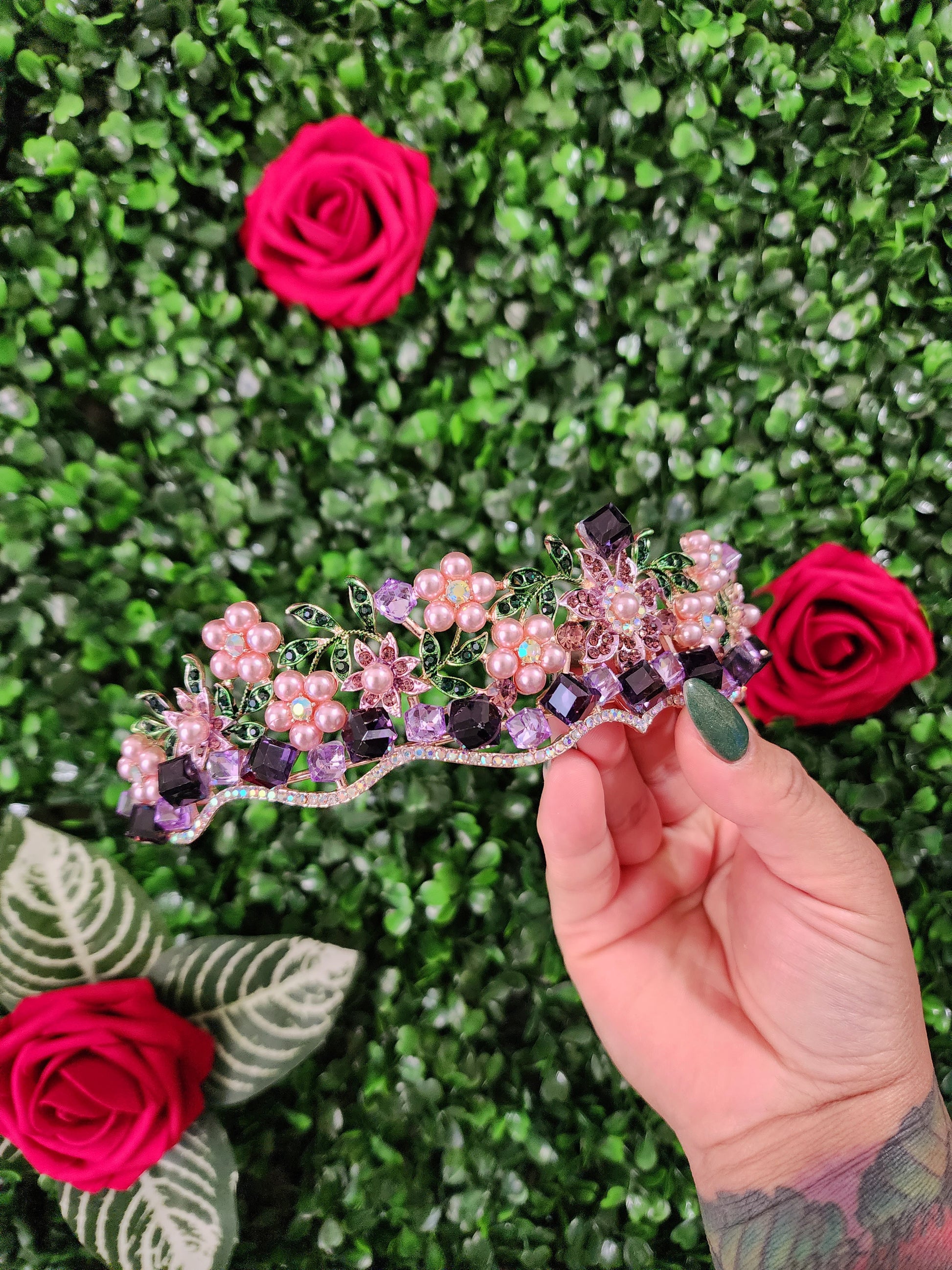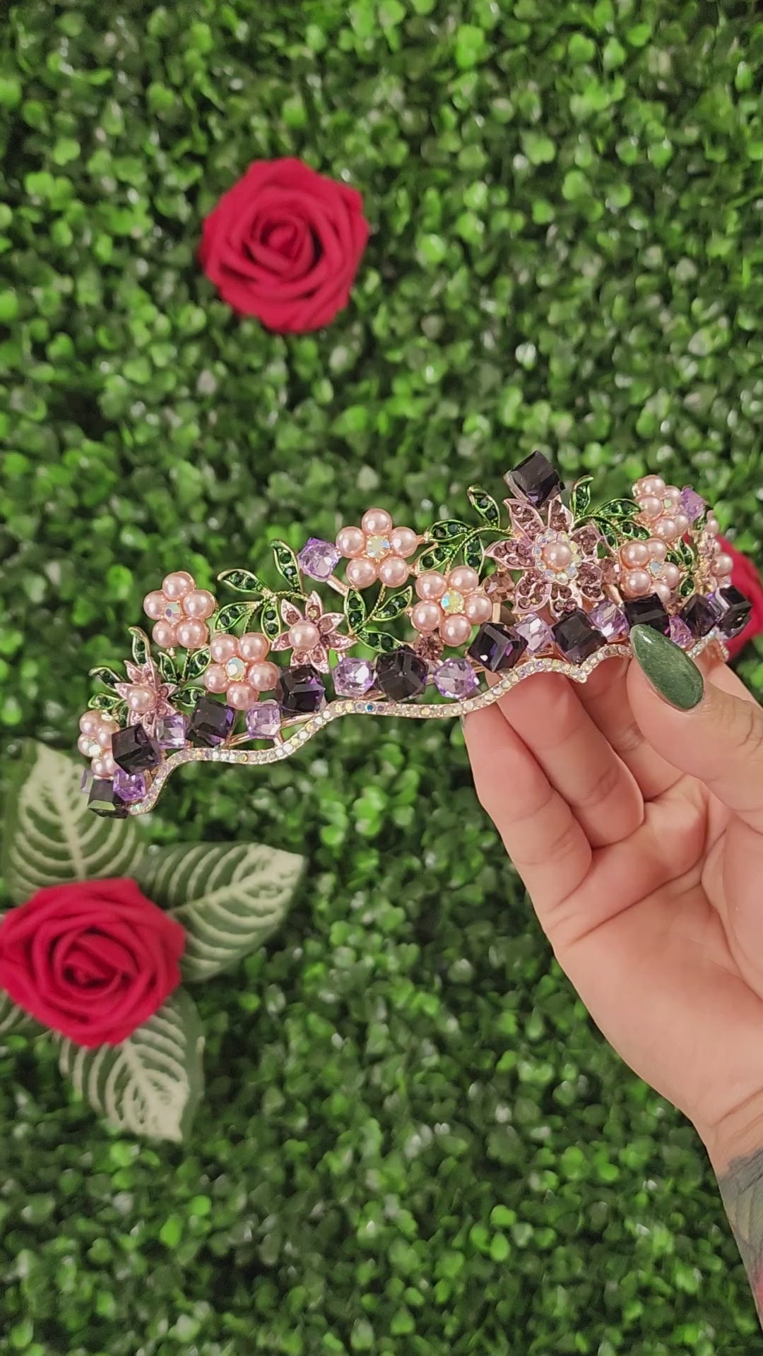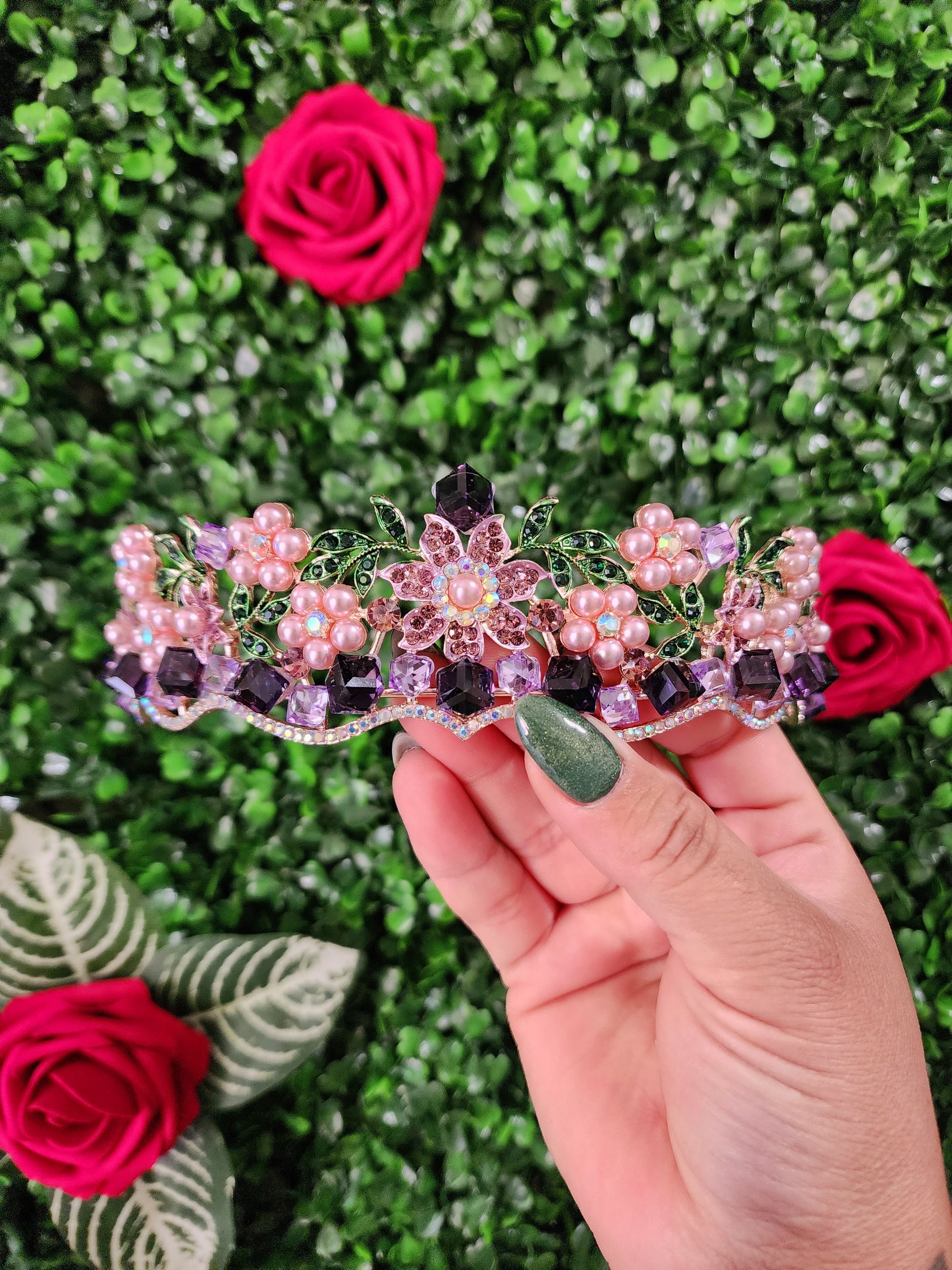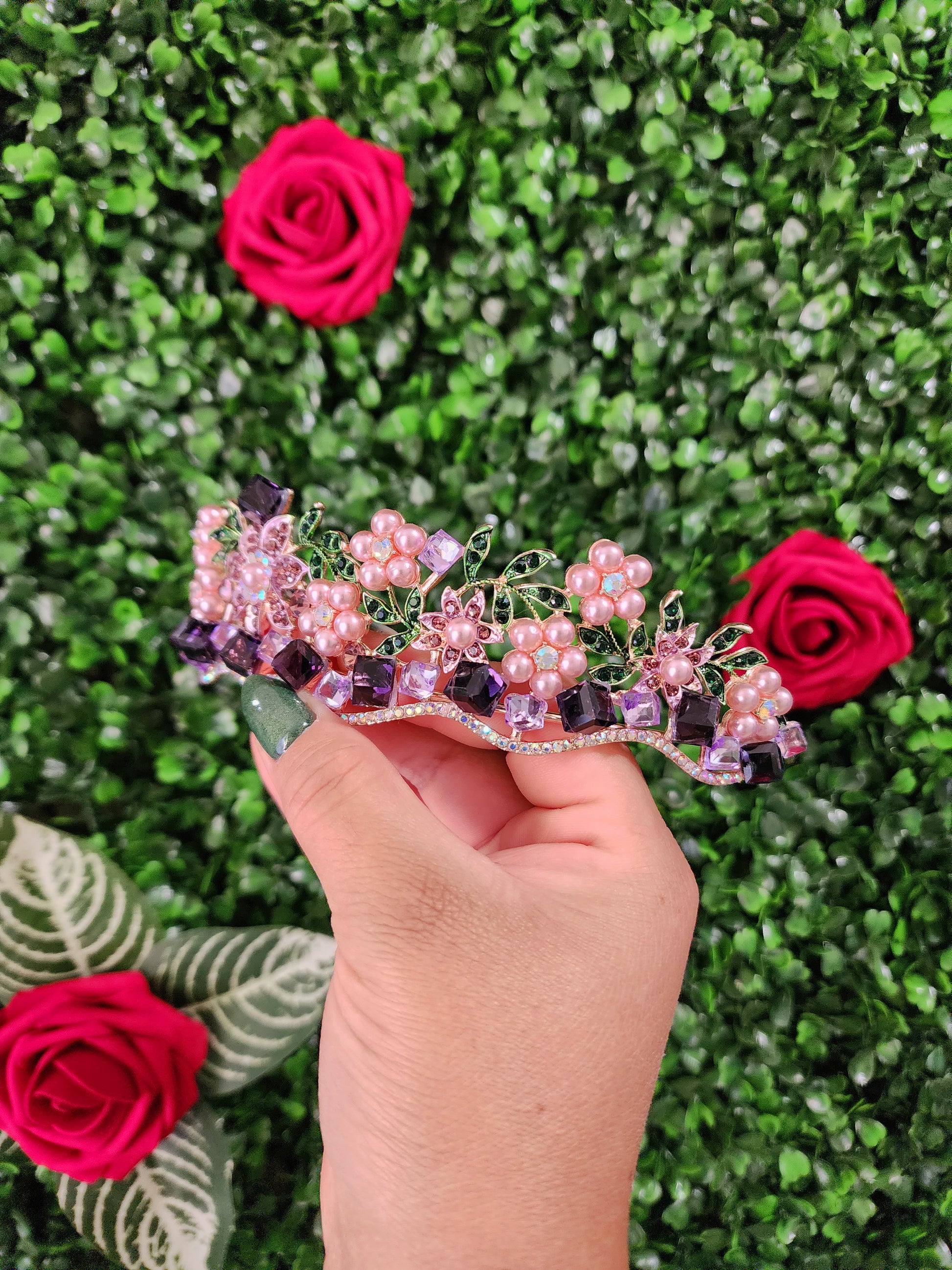 A tiara with a floral design and faux pearls is an exquisite and romantic headpiece that encapsulates the beauty of nature and the allure of classic elegance. This tiara is a stunning accessory that combines lilac rhinestones in floral pattern and faux pearls arranged in a flower