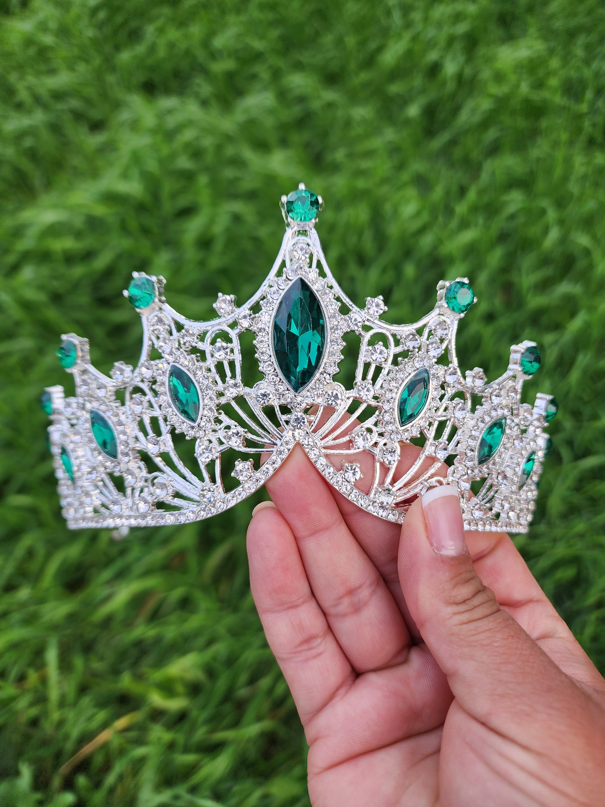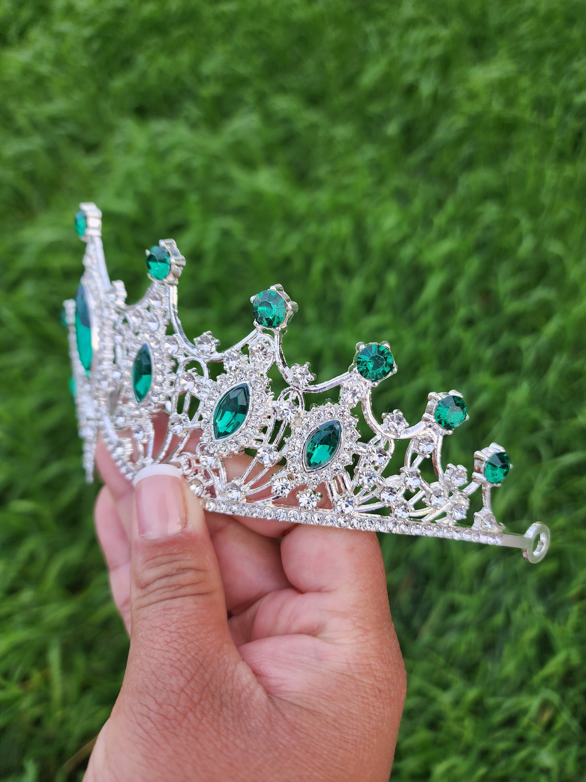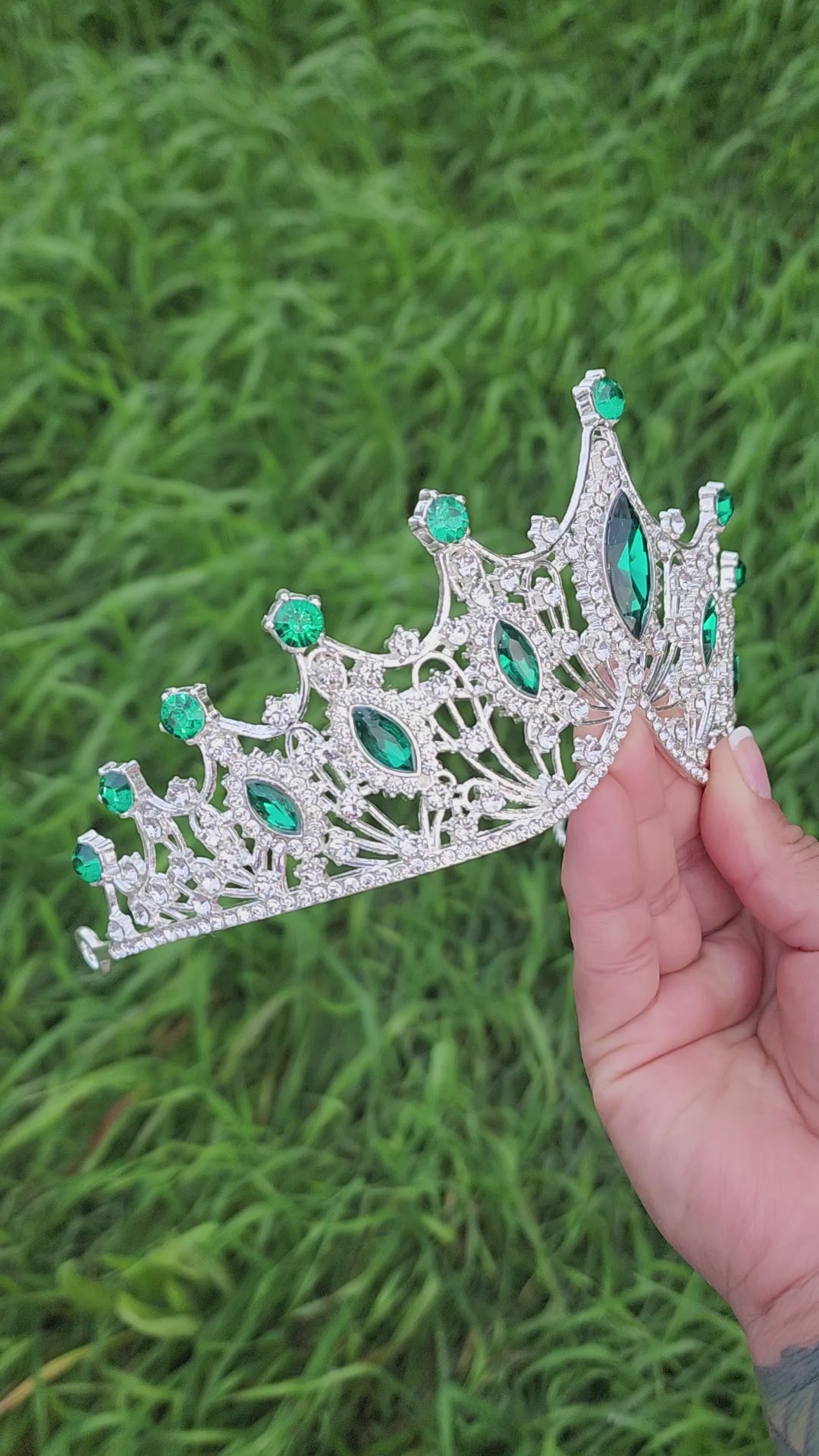 This silver and green tiara is a captivating and enchanting headpiece that beautifully combines the timeless elegance of silver with refreshing and vibrant greenr. This tiara gives a sense of sophistication and natural beauty, making it a striking accessory for various special occasions.