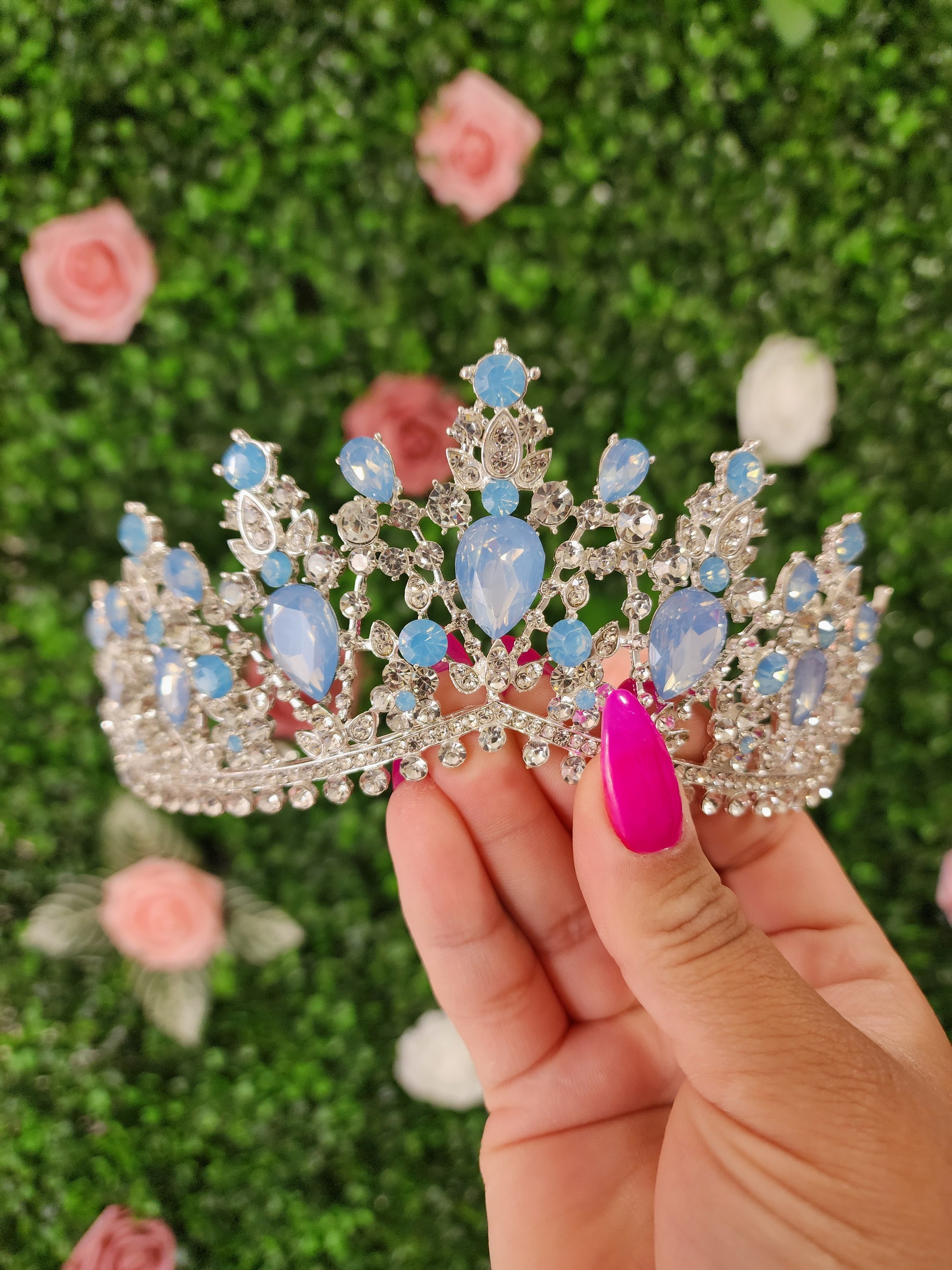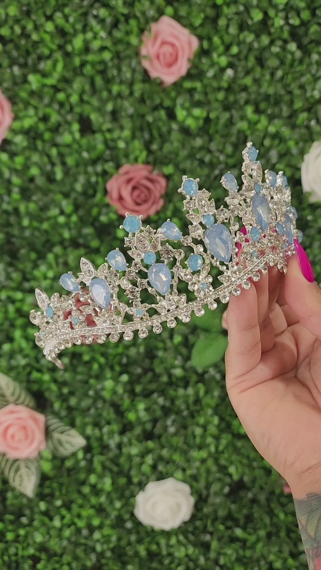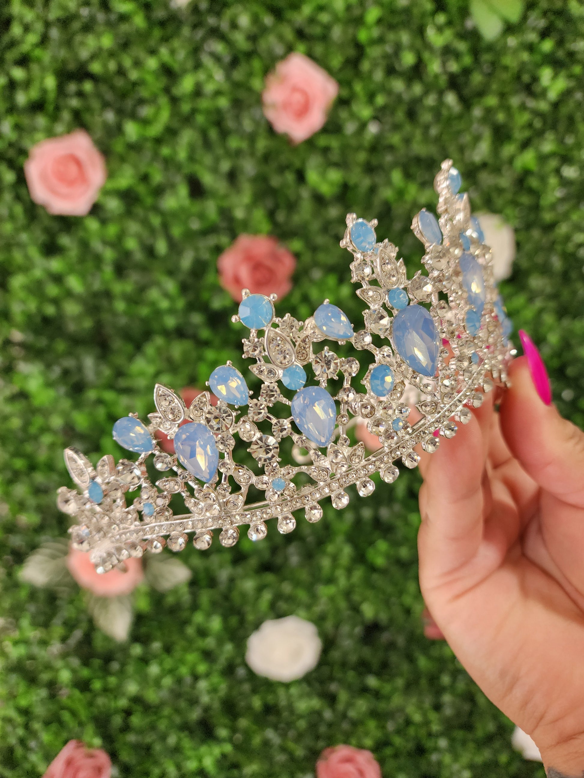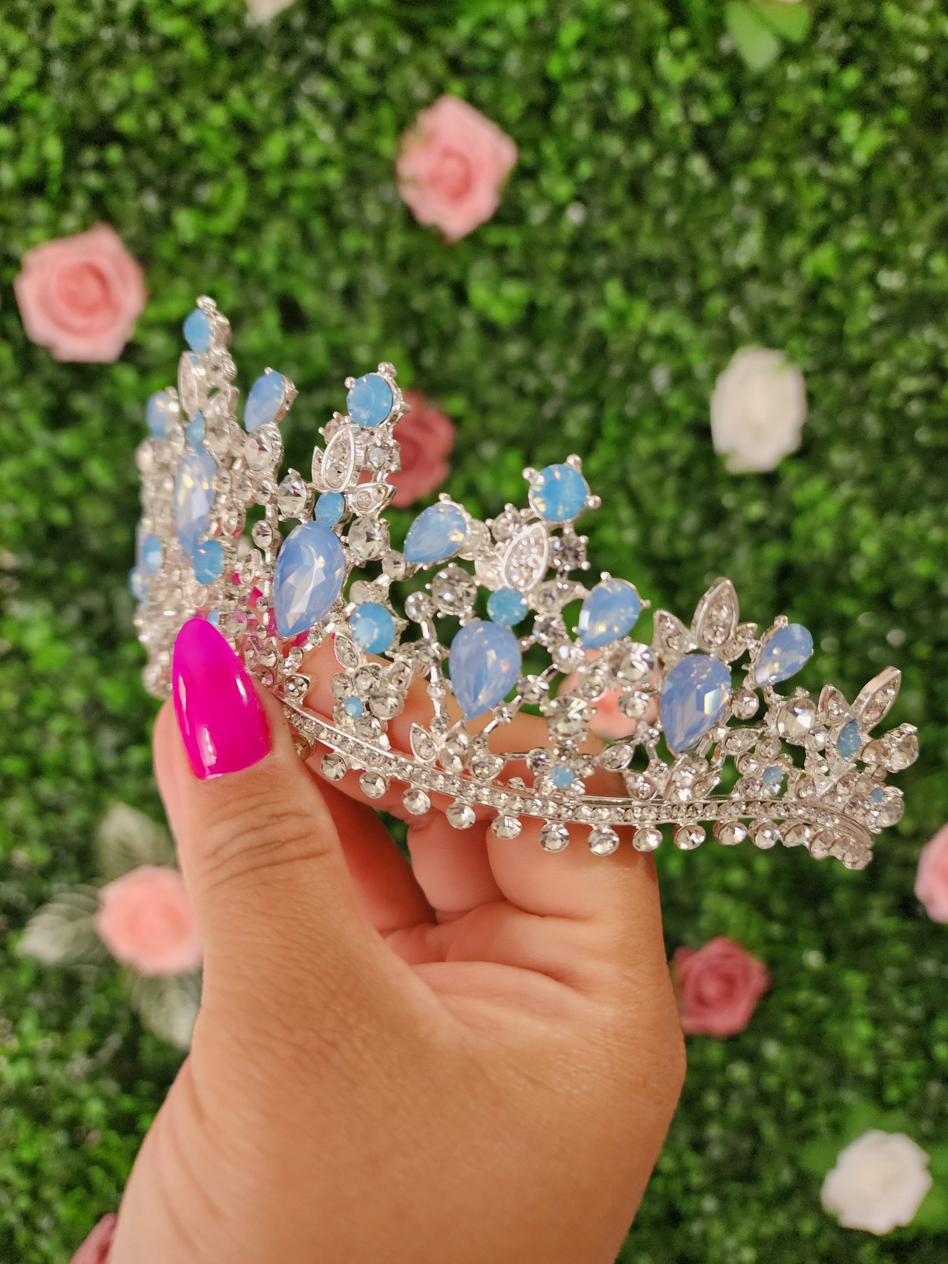 Evoke a sense of ethereal beauty with this silver tiara adorned with shimmering silver and light blue rhinestones. Capturing the essence of elegance and grace, this enchanting accessory adds a touch of celestial charm to any occasion, illuminating your presence with every step.