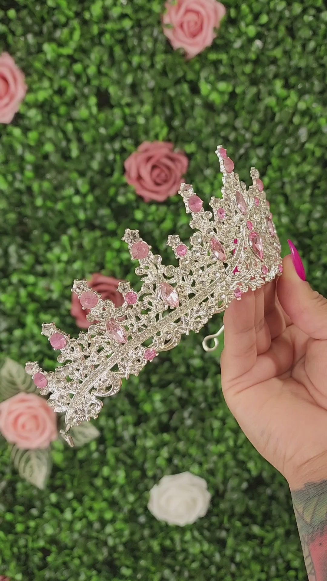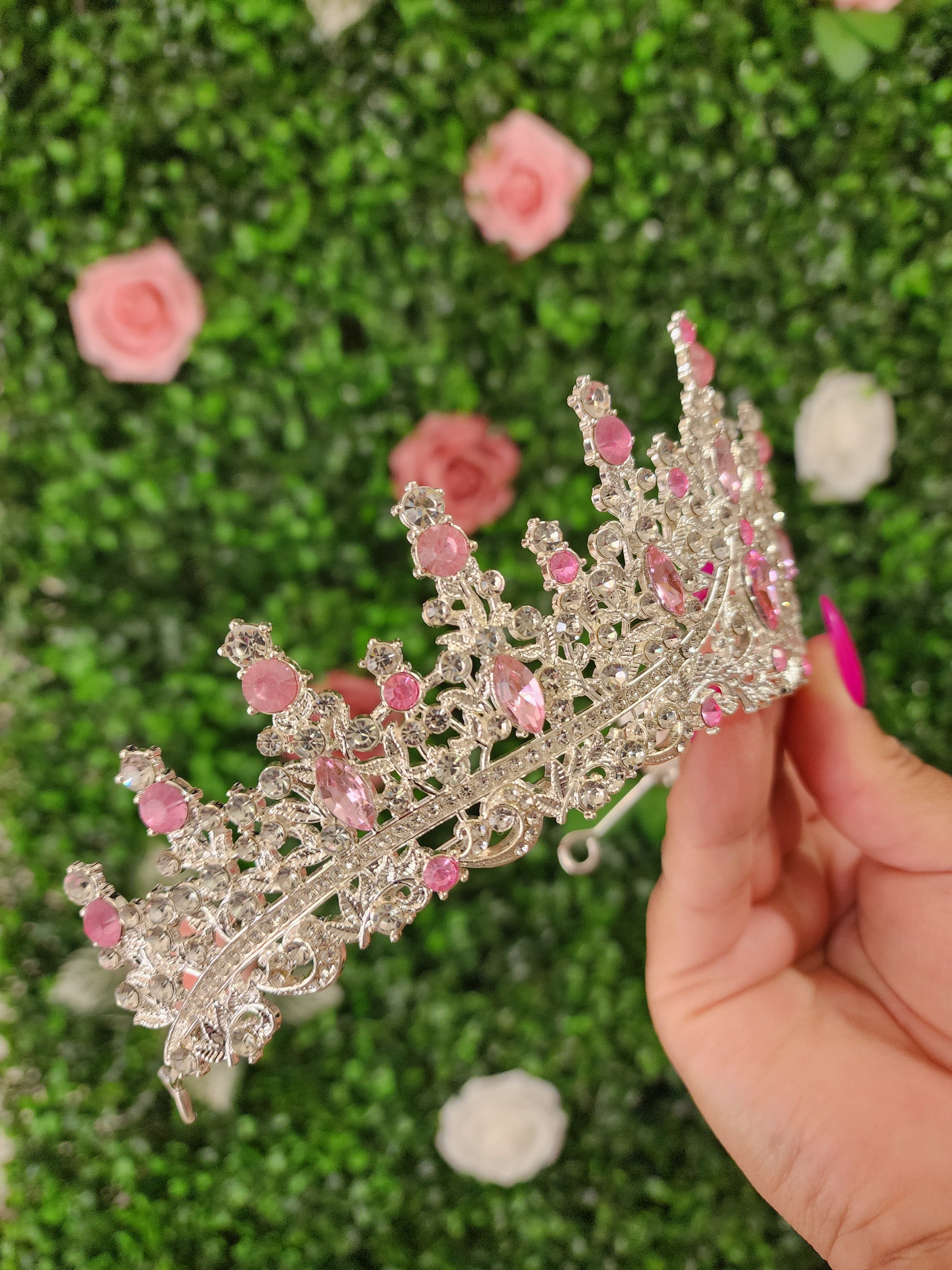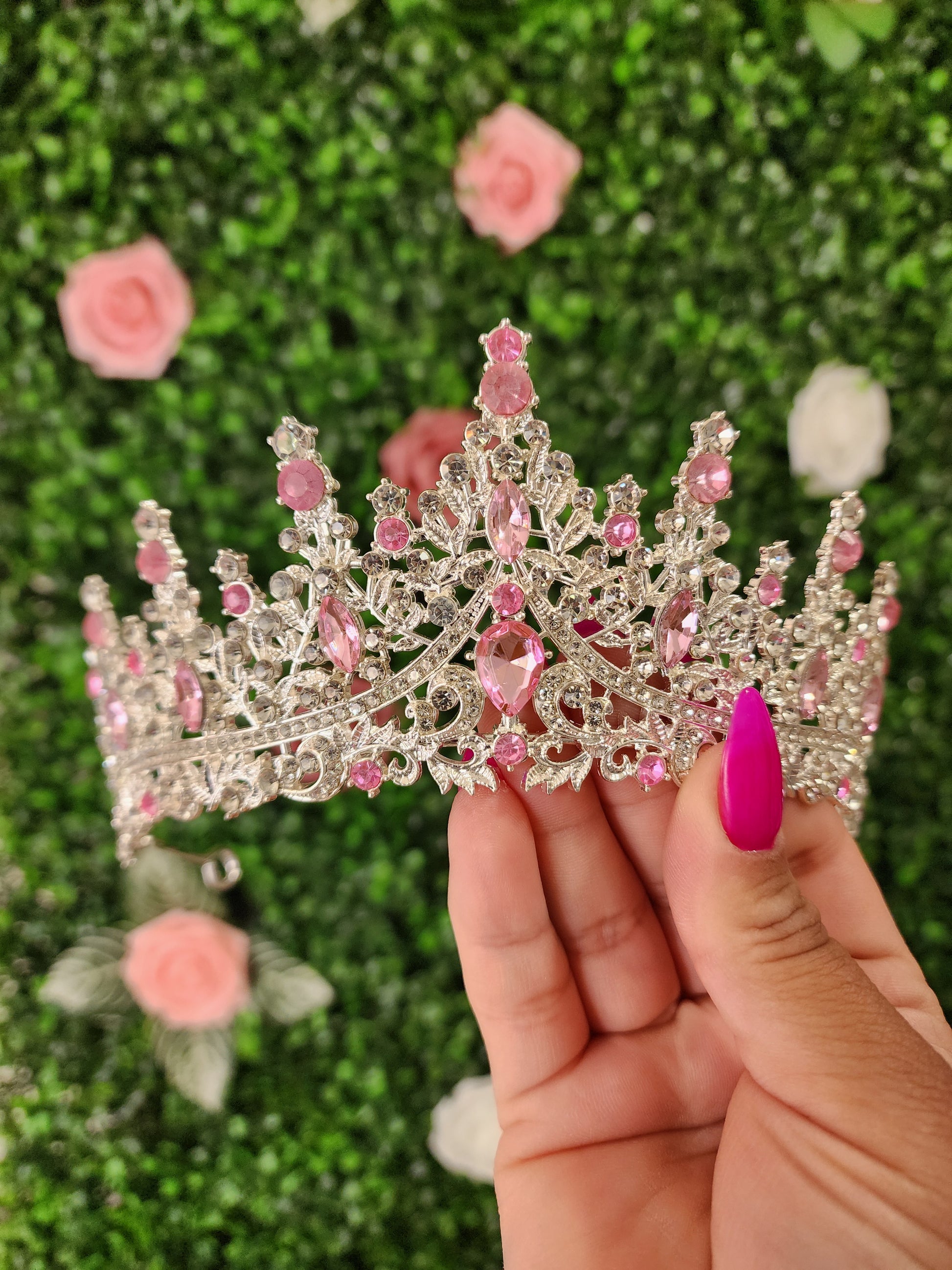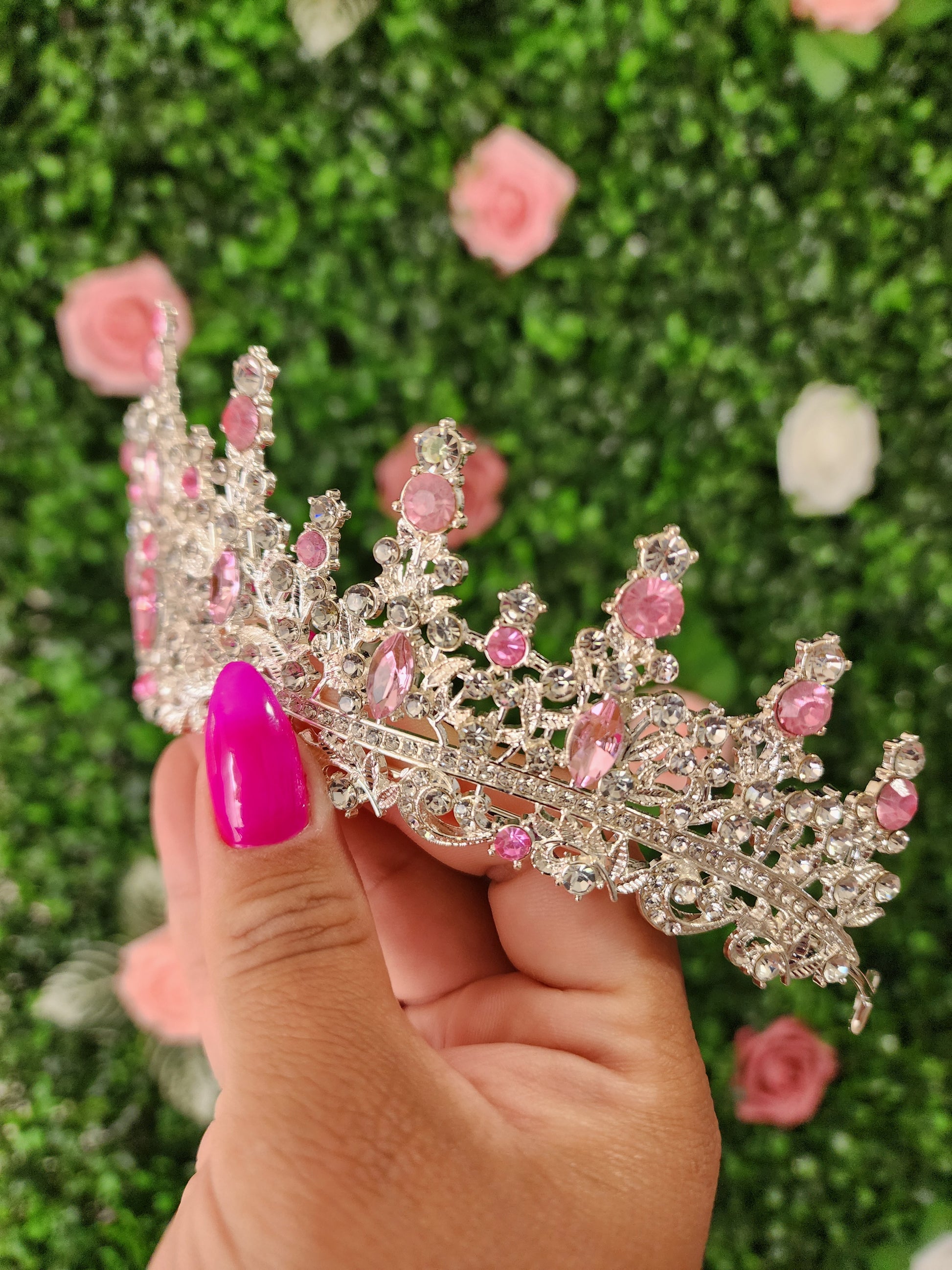 This gorgeous silver tiara is adorned with pink rhinestones that sparkle and shine in the light. The intricate design is perfect for any special occasion and will make you feel like a princess. The silver finish and intricate details of the tiara give it a timeless and luxurious look that is sure to make heads turn and draw admiration. With this stunning tiara you will be sure to dazzle and take center stage in any event.