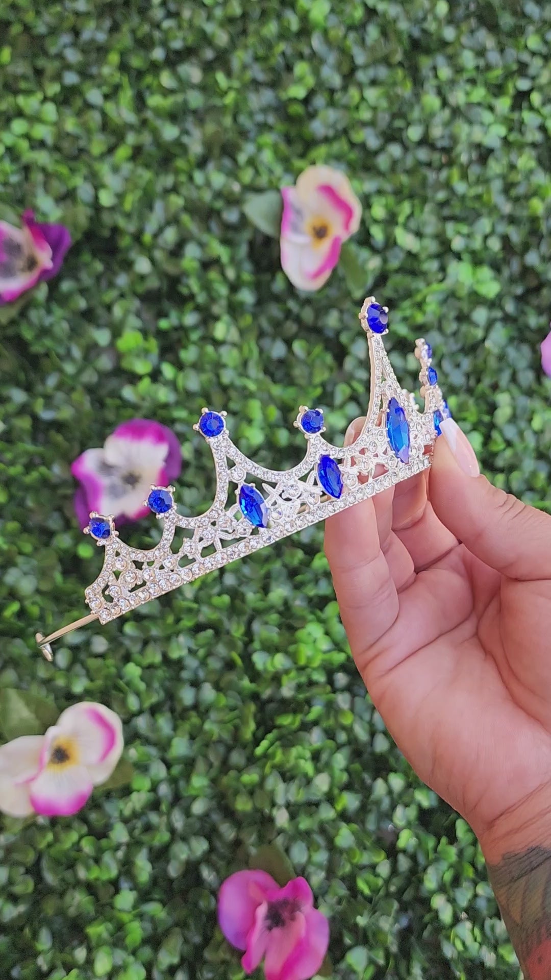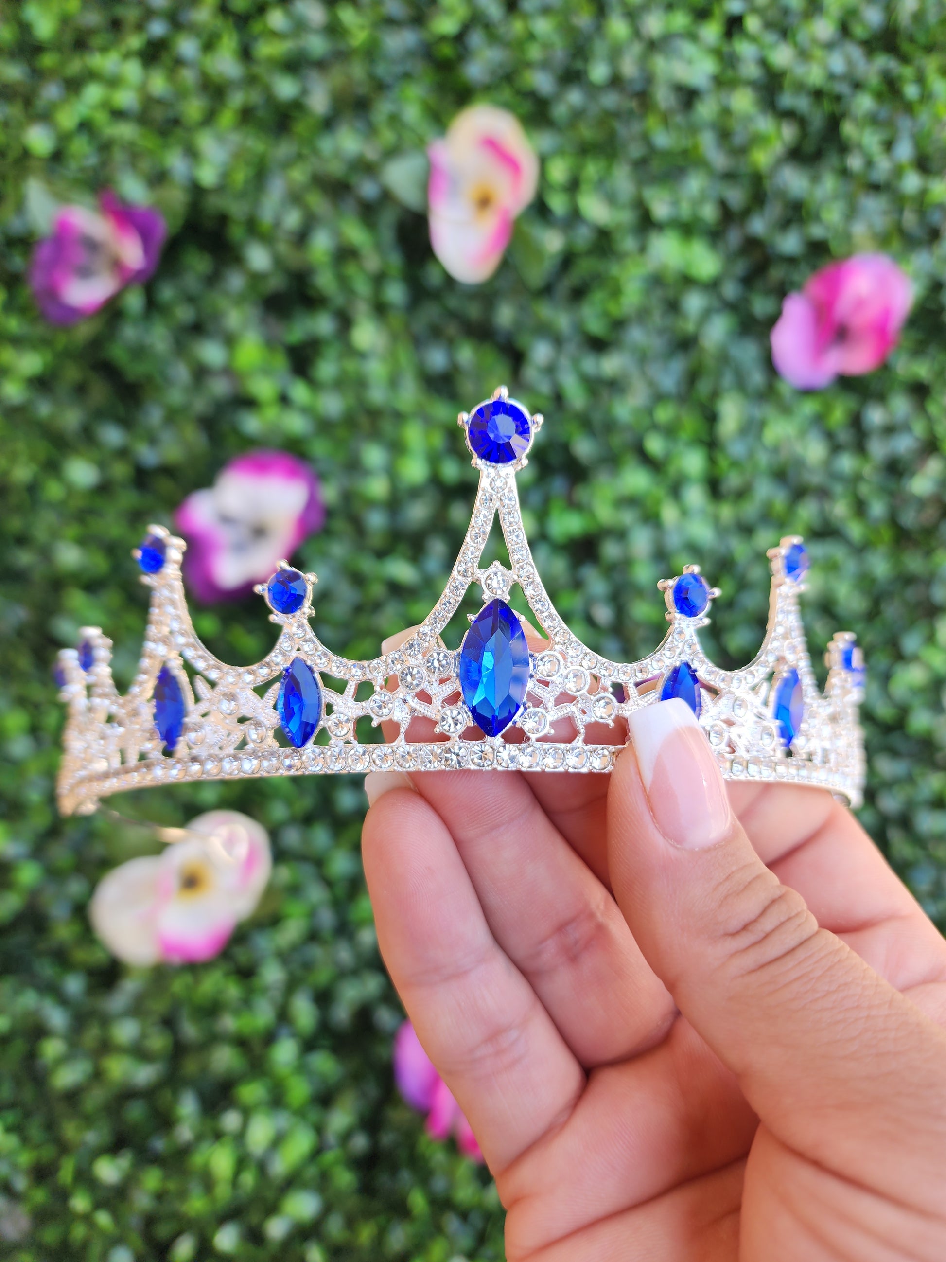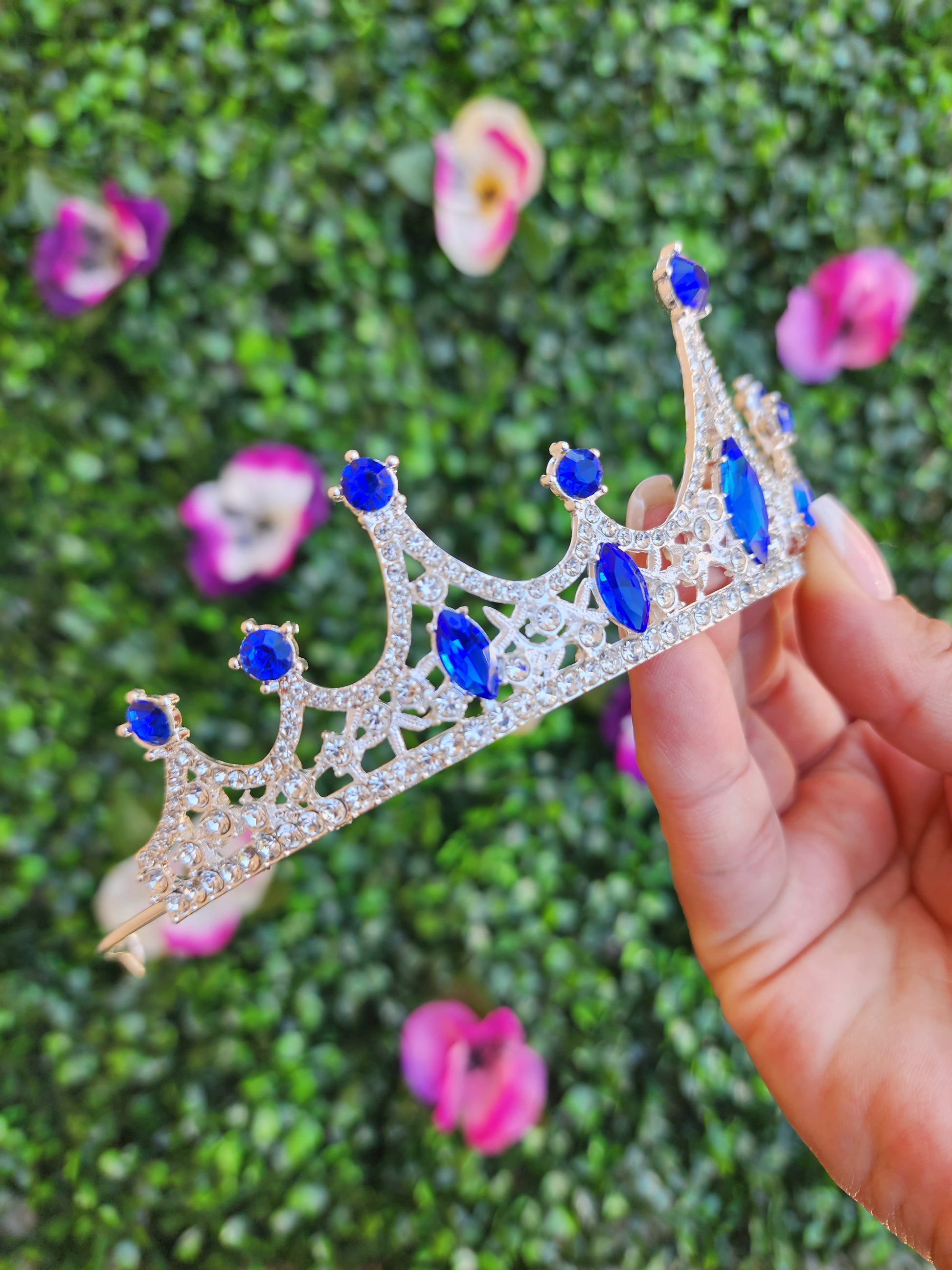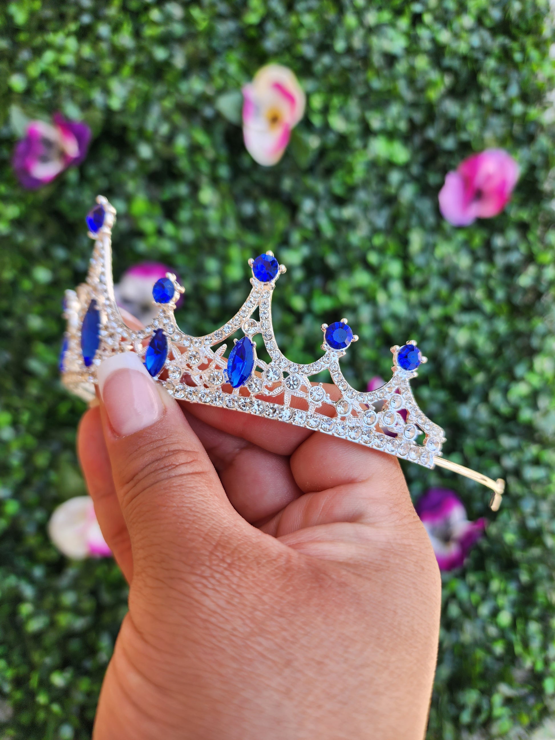 Delicate and dainty, this silver tiara is a perfect accessory for any regal look. This delicate accessory features a sleek metal frame adorned with blue and silver rhinestones.