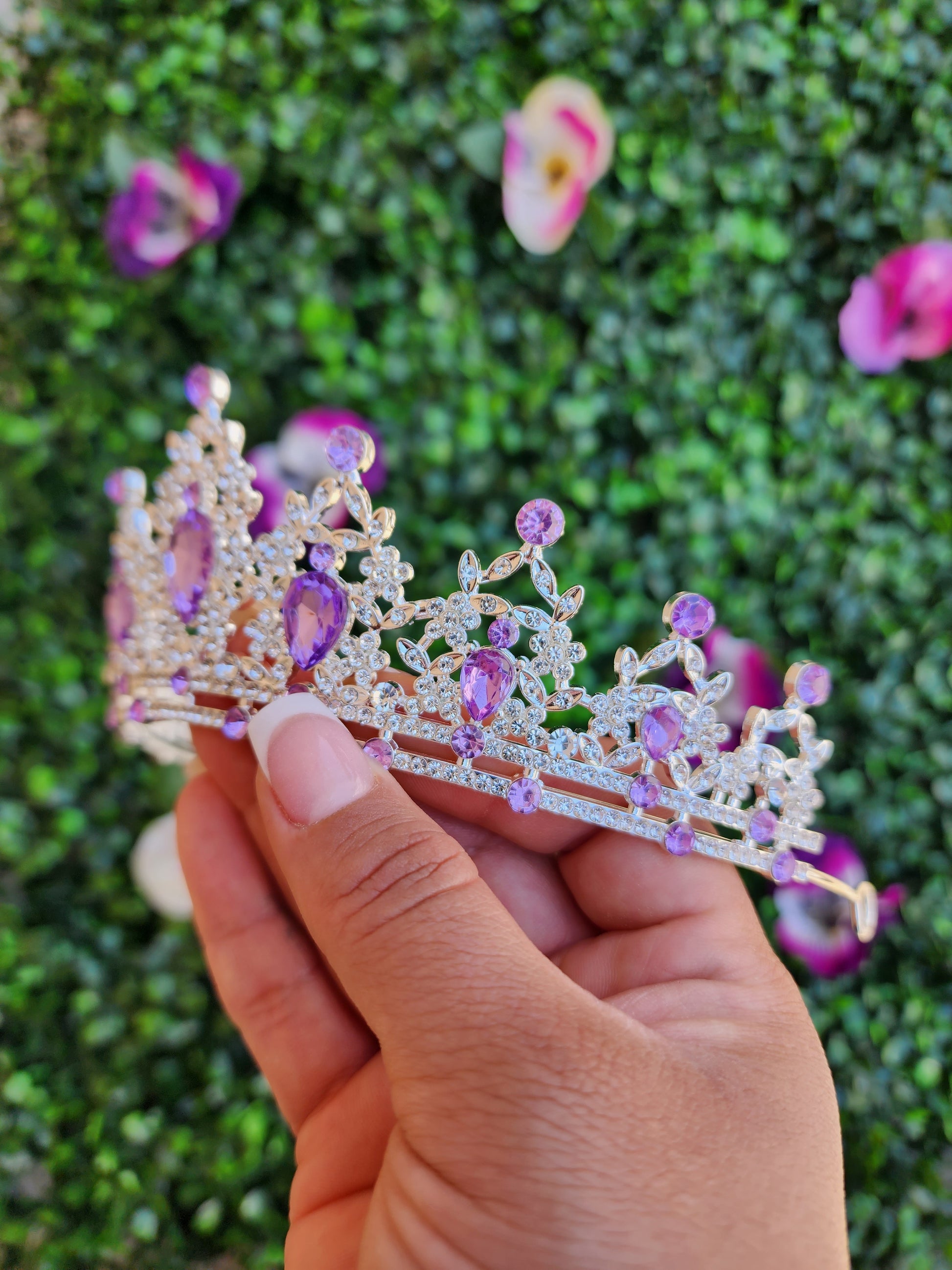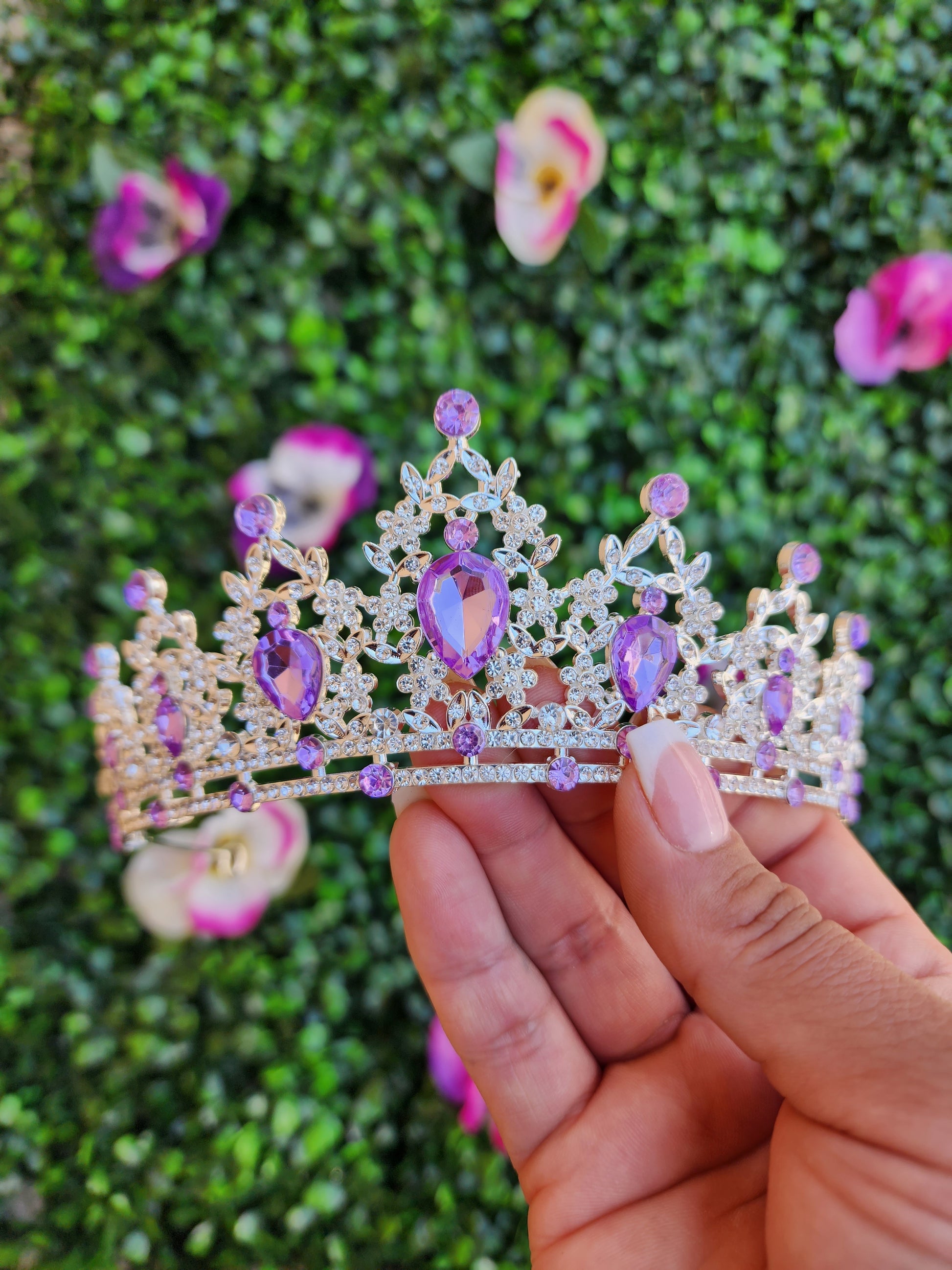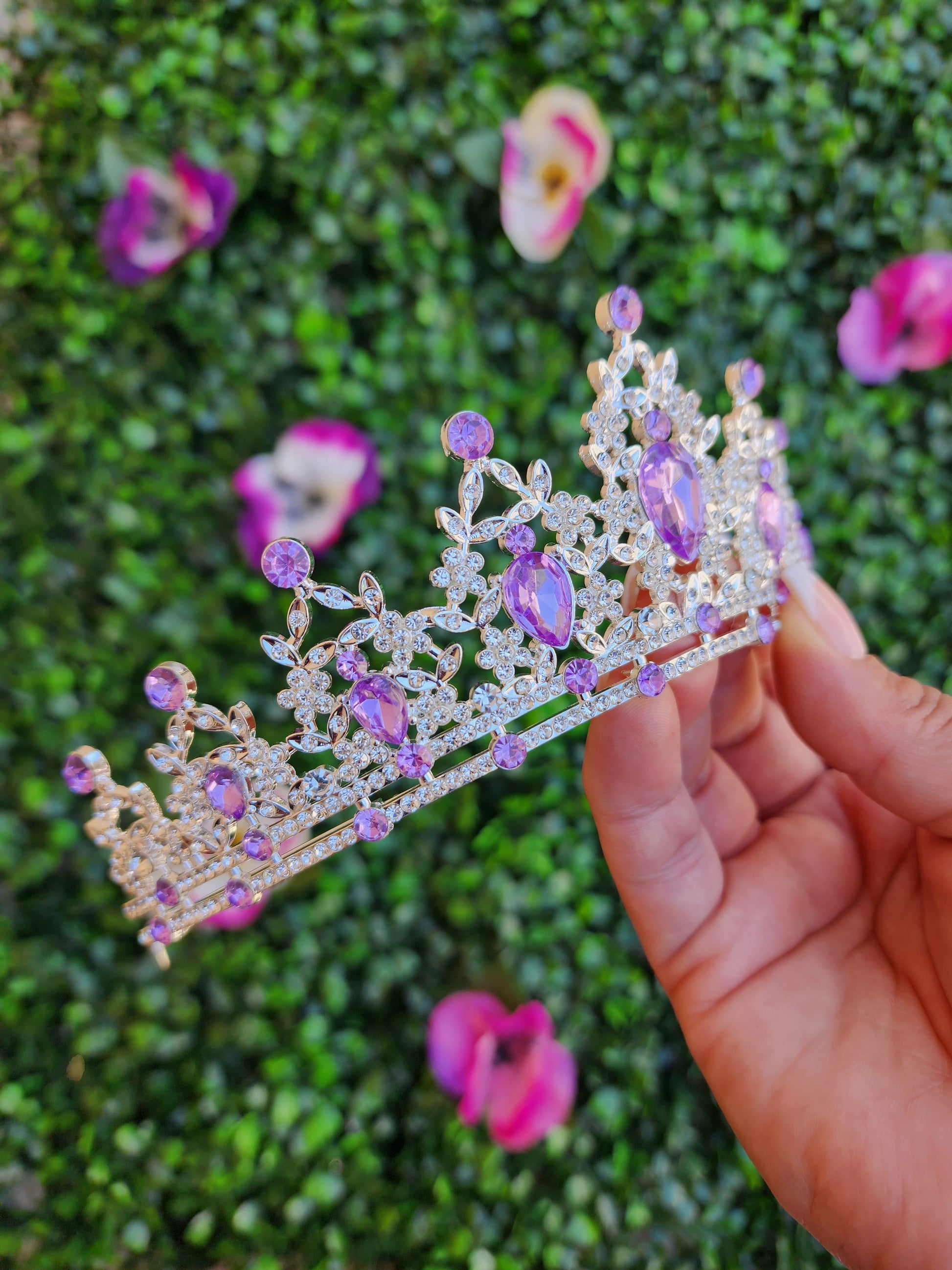 A silver and lilac tiara is a captivating and regal headpiece that combines the timeless beauty of silver with the tranquil and majestic lilac. This exquisite tiara exudes a sense of sophistication and serenity, making it a perfect accessory for various special occasions.