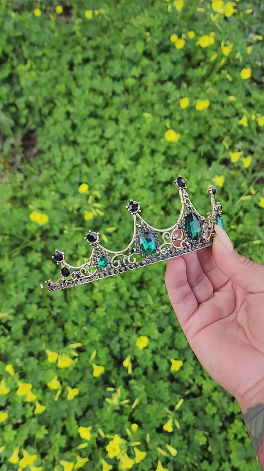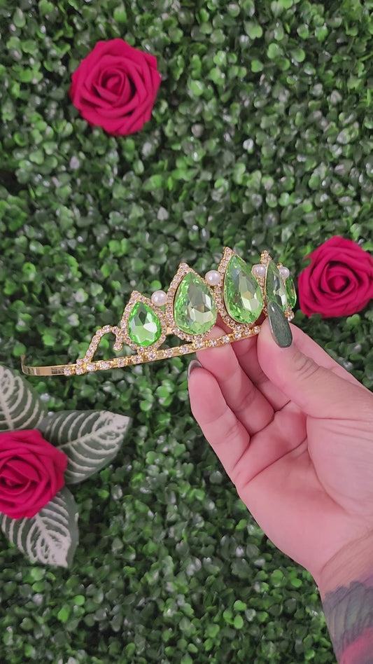Gold Tiara with Lime Green & Silver Rhinestone and Faux Pearls (251)