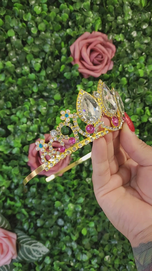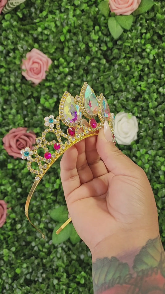 Gold Tiara with Silver & Iridescent Rhinestone and Faux Pearls (258)